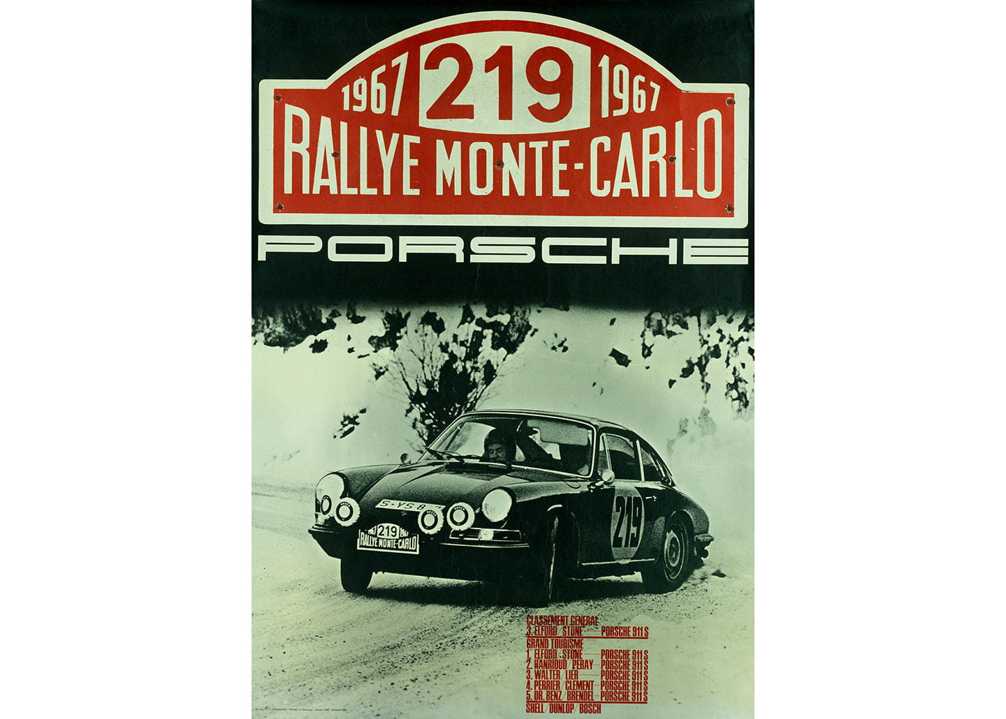 En este cartel del Rallye de Monte-Carlo de 1967 ya vemos al Porsche 911 en el podio, que encadenaría tres victorias consecutivas en los años posteriores.