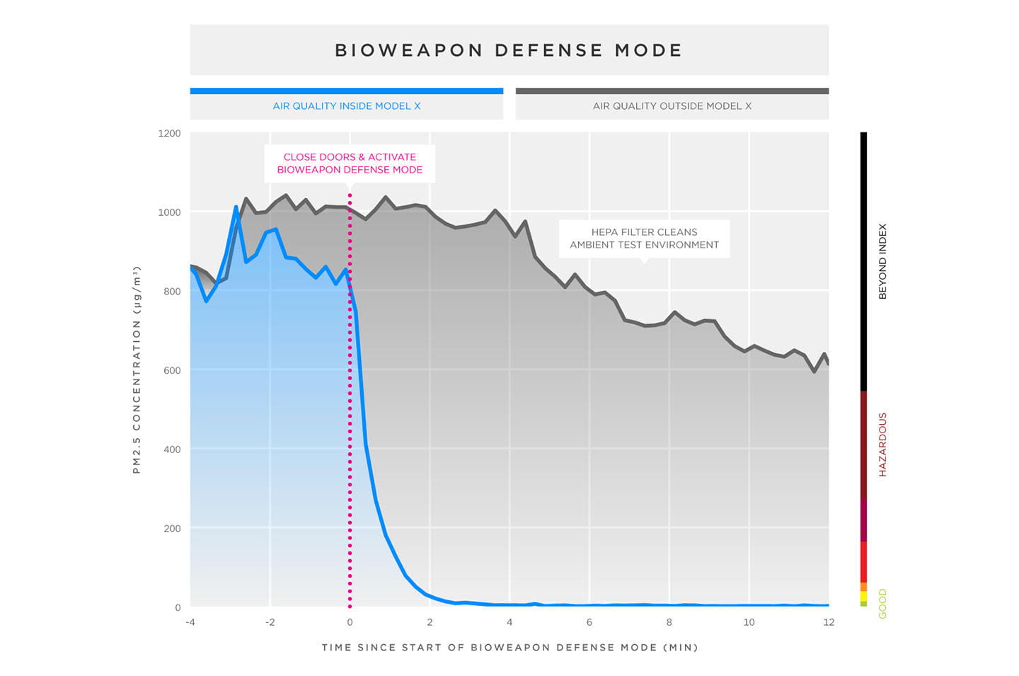 Según Tesla, se procedió a la apertura de puertas de tipo «ala de halcón» del Tesla Model X, para posteriormente cerrarlas, activar el Bioweapon Defense Mode y comprobar que la regeneración del habitáculo consiguió que esa concentración se redujera hasta límites insignificantes, en que los aparatos de medición eran incapaces de obtener concentraciones relevantes. Ese proceso se produciría en tan solo 2 minutos, el tiempo que tardarían el Tesla Model S y el Tesla Model X en regenerar el aire del habitáculo y, por supuesto, evitar la entrada de nuevos contaminantes.