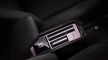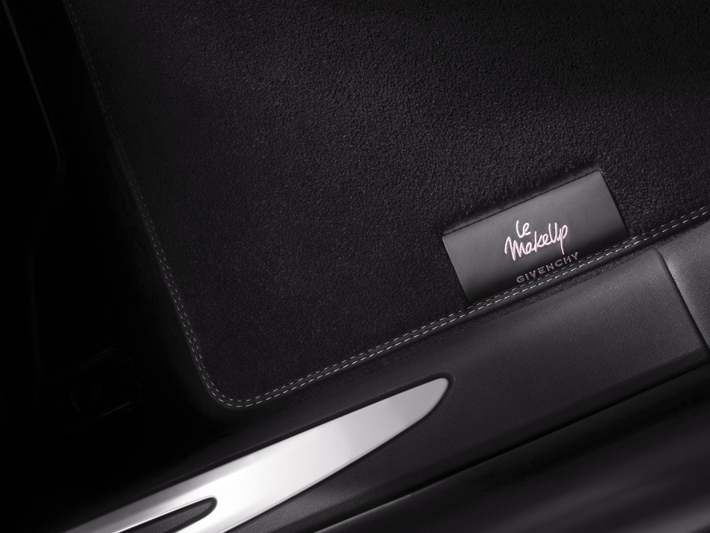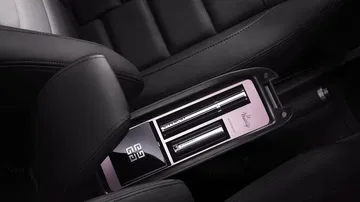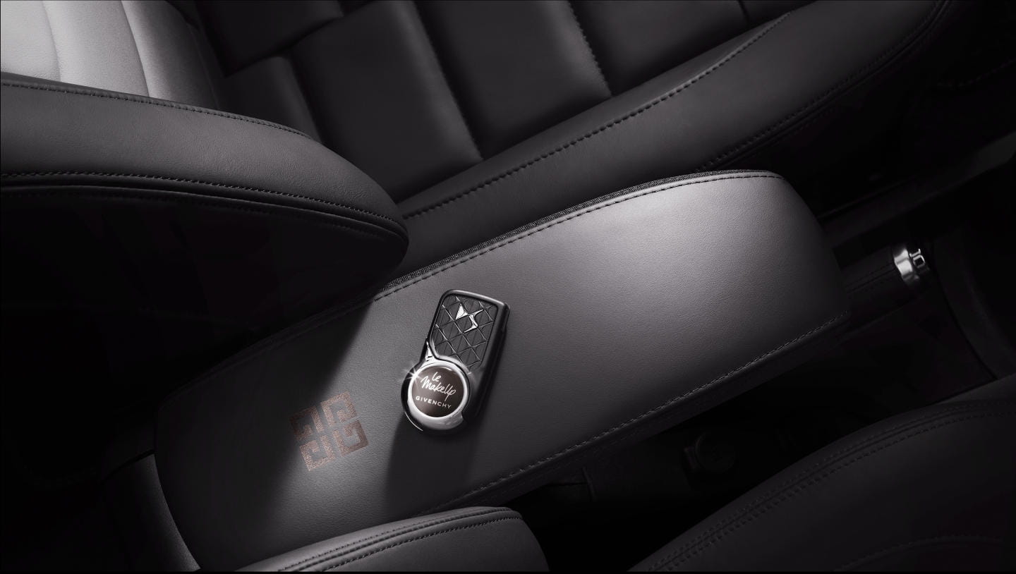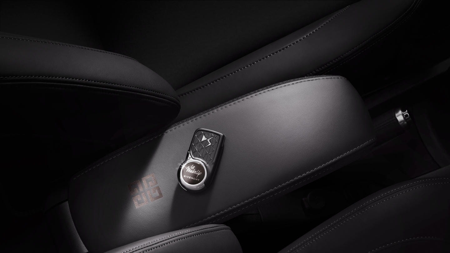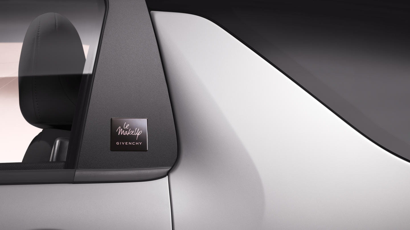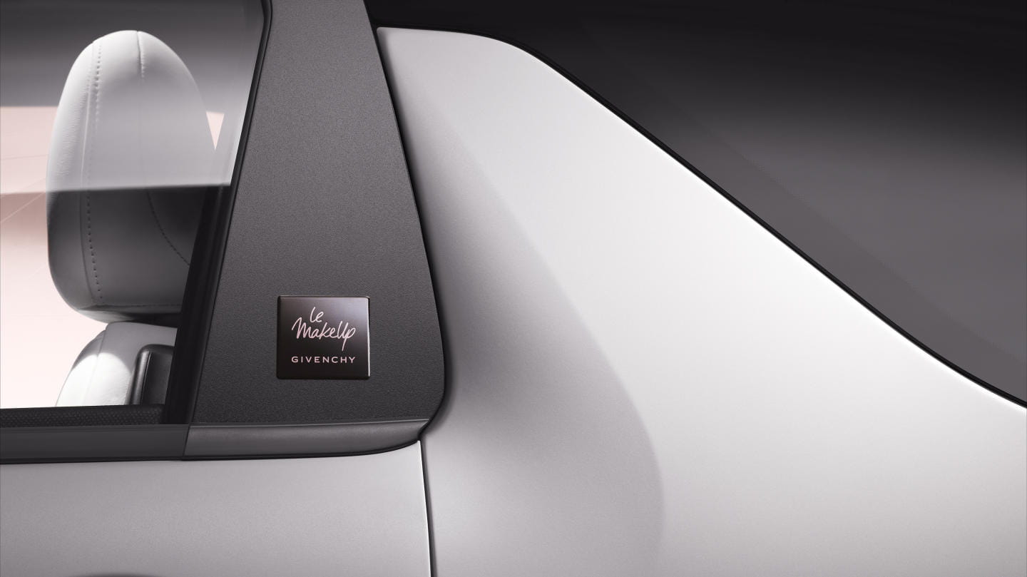En su interior el salpicadero tiene un acabado rosado, encontrándonos con un kit de maquillaje Givenchy bajo el reposabrazos central, acabado en cuero napa y con el emblema de Givenchy. De hecho hay un pintauñas a juego con la pintura Whisper de los retrovisores y el techo. Las alfombrillas también son específicas.