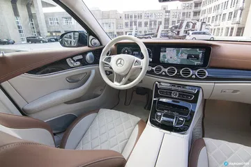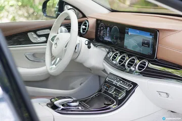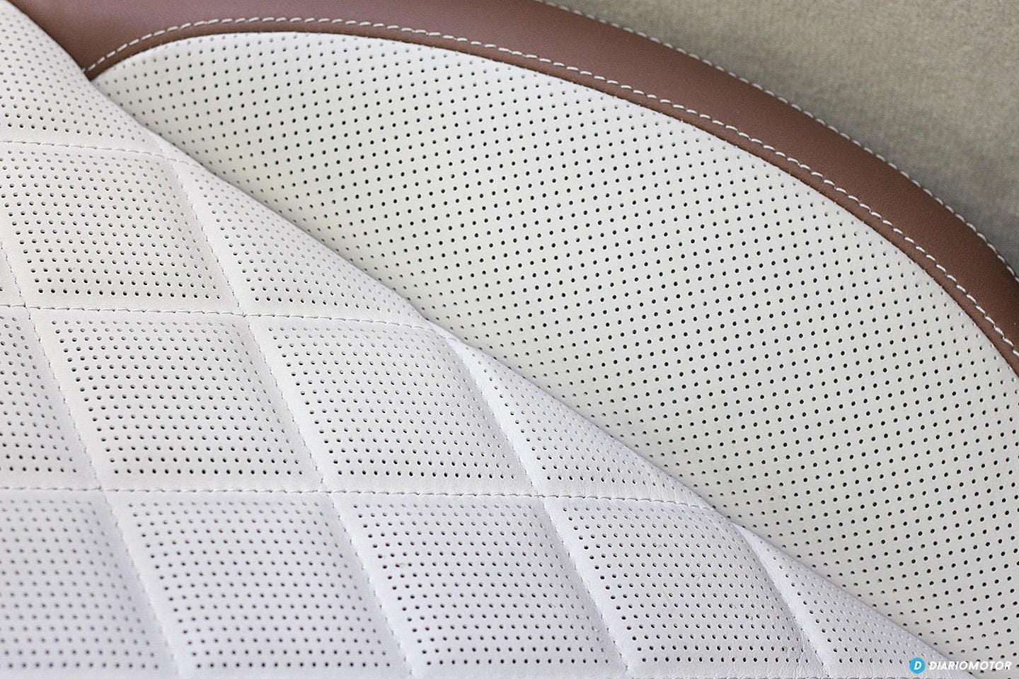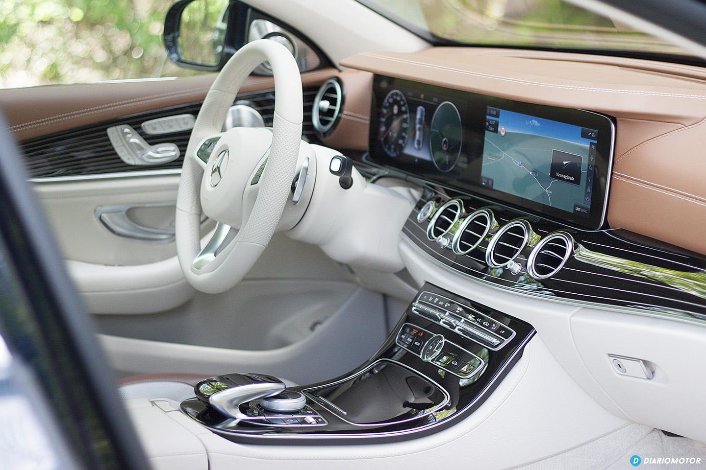 Hemos probado el Mercedes Clase E 220d con el acabado Exclusive y todas las opciones imaginables, con un interior bitono en colores blanco y marrón y unos maravillosos asientos ventilados, calefactados, con masaje y tapizados en piel perforada de primera calidad. Destaca la parte superior del salpicadero tapizada en piel, una banda horizontal que lo recorre en negro piano con líneas que parecen recordar un pentagrama y sobre todo las dos pantallas gigantes que hacen de instrumentación y de pantalla central.
