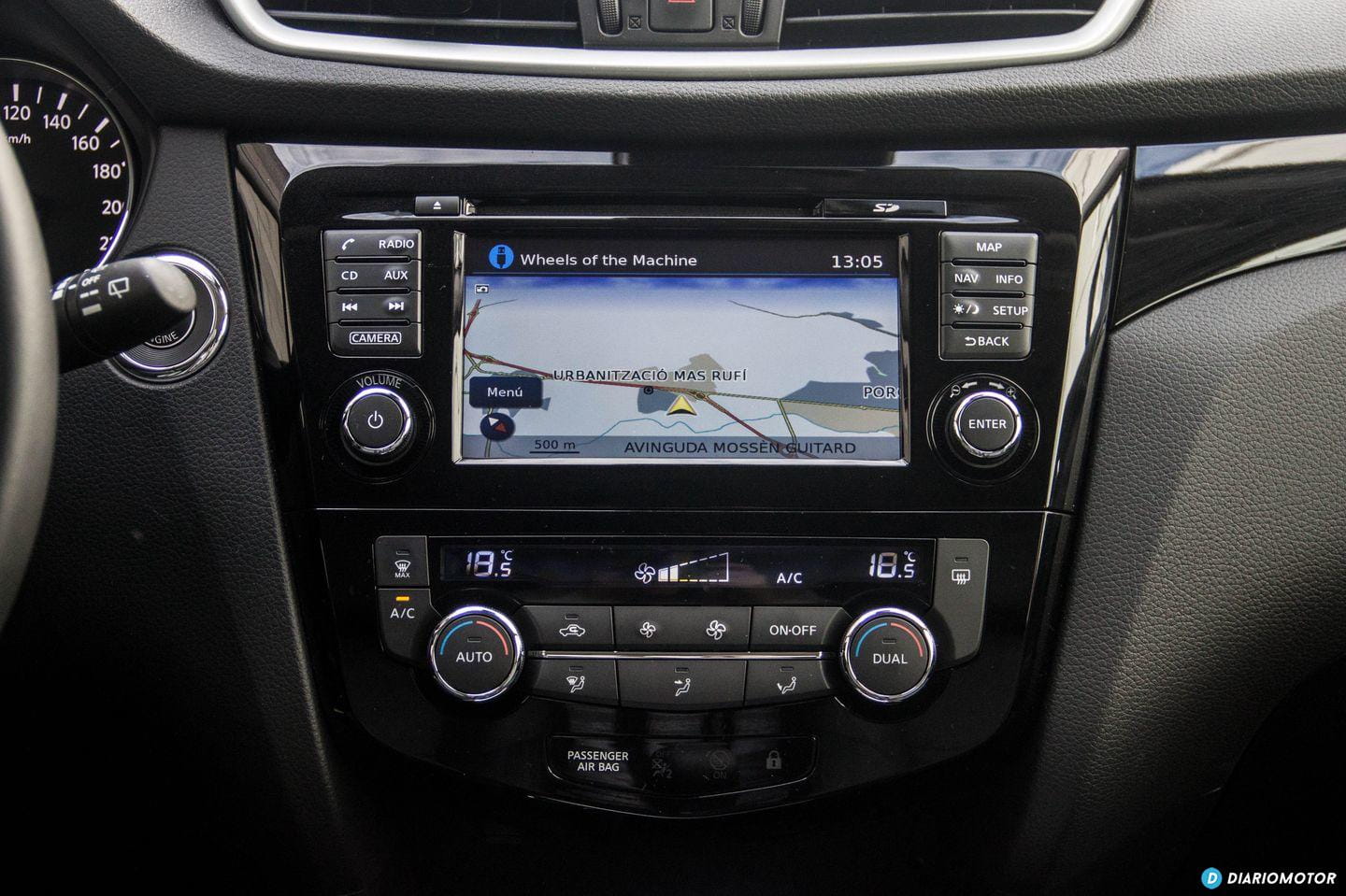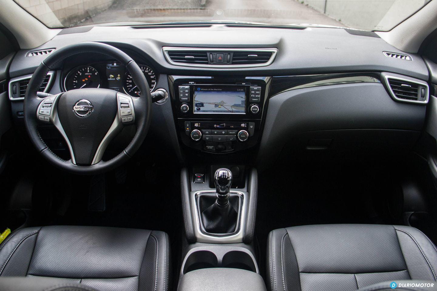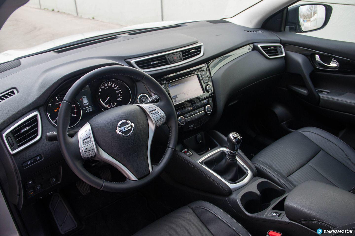 De nuevo la virtud es el equilibrio del Nissan Qashqai. Mantiene un interior razonablemente interesante en cuanto a atractivo visual, sin sacrificar la funcionalidad necesaria. Los acabados del Qashqai me han parecido incluso mejores que los de su hermano el Nissan X-Trail, que abusa de los plásticos duros. Nos encontramos con buenos acolchados en el salpicadero, plásticos duros de buen ajuste en la consola central y una instrumentación de excelente lectura. No estoy tan de acuerdo con el uso de plásticos negros brillantes.