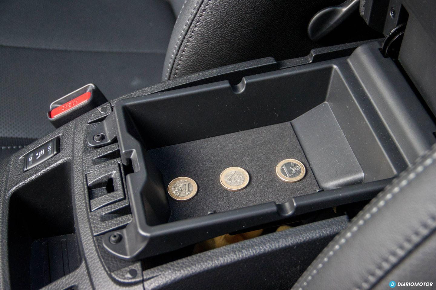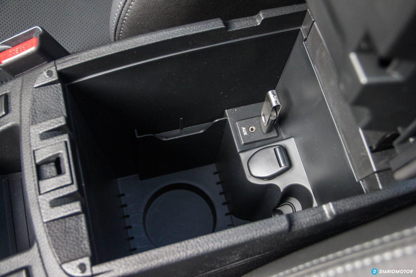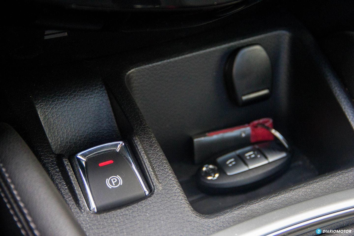 Recubren la consola central, en zonas en constante contacto con nuestros dedos, atrapando polvo y huellas dactilares con excesiva fruición. La palanca de cambios está rodeada con un discreto LED naranja y un tapizado de cuero de buena calidad. Si bien no admiro los frenos de mano eléctricos, he de reconocer que liberan espacio en la consola central. Nissan ha instalado en su lugar dos grandes portabebidas y un enorme compartimento de carga bajo el reposabrazos central. La guantera no es grande, y no está iluminada ni refrigerada.