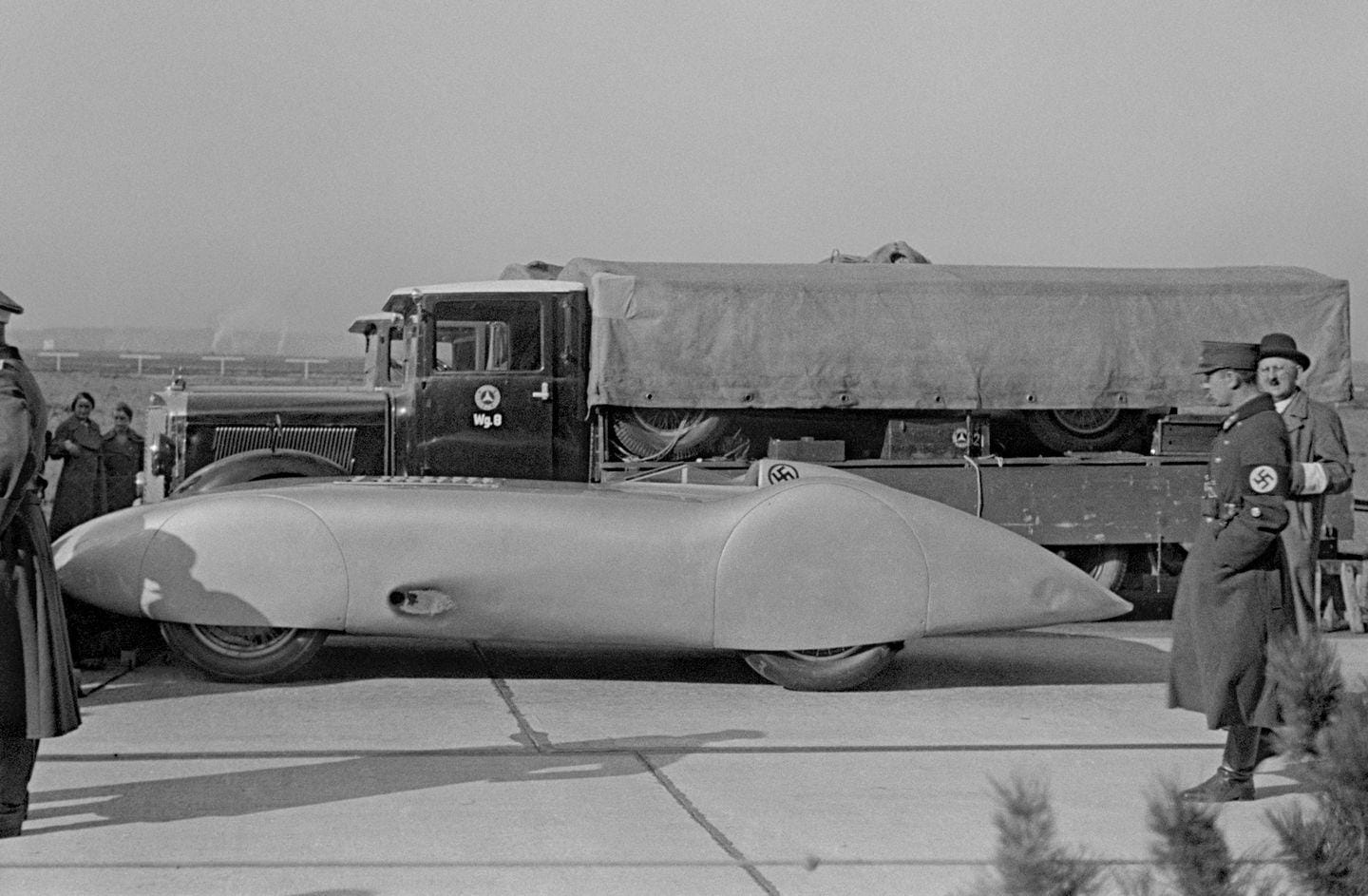 En 1938 comenzó la celebración de las que acabarían conociéndose como «Rekord Woche». Semanas de récord, eventos en los que el objetivo era batir récords de velocidad sobre tierra. Mercedes y Auto Union acudían con toda la carne en el asador, con vehículos derivados de sus coches de competición. En una época en la que la dinámica de fluidos computerizada era una entelequia, estos eventos presentaban retos aerodinámicos que daban pie a soluciones de lo más peregrinas, como pronto veréis.