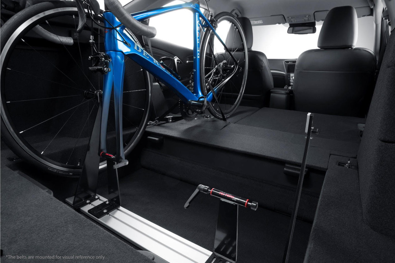 Este sistema nos permite llevar la bicicleta desmontando la rueda delantera, plegando, eso sí, los asientos posteriores. Honda se sirve de un soporte anclado al doble fondo del maletero que servirá de sujeción para la rueda, apoyándose la parte posterior en una cincha para asegurar la bicicleta.