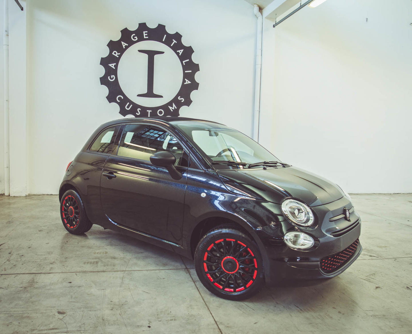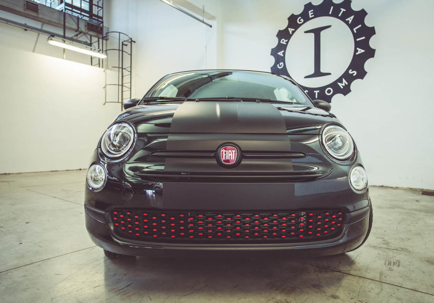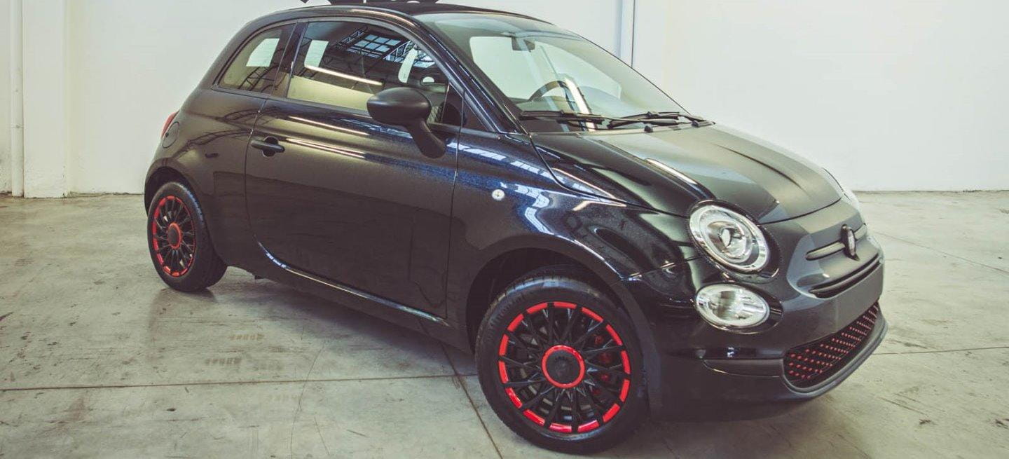 Un simple vistazo a su aspecto exterior ya deja claro que no estamos ante un 500 corriente. Para la carrocería se ha utilizado pintura negra con toques de plata brillante, creando un efecto de lo más resplandeciente según dicen en Garage Italia Customs, a pesar de que las fotos no hagan justicia. Se ha añadido un vinilo negro mate en toda la carrocería situado en posición longitudinal. El punto más excéntrico lo ponen las terminaciones en rojo de la rejilla delantera y las llantas y, sobre todo, los faros delanteros y traseros rodeados por cristales de Swarovski.