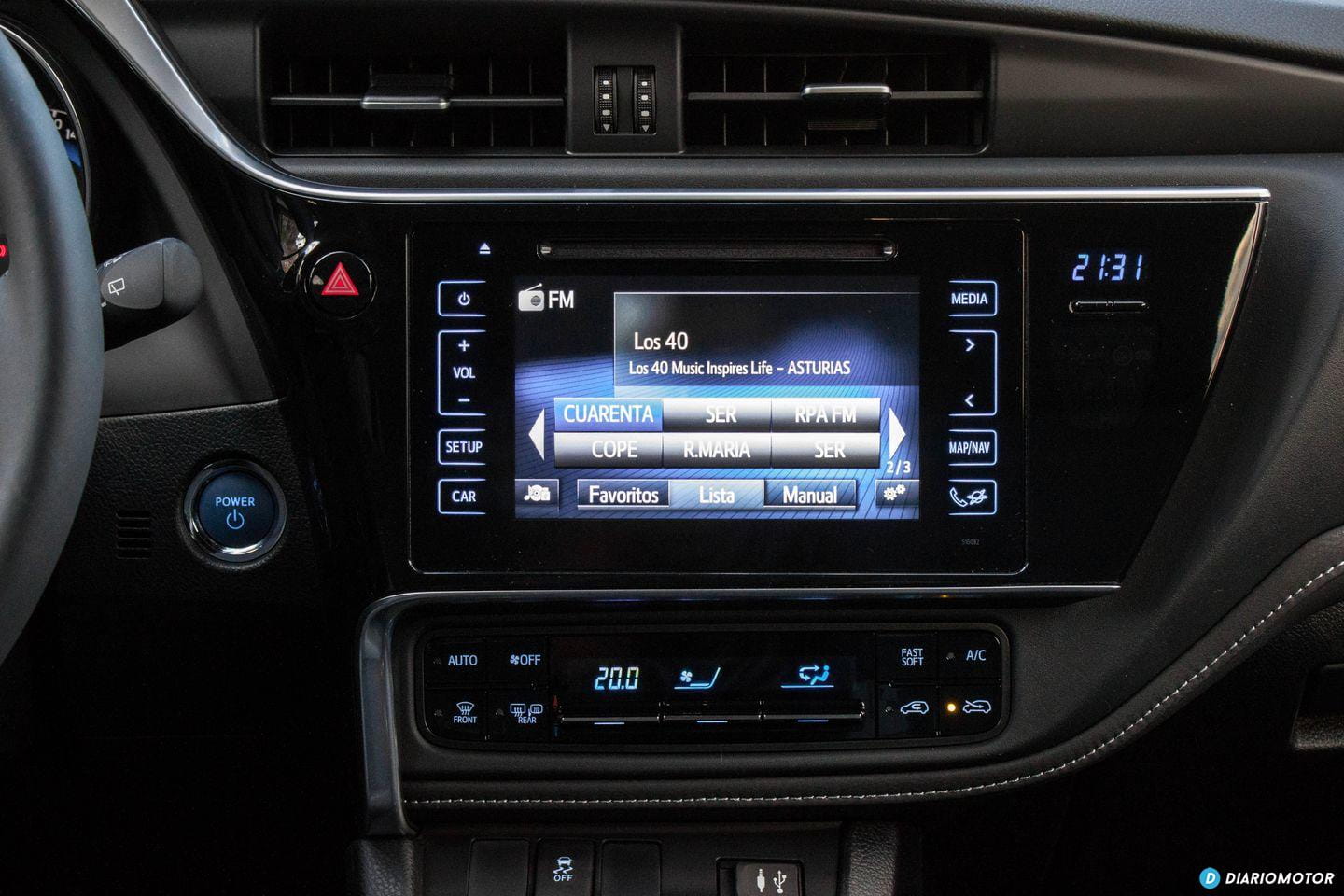 Entre otros detalles, dispone del sistema de infotainment Toyota Touch 2 & Go con pantalla de 7 pulgadas o llantas de 17 pulgadas. No obstante, exige equipar de forma opcional la dotación de seguridad activa avanzada (pack Toyota Safety Sense, valorado en 700 euros) o el navegador GPS (600 euros). Con respecto al Auris con motor 1.2 turbo de prestaciones equivalentes y el mismo acabado, el híbrido es 1.700 euros más caro. Pero con respecto al diésel de 111 CV, es 320 euros más asequible.