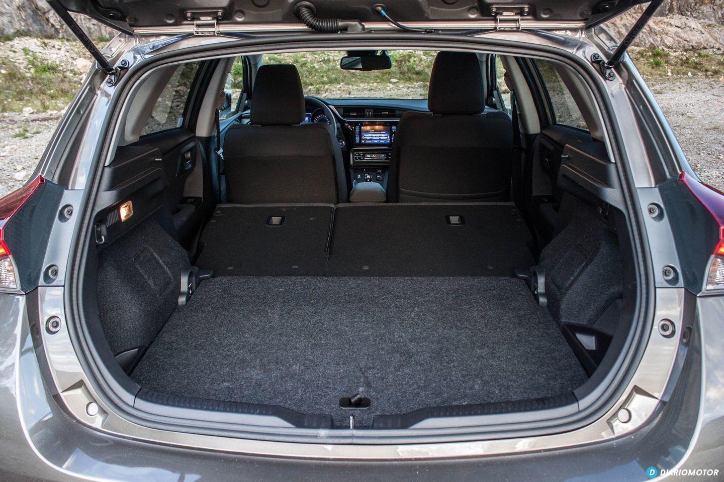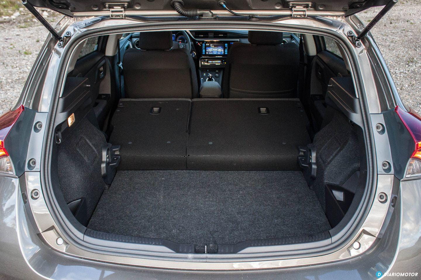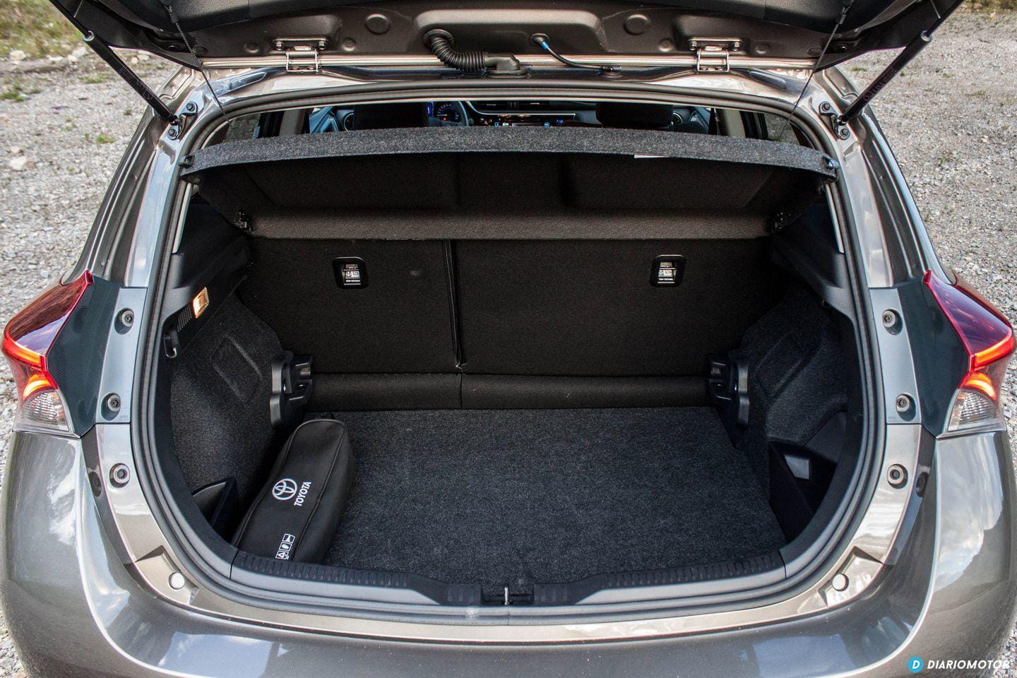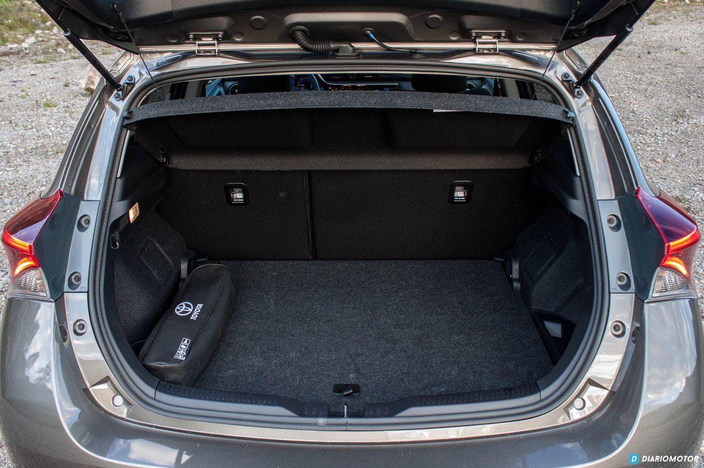 Me gusta que no haya cambios en lo tocante a capacidad de carga con otros Toyota Auris. Su anterior generación veía disminuida la capacidad del maletero, mientras que este Auris Hybrid dispone de los mismos 360 litros de capacidad que el resto de la gama Auris. El maletero tiene un doble fondo y carece de rueda de repuesto, sólo monta un kit antipinchazos. Abatiendo los asientos se logra una superficie de carga plana de 1.200 litros, fácilmente accesible a través de una boca de maletero ancha y cómoda.