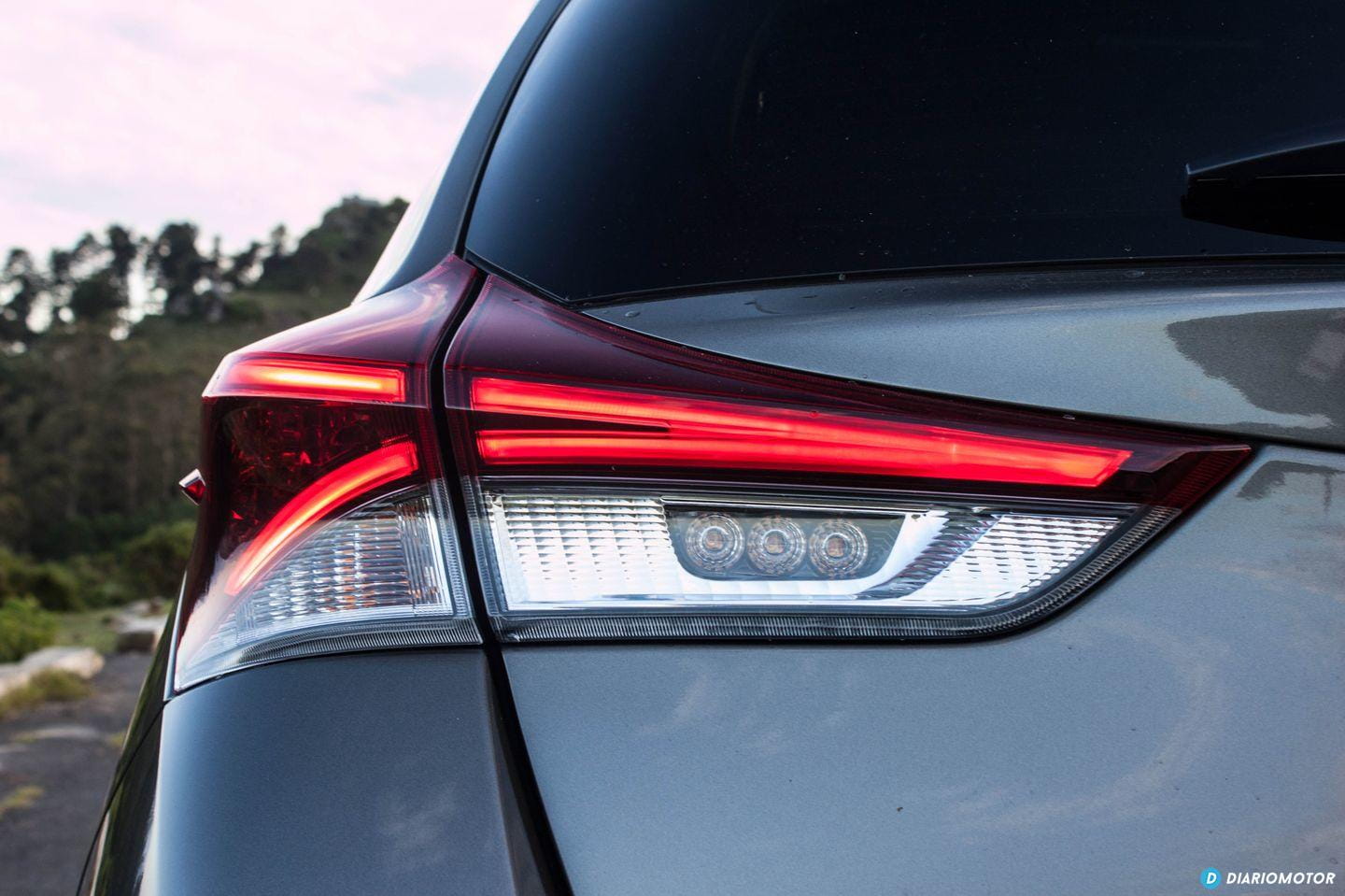 El lavado de cara que el Toyota Auris ha sufrido hace apenas un año le ha sentado bien. Su frontal es ahora más afilado, y en él destacan unas ópticas full LED, a los lados de una calandra discreta y pequeña. Las líneas del compacto japonés – fabricado en Reino Unido – son algo más marcadas, y creo que el diseño de llanta de 17 pulgadas de nuestra unidad es realmente bonito. La parte trasera del coche destaca por unas bonitas ópticas LED y un pilar C bastante anguloso, cerrando un coche con cierta forma de cuña.