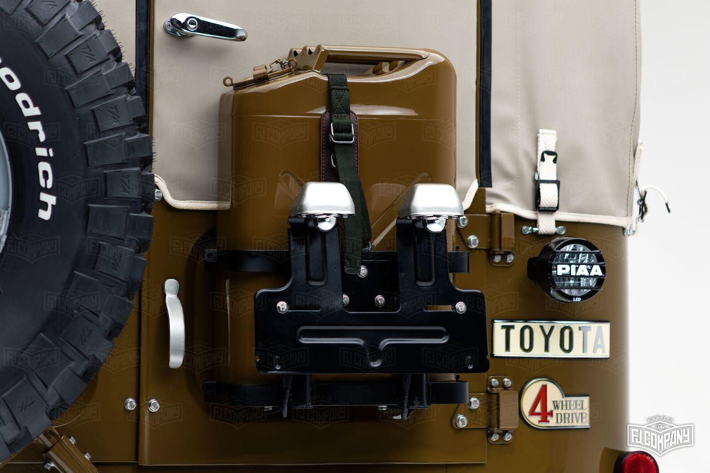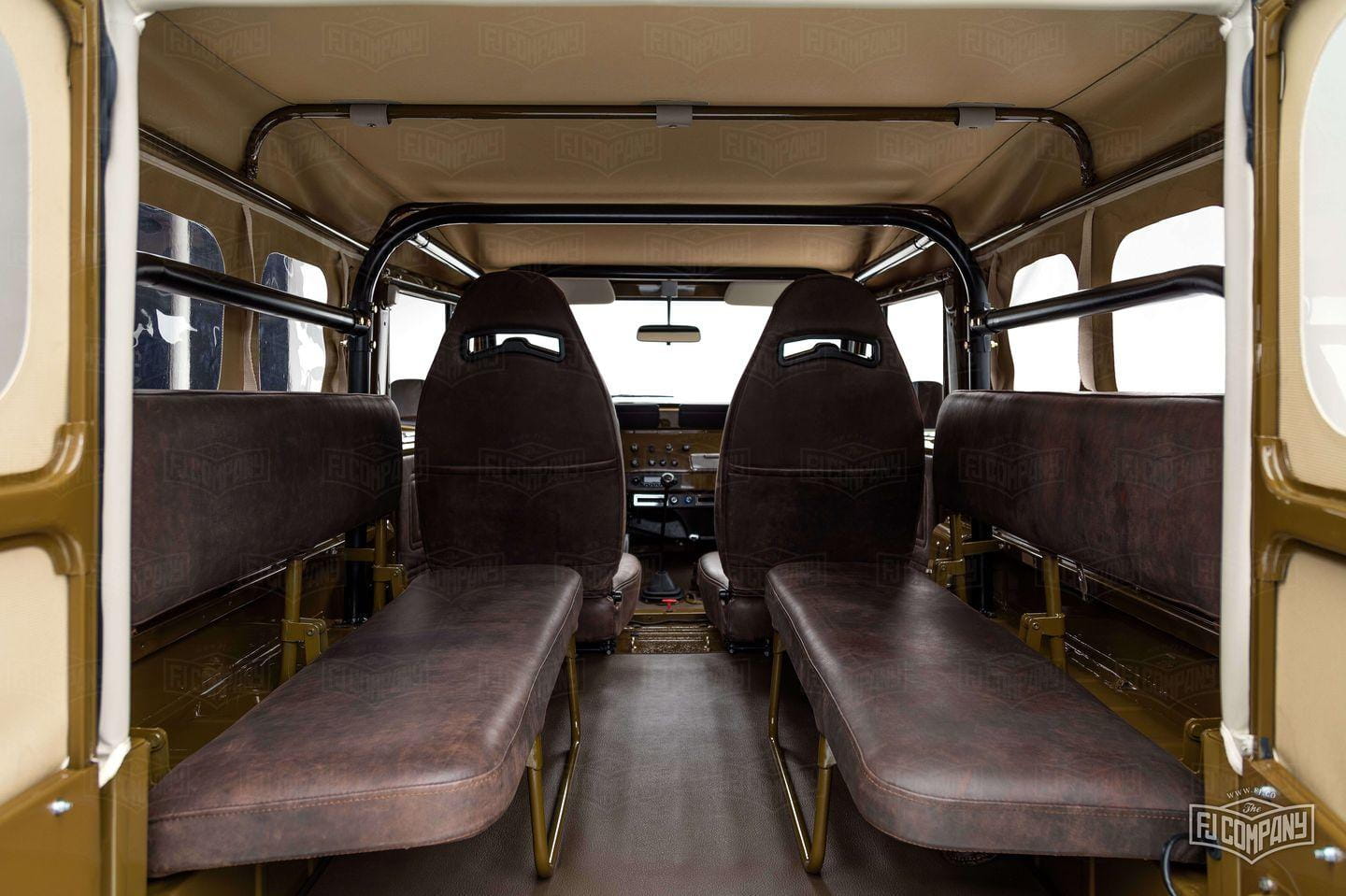 En el interior, han instalado asientos Corbeau MOAB, de cuero de color oscuro y excelente acabado. Este Toyota Land Cruiser también retiene los dos bancos corridos instalados en la parte trasera, que sigue cubierta con un toldo de color marfil. Un pequeño extintor y un tren de rodaje refrescado – ejes y diferenciales restaurados al completo – cierran esta espectacular restauración, con todo el sabor original y unas pocas pero útiles adiciones modernas. The FJ Company no ha querido anunciar el precio de esta fantástica creación.