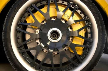 Desarrollaron un nuevo sistema de pinzas de frenado en el eje delantero, con una mordida de nada menos que 14 pistones. Esta enorme pinza cubría la mitad del disco de freno delantero, de 386 mm de diámetro. Tuvieron que diseñar y fabricar unas 100 piezas nuevas. Por fortuna, el disco de freno trasero estaba abrazado por simples pinzas de seis pistones. El freno de mano hacía uso de los discos de freno delanteros, desdoblándose como sistema de launch control, permitiendo salidas fulgurantes tras la carga de los turbos.