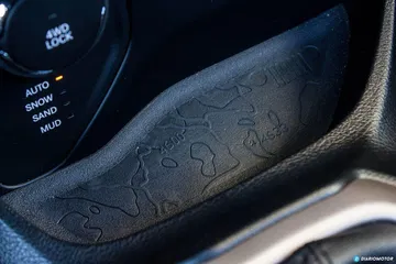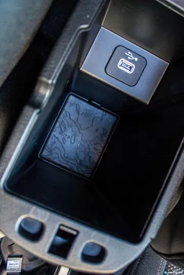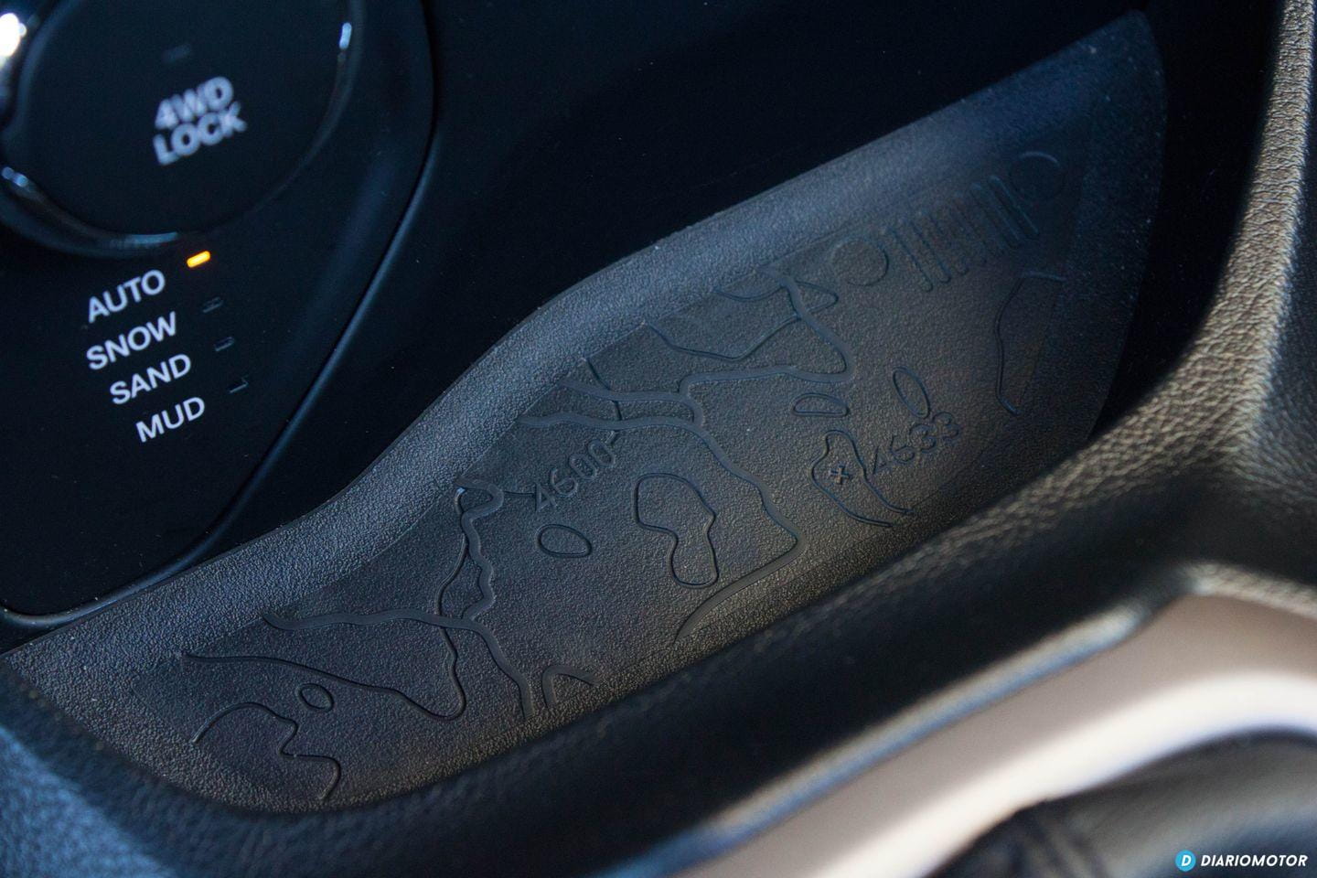 Dos mapas topográficos – con sus correspondientes curvas de nivel – sirven de base al hueco portaobjetos bajo la consola central y el hueco situado bajo el reposabrazos central. Que quede claro que es un coche que no tiene miedo a ensuciarse y salir del asfalto.