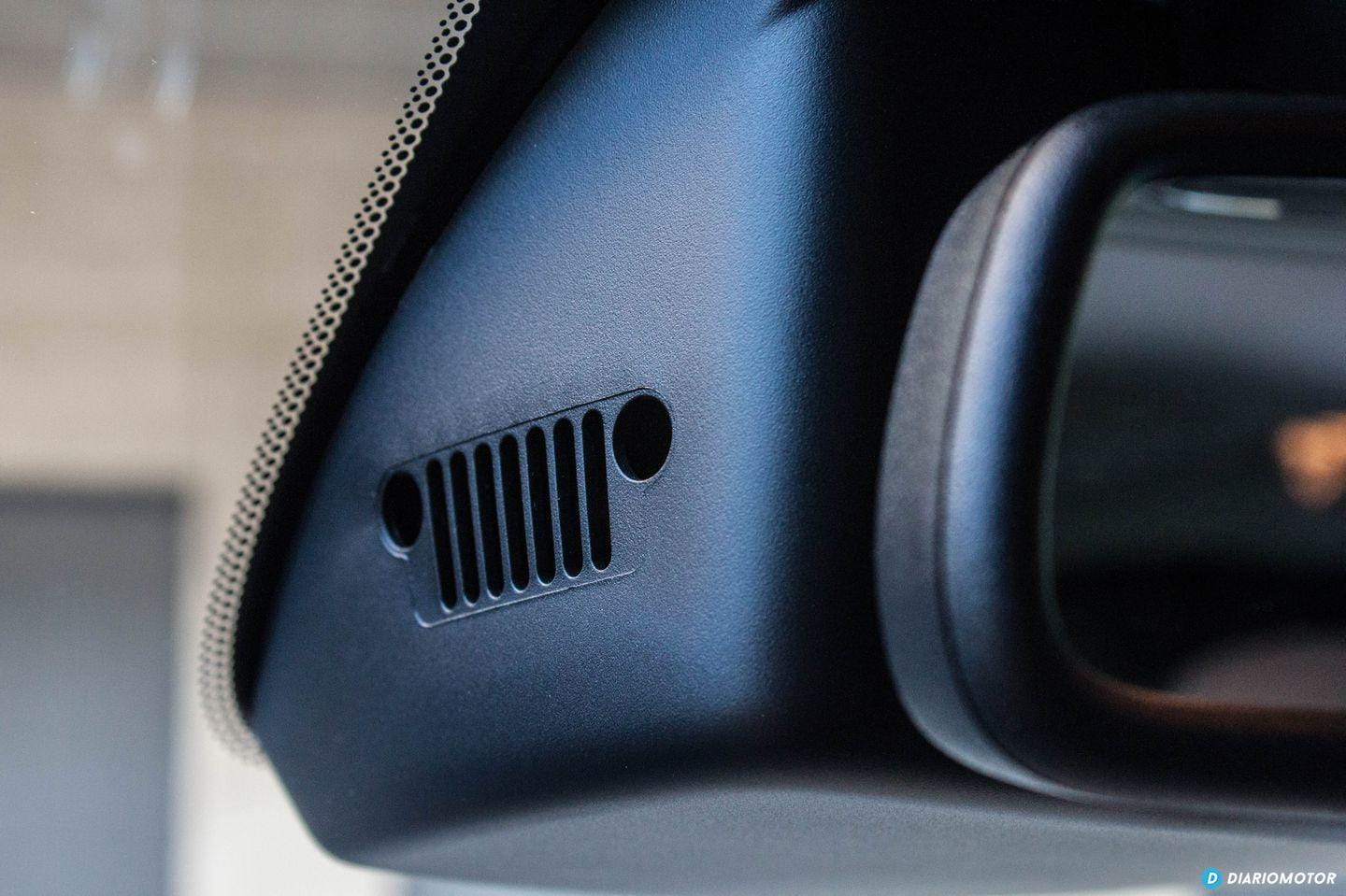 La clásica calandra de siete barras, flanqueada por dos ópticas redondas, está muy presente en el Jeep Renegade. Es el símbolo de la marca, y este detalle se encuentra en los paneles de los altavoces, situados en las puertas.