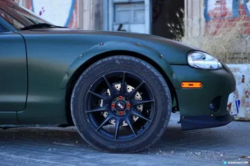 Toda la obra maestra de adaptación y el órgano donado sólo habían añadido 100 kilos más de peso al Miata, por lo que ahora la báscula indicaba 1160 kg. Si tenemos en cuenta que del V8 se extraen 345 CV y unos 520 Nm de par entregados directamente al eje trasero, os podéis hacer una idea de cómo se mueve de rápido esta máquina. Además, ha logrado un reparto de pesos envidiable por grande marcas de deportivos, 51-49. Detener este monstruo de la mecánica no es tarea sencilla, para ello se han instalado un equipo completo Wilwood de discos ventilados delante y rayados detrás, con el mismo tamaño de las pinzas originales.