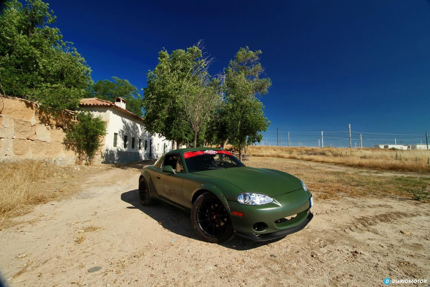 Organizado el encuentro, esperamos bajo un sol de justicia a que llegue el misterioso Miata V8. De pronto, escoltado por unMitsubishi Evo VIII rojo, aparece con un sonido inconfundible nuestro protagonista. Es real, está aquí, y es más impresionante aún en vivo.