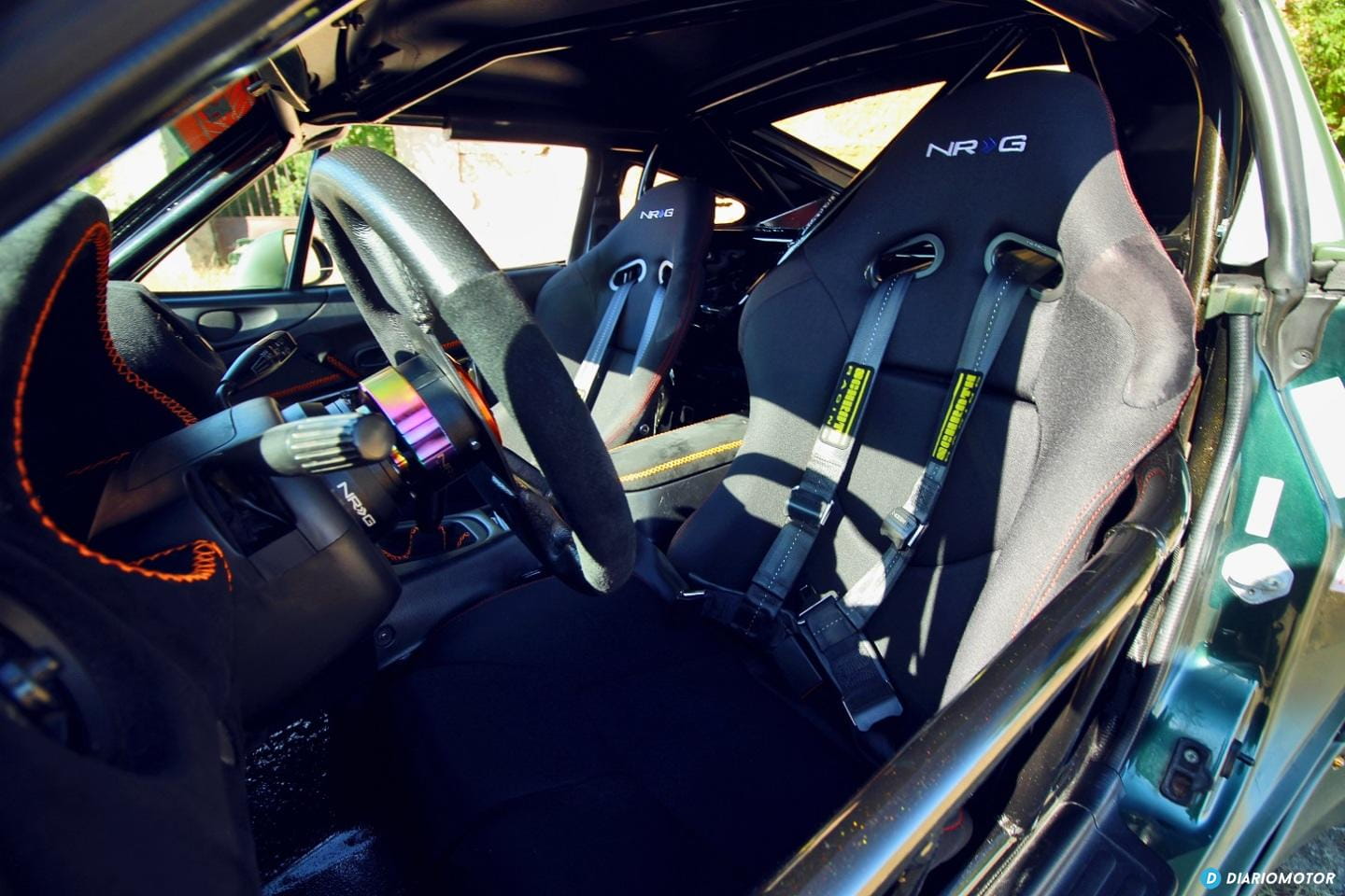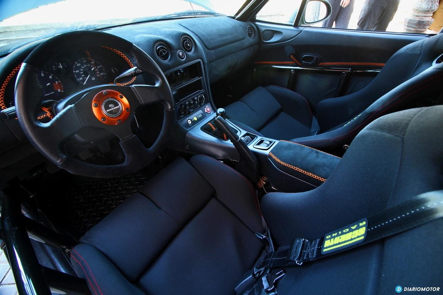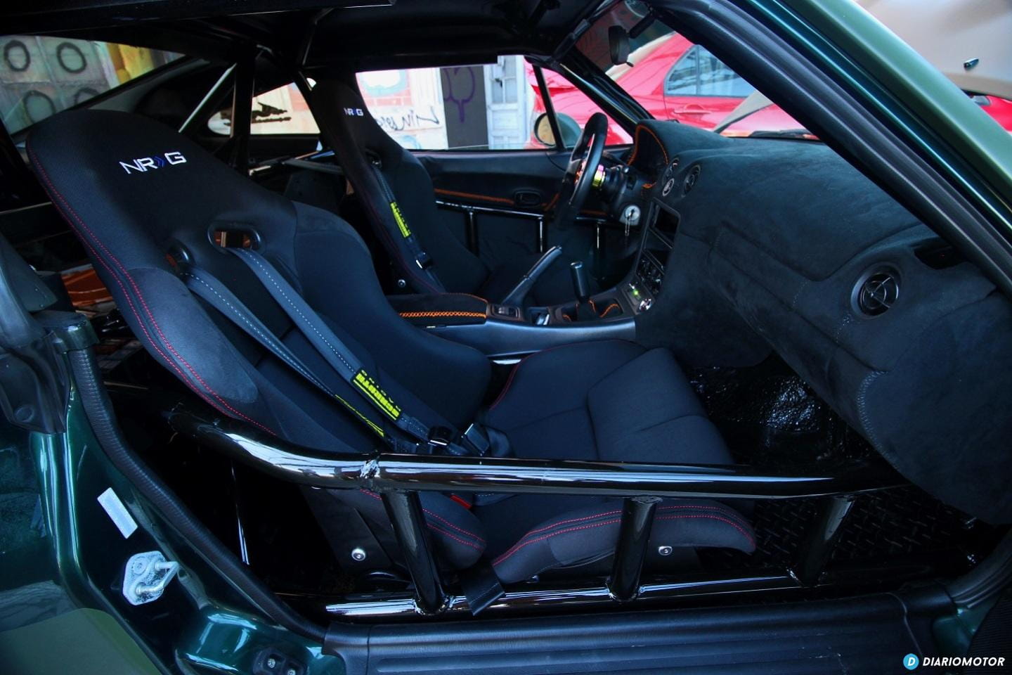 Dentro tampoco falta detalle, forrado en Alcántara, baquets, una jaula antivuelco, volante nuevo, el cambio del C5. La dirección asistida llegó más tarde, casi por obligación, porque era difícil convivir con el Miata V8 en los parking y otros sitios que requerían muchas maniobras. El aire acondicionado por cierto, aún no lo tiene puesto.