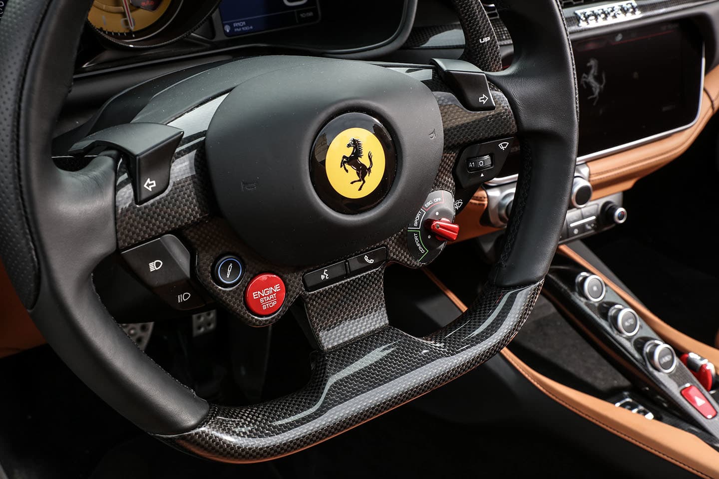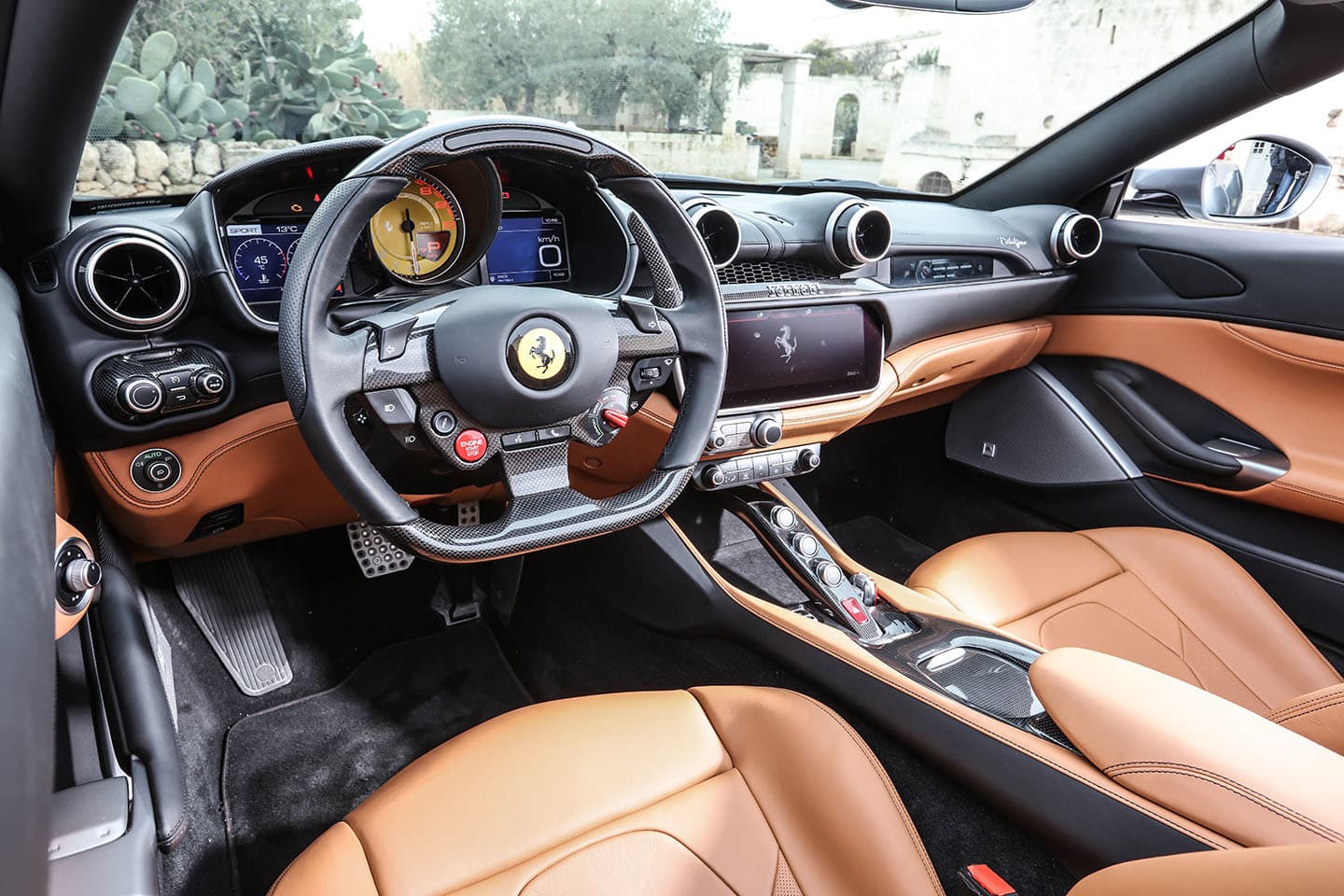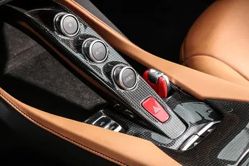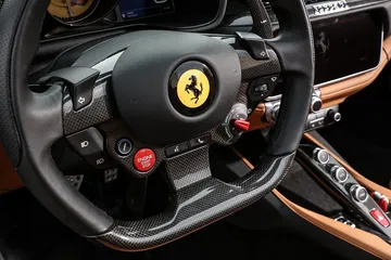 Nos encontramos con un puesto de conducción muy enfocado al conductor y ergonómico, con un volante muy deportivo, en el que verás un Manettino con posición Sport, unas levas enormes y muy accesibles, y en el que solo podrían desentonar los indicadores de dirección, que Ferrari lleva a unos pulsadores para evitar satélites tras el volante que interfieran con sus levas.