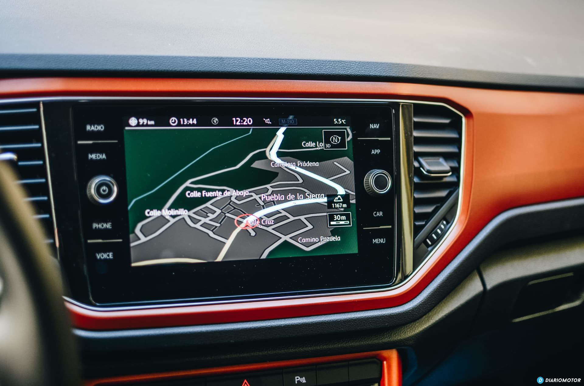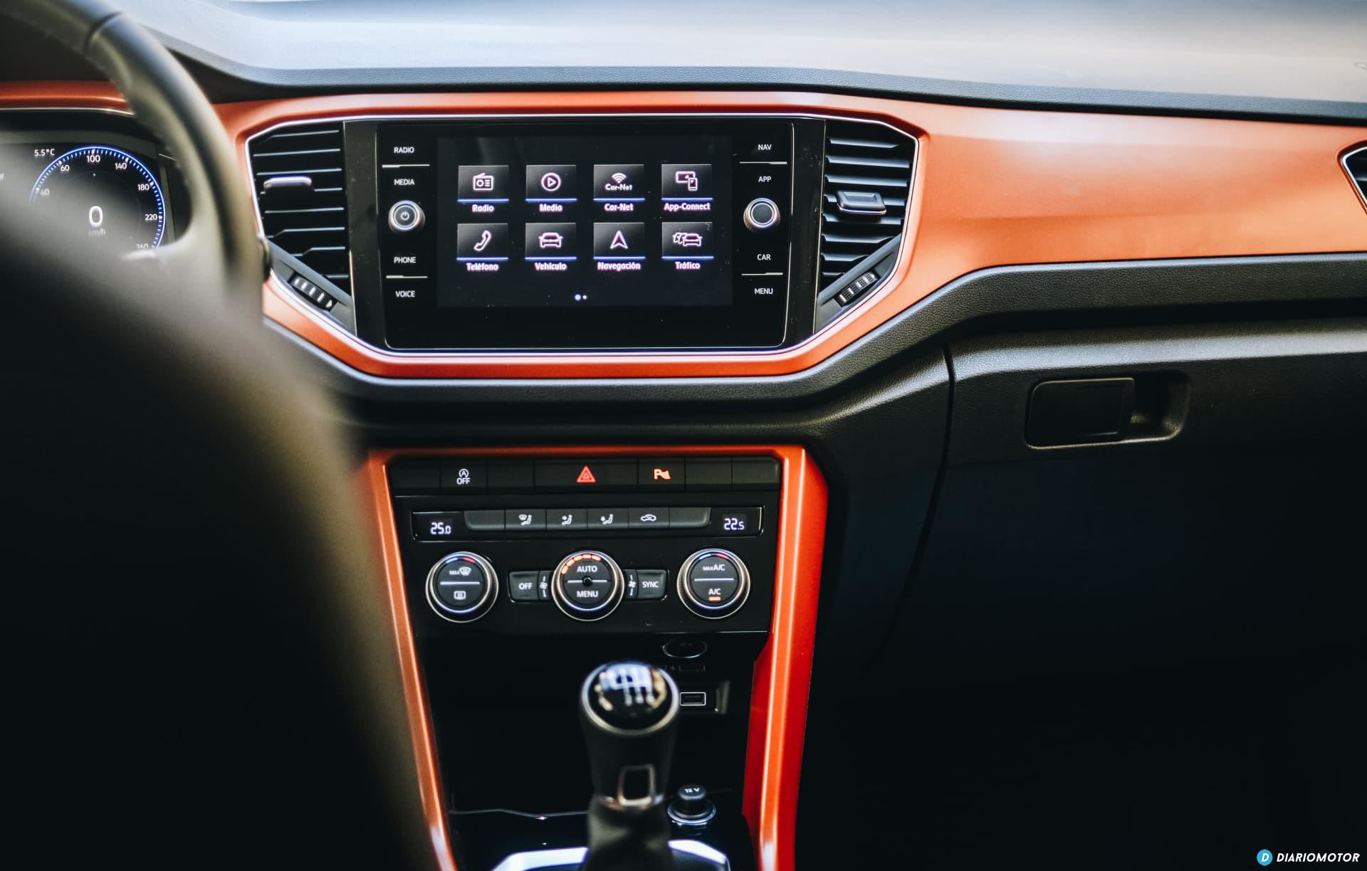 Los plásticos duros son absoluta mayoría en el interior del Volkswagen T-Roc, que cuenta con ajustes correctos sí, un buen equipamiento de serie y un buen despliegue de tecnología, con un sistema multimedia con pantalla táctil de 8 pulgadas, bien resuelto, la instrumentación totalmente digital o la carga inalámbrica para el teléfono móvil… pero la gran presencia de plásticos duros nos hace trasladarnos por un instante a un coche del segmento B, a un Volkswagen Polo y evidentemente estamos ante un coche de un segmento superior, de un coche que, como mínimo y detalles estéticos al margen, debería contar con la presencia interior de un Volkswagen Golf.