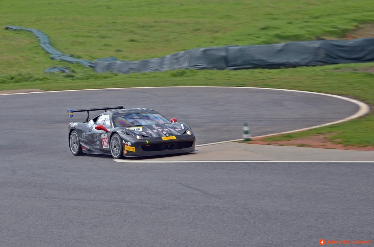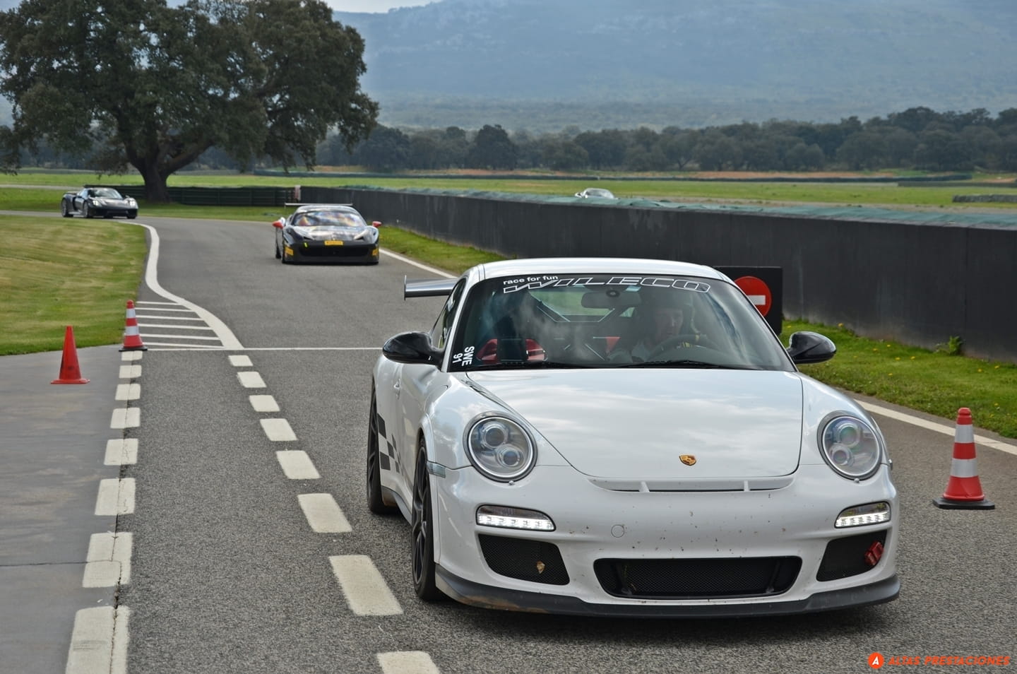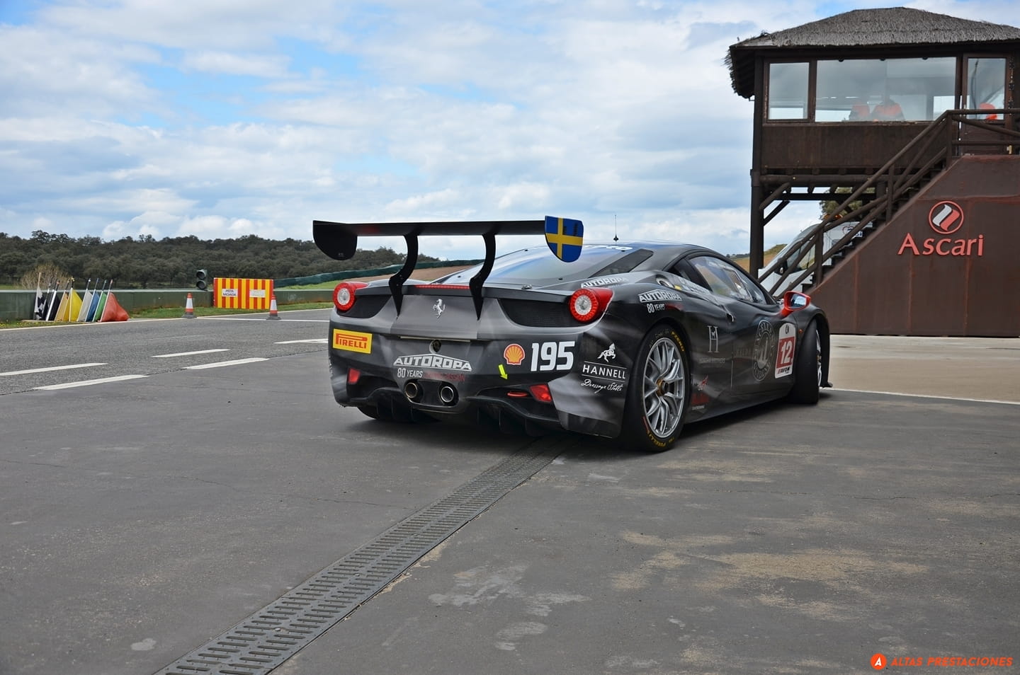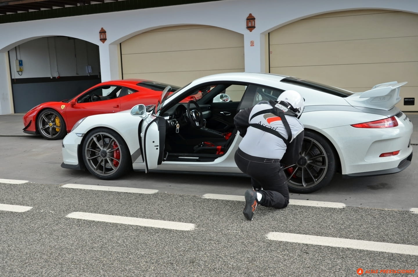 Los que conozcan el circuito de Ascari sabrán que no estamos ante un circuito sencillo, más bien podemos hablar de un circuito exigente que requiere más de dos minutos de concentración por vuelta para ir rápido. Hay zonas de adelantamiento, no muchas, pero las hay, sin embargo hoy cada metro parece que es un bien sitio para meter el «hachazo». Cierta paz reina entre las primeras tandas, una calma que termina de forma abrupta cuando desde uno de los boxes cobra vida el V8 de un Ferrari 458 Challenge… un sonido atronador que deja a un lado al resto de V8 y flat-six que están en pista. Pero este movimiento de Ferrari no queda sin respuesta, desde otro box nos llega otro sonido gutural, sendos Porsche 911 con especificación FIA GT3 salen empujados por mecánicos rumbo al pitlane. Las cosas se ponen serias, los esbeltos deportivos de calle dan paso a sus hermanos más radicales, es hora de ver una auténtica guerra en pista.