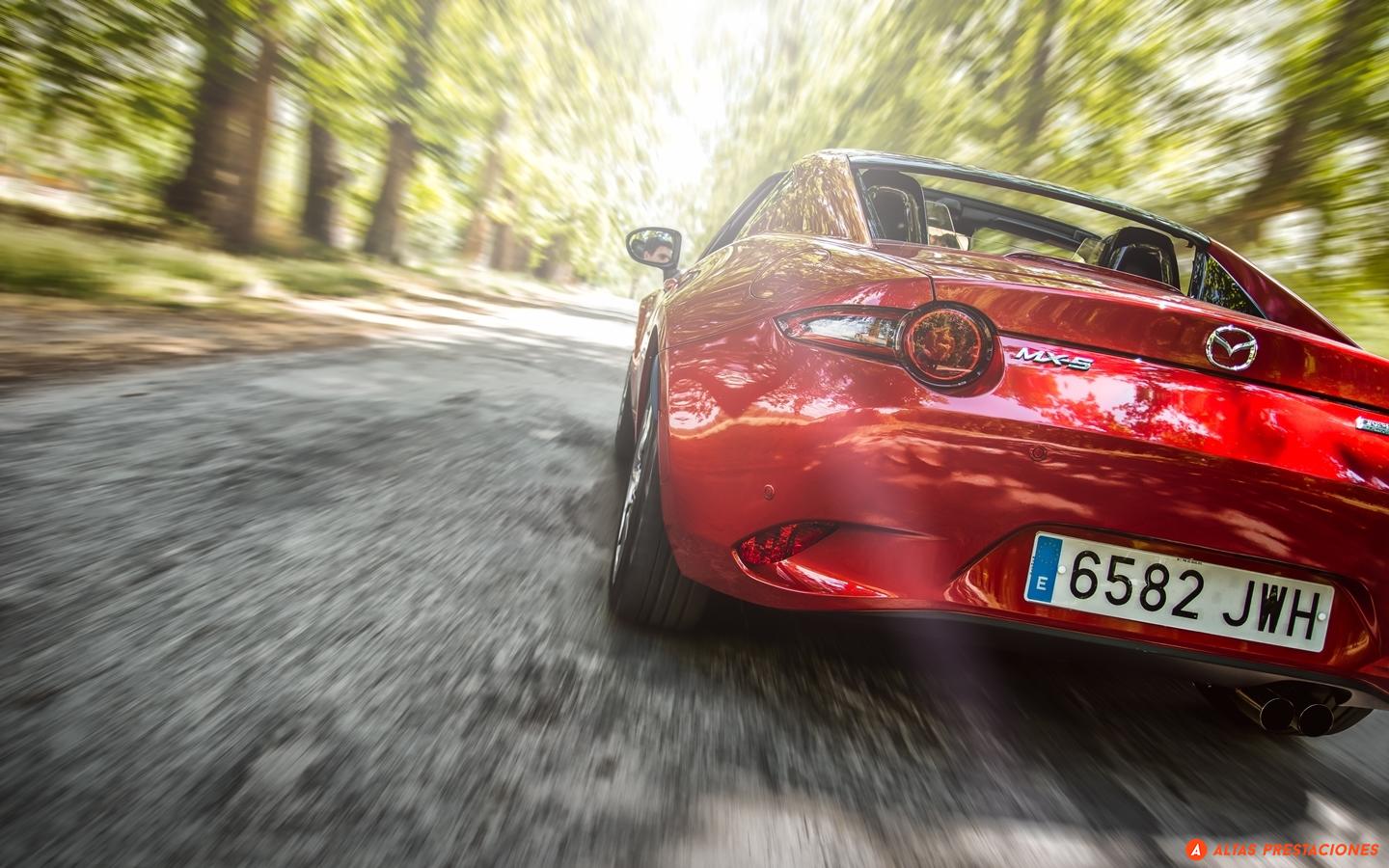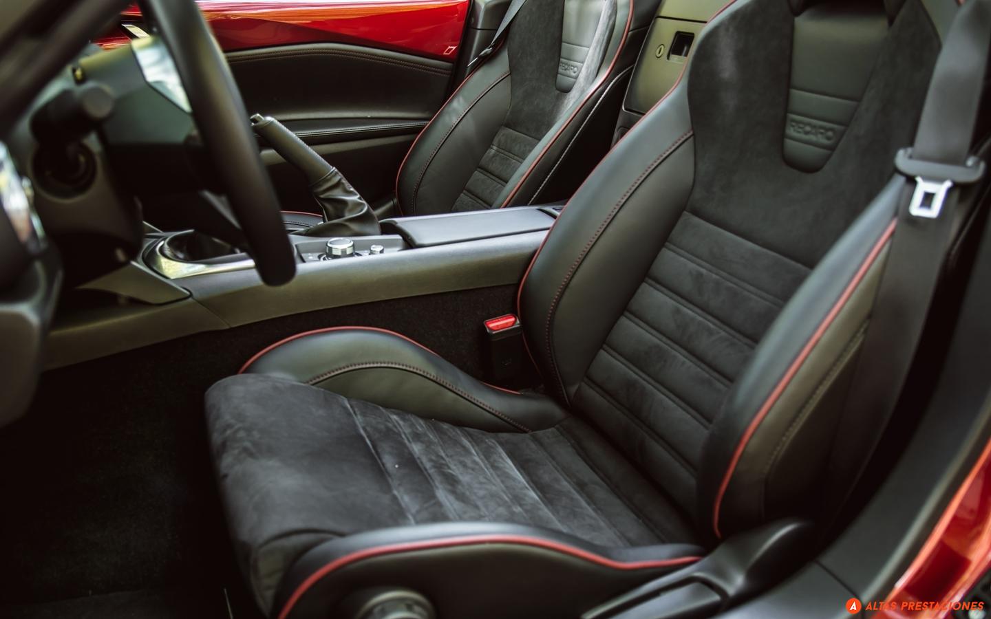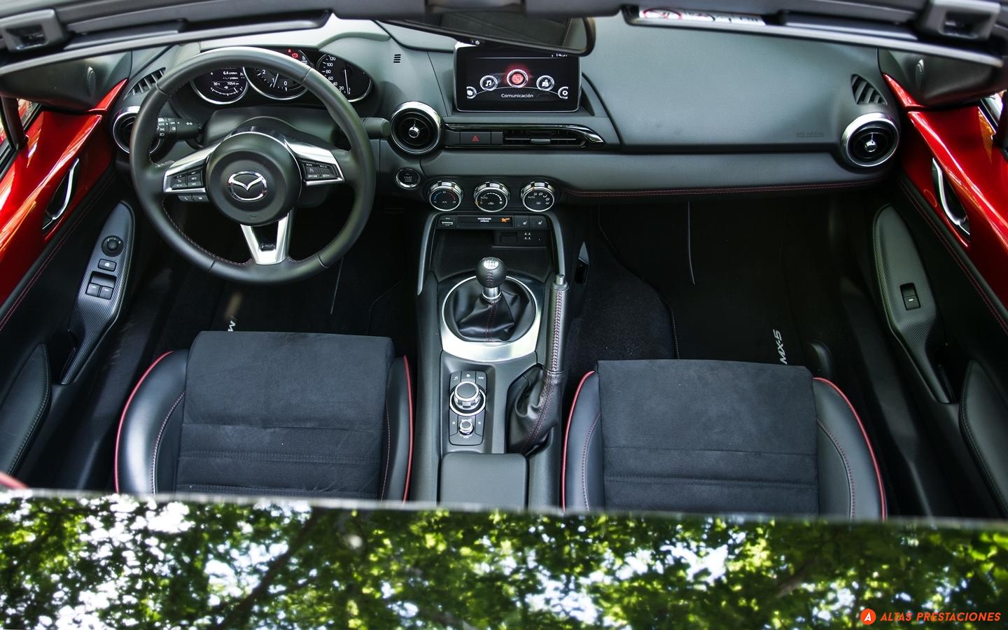 La unidad que tenemos entre manos corresponde al acabado Sport asociado al motor gasolina de 2 litros y 160 CV perteneciente a la familia Skyactiv. Por decirlo de algún modo, estamos ante el actual tope de gama del MX-5, por carrocería, equipamiento y puesta a punto. A nivel técnico este acabado Sport ofrece mejoras con respecto al resto de la gama que atañen a equipo de frenos más potente, un diferencial trasero específico y suspensión deportiva firmada por Bilstein. Una suerte de revisión que añaden un plus muy recomendable a nuestro «Miata».