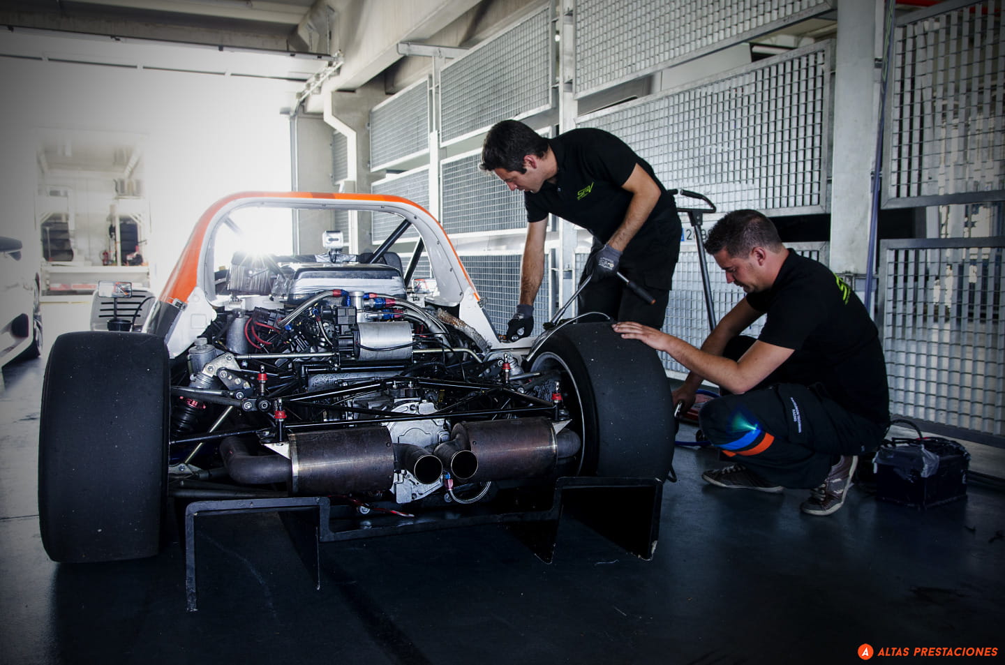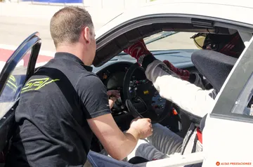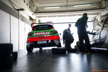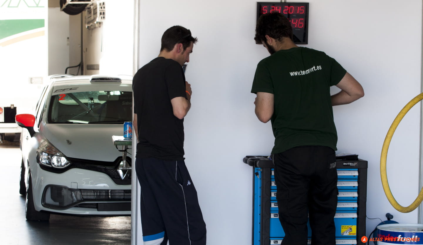 El paso por el paddock, obligatorio antes de saltar a los viales, antes de empezar con las fotos en pista, nos deja, además de con las primeras fotos, esas fotos de trastienda, del calor del box, de motores a pecho descubierto y cascos reposando sobre baquets, con un encuentro que no esperaba, el de Dani Carretero y el Ginetta G55 del equipo Octane.