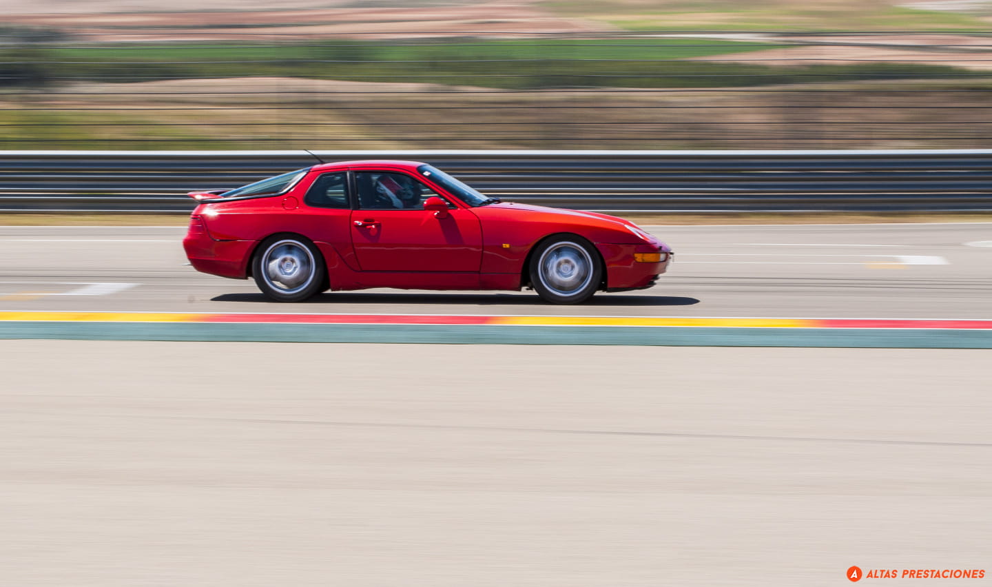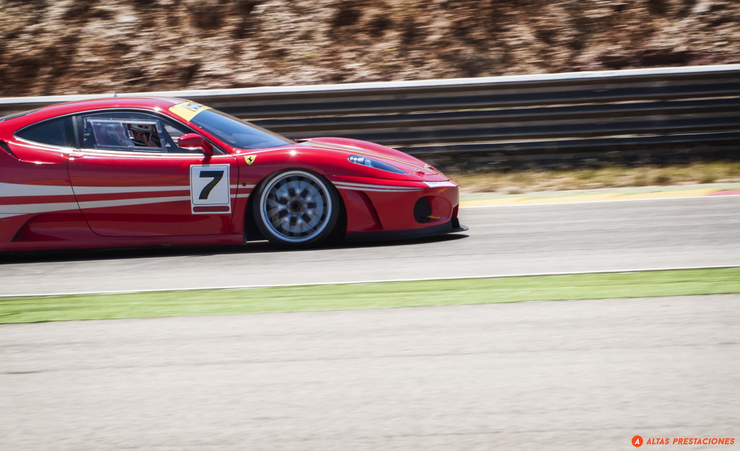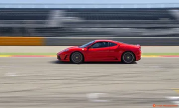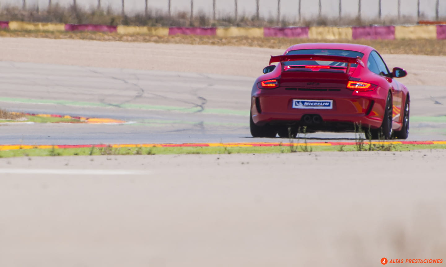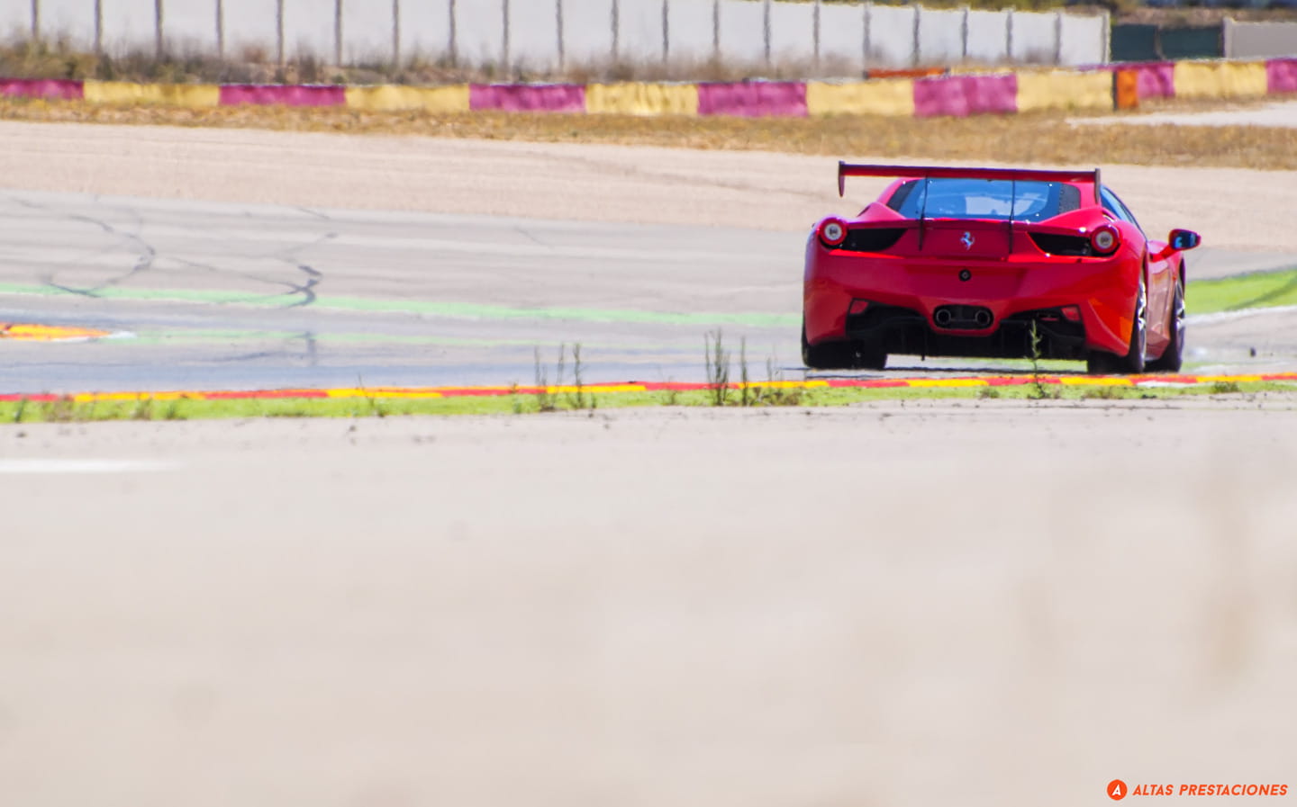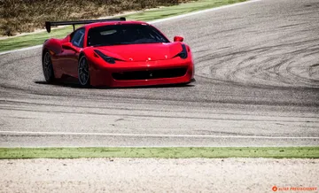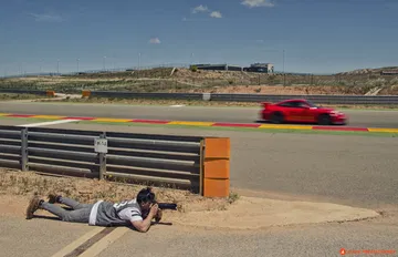 Nos apostamos a final de recta, disfrutamos del sacacorchos… y un estruendo invade de golpe la pista. Se le escucha venir de lejos, muy lejos, un aullido, no es el golpeteo metálico de un Porsche, no es el sonido afinado de un coche de serie… a la salida de una curva se conforma la imagen de un vitaminado 458 Italia… pero no, no es un Italia “cualquiera” y boquiabiertos asistimos a la pasada de todo un Ferrari 458 Challenge.