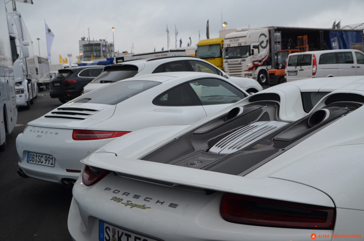 Un fin de semana en el infierno verde, con la excusa de las 24 Horas de Nürburgring, nos ofrece otros muchos más entretenimientos que la propia acción en pista. Tiendas, la vida del paddock, un parking en el que no faltan auténticas joyas clásicas, contemporáneas… y algunas de las últimas criaturas deportivas expuestas en los hospitality de las marcas, como Porsche, que nos deleitó con la presencia del Porsche Cayman GT4, del Porsche 911 GT3 RS y de un recién presentado Porsche 911 GT3 R.
