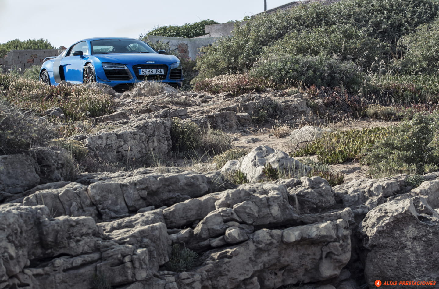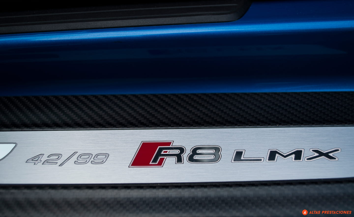 Juanma fotografía algún que otro detalle mientras terminamos de ver la composición de la siguiente foto. Aprovecho siempre esos momentos para repasar algunos de los rincones más recónditos en busca de detalles y este Audi R8 LMX está bastante bien servido de anecdóticos añadidos. Los umbrales de las puertas nos recuerdan que estamos ante una versión limitada, que sólo hay 99 en el mundo y que el nuestro es la unidad 42. Acuérdense, quizá dentro de 20 años nos lo encontremos en alguna millonaria subasta. En su interior se prodiga la alcántara excelentemente regada de costuras azules, un azul que se repite en el respaldo de los asientos y que combina a la perfección con el azul de su carrocería. Este tono, este azul bautizado por Audi como “Ara Blue” es fruto del departamento de los caprichosos, de Audi Exclusive y no le podía sentar mejor al R8.
