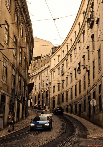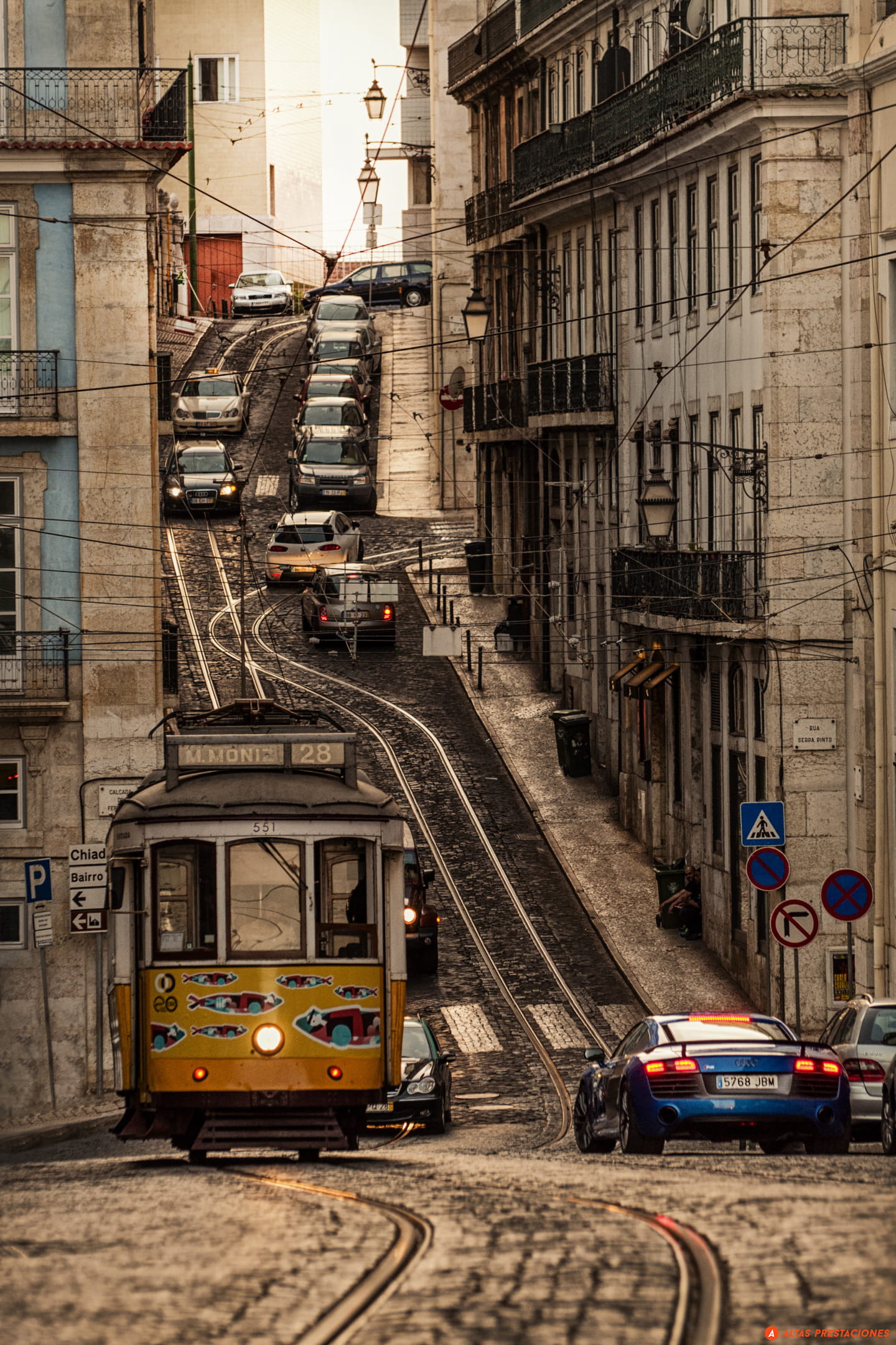 Entramos en la hora crucial. Empieza el atardecer y no podemos perder el tiempo. Tanteamos los alrededores de la Torre de Belém, los Jerónimos, buscamos alguna de esas características fachadas de Lisboa cubiertas de relucientes y añejas cerámicas, una de esas fachadas que tan bien reflejan la característica luz de esta ciudad… terminamos en el barrio alto, nos cruzamos con un tranvía, Juanma se baja a toda prisa del coche con el trípode a cuestas, sobre los hombros, vemos la foto.