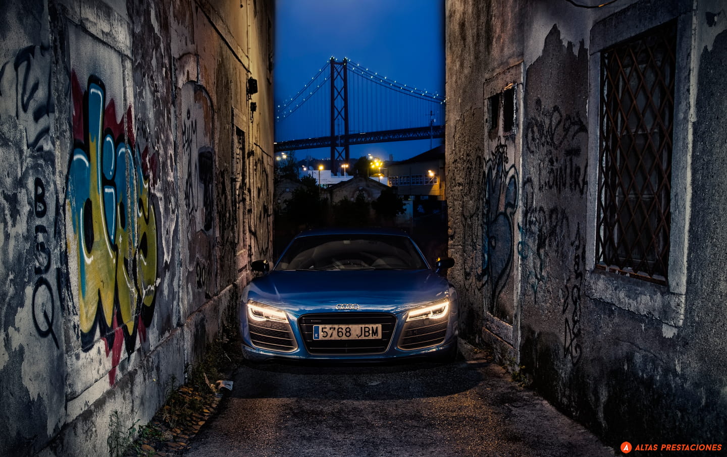 «Las historias están donde usted las encuentra», decía Gay Talese y hasta Lisboa me fui a buscarlas hace un par de semanas. Mi despertador, mi móvil, vuelve a sonar un sábado más a las 5 de la mañana, tal y como sonaba hace unos días cuando emprendía rumbo a Motorland con el Subaru WRX STI. Hoy el viaje es diferente, aunque claro, por otro lado, siempre es diferente. Hoy pongo rumbo a Lisboa y lo hago en compañía del último Audi R8 de una generación que ya no es saliente, sino que ya ha salido por completo. Un Audi R8, el Audi R8 LMX, más que dispuesto a conquistarme, a mí, a mí que detesto el equilibrio. Sus armas no son pocas: un V10, 570 caballos, una esbelta línea atemporal, ese bonito tono azulado que tan bien le sienta, nuevos apéndices aerodinámicos…