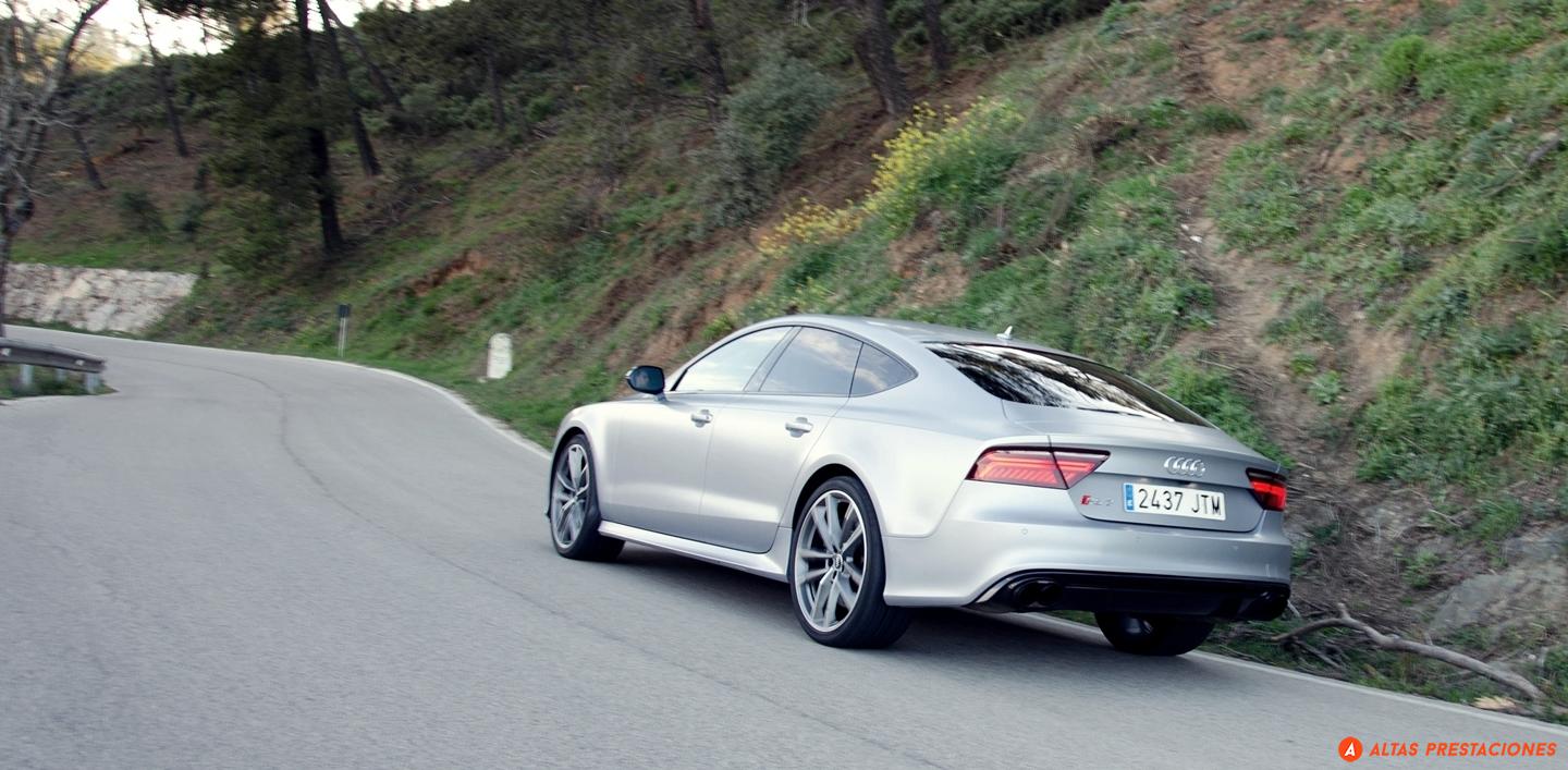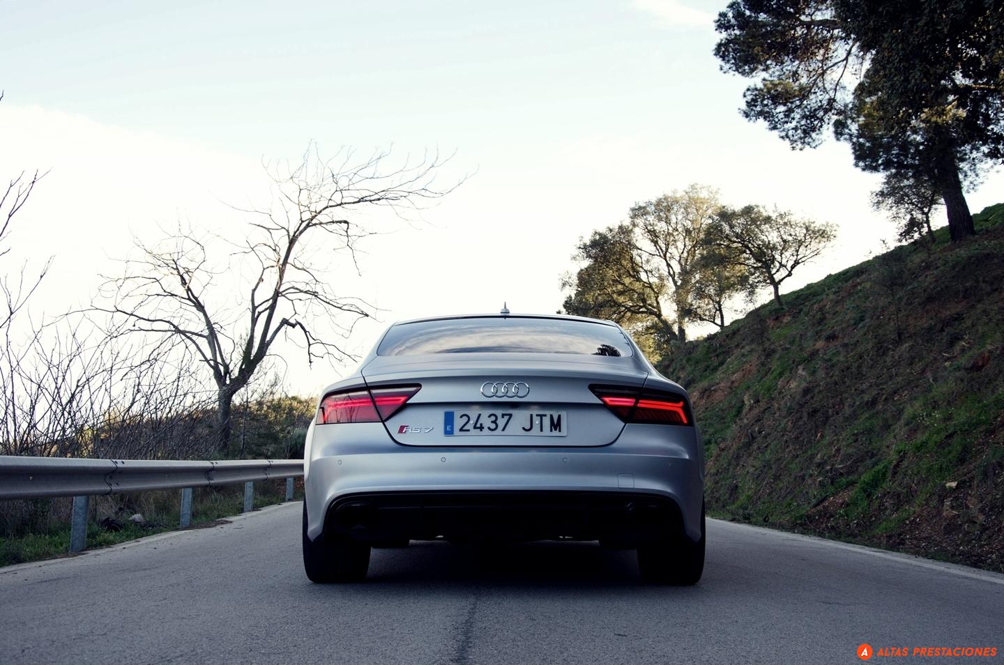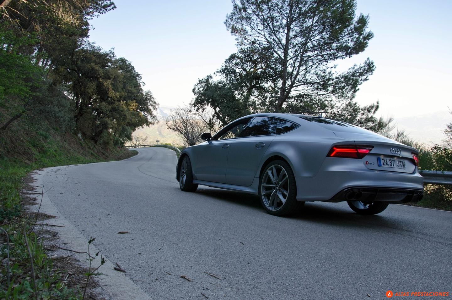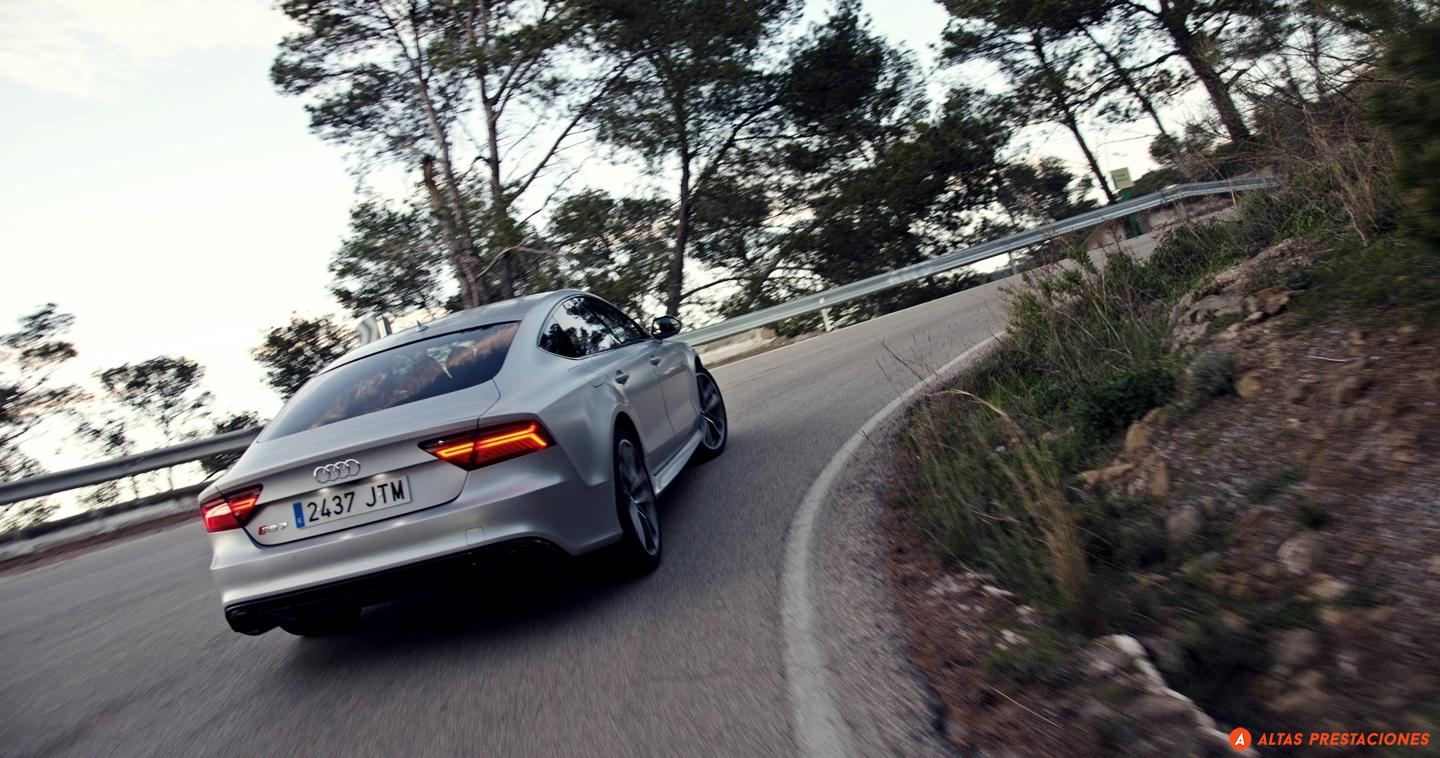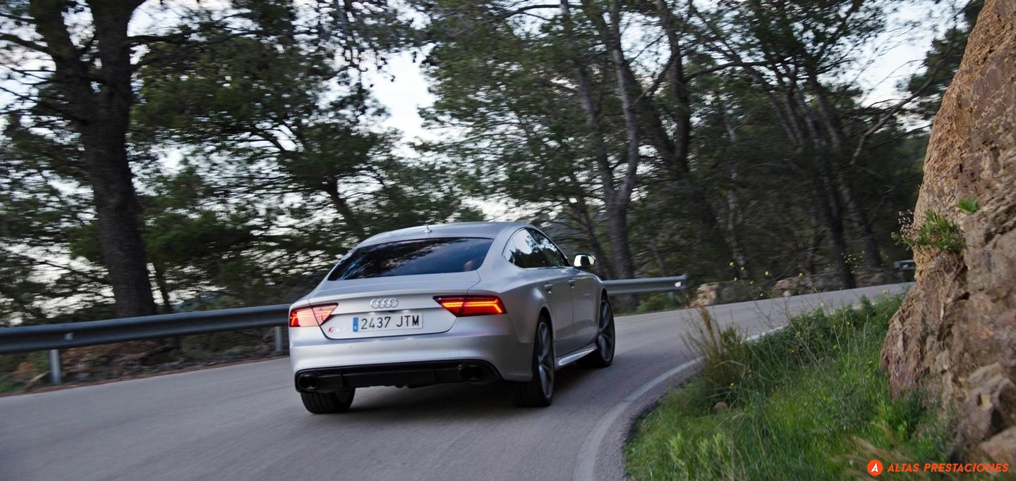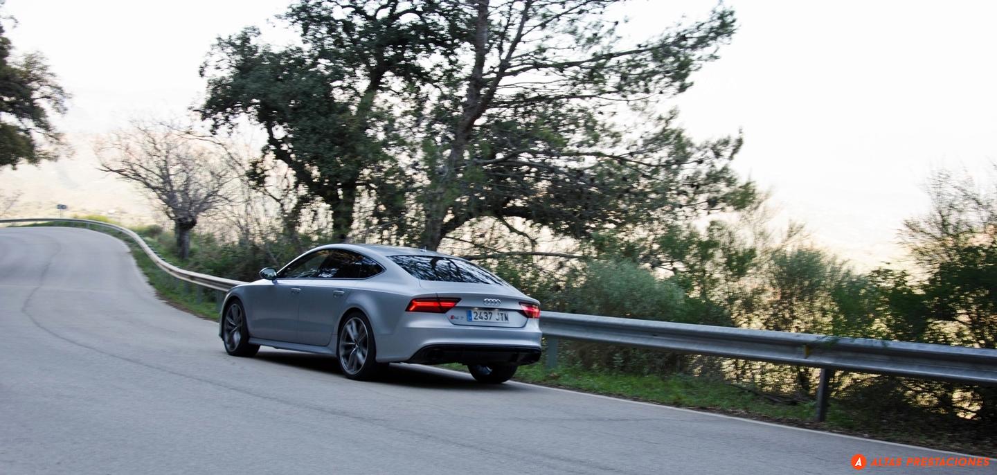 Tras unos metros recorridos el RS 7 muestra su primera faceta viajando en modo «Auto», es un RS pero no se comporta como un coche excesivamente duro o radical que te obliga a ir peléandote con él en el agobiante tráfico urbano. Goza de esa múltiple personalidad que lo convierten en el deportivo de uso a diario. Dejada atrás la ciudad me animo a ir subiendo el ritmo para tantear su transmisión automática de 8 relaciones (por convertidor de par) y su sistema de tracción total quattro. Poco a poco, curva a curva el RS 7 se va destapando y yo cada vez me siento más cómodo. Es dócil, que no manso. Es ágil pese a su enorme tamaño y peso. Pero sobre todo goza de una mecánica V8 que no dudo en tildar como una de las mejores que existe en el mercado.