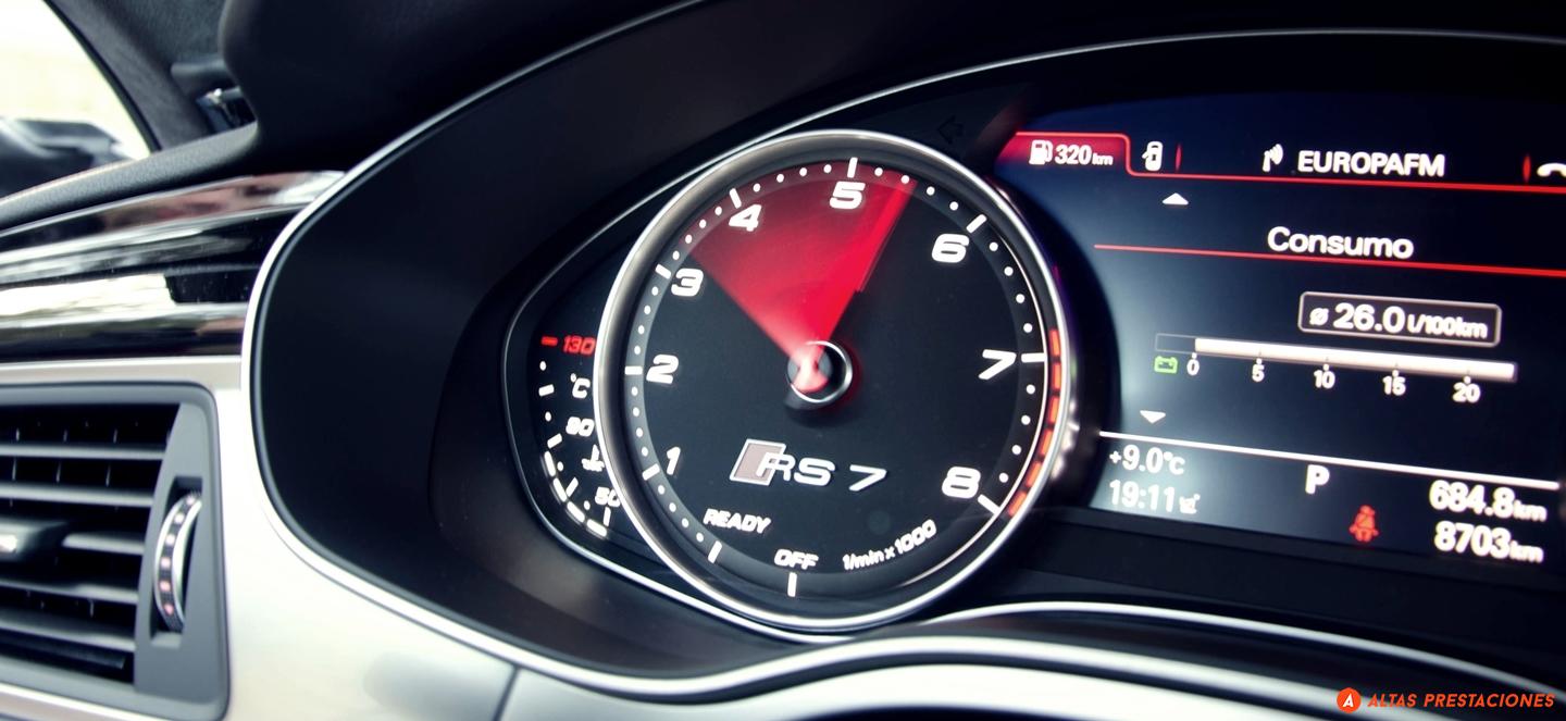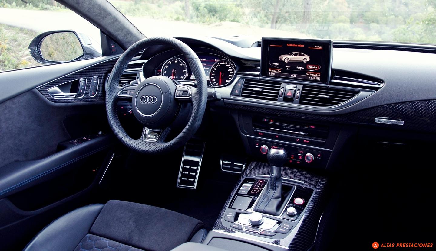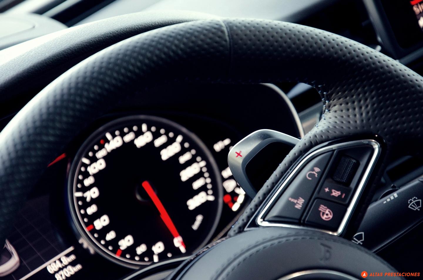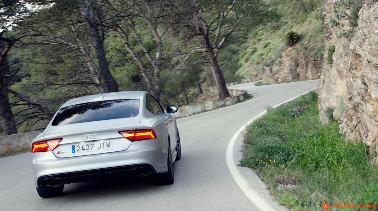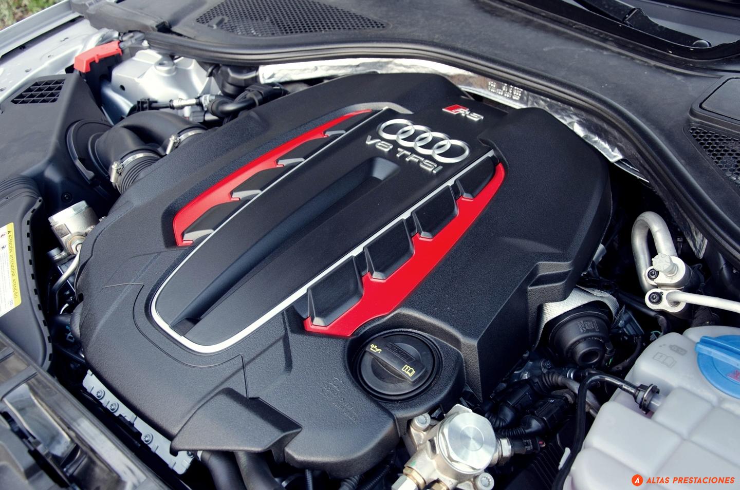 Tras unos metros recorridos el RS 7 muestra su primera faceta viajando en modo «Auto», es un RS pero no se comporta como un coche excesivamente duro o radical que te obliga a ir peléandote con él en el agobiante tráfico urbano. Goza de esa múltiple personalidad que lo convierten en el deportivo de uso a diario. Dejada atrás la ciudad me animo a ir subiendo el ritmo para tantear su transmisión automática de 8 relaciones (por convertidor de par) y su sistema de tracción total quattro. Poco a poco, curva a curva el RS 7 se va destapando y yo cada vez me siento más cómodo. Es dócil, que no manso. Es ágil pese a su enorme tamaño y peso. Pero sobre todo goza de una mecánica V8 que no dudo en tildar como una de las mejores que existe en el mercado.