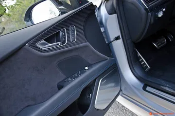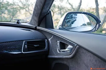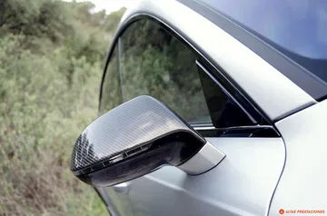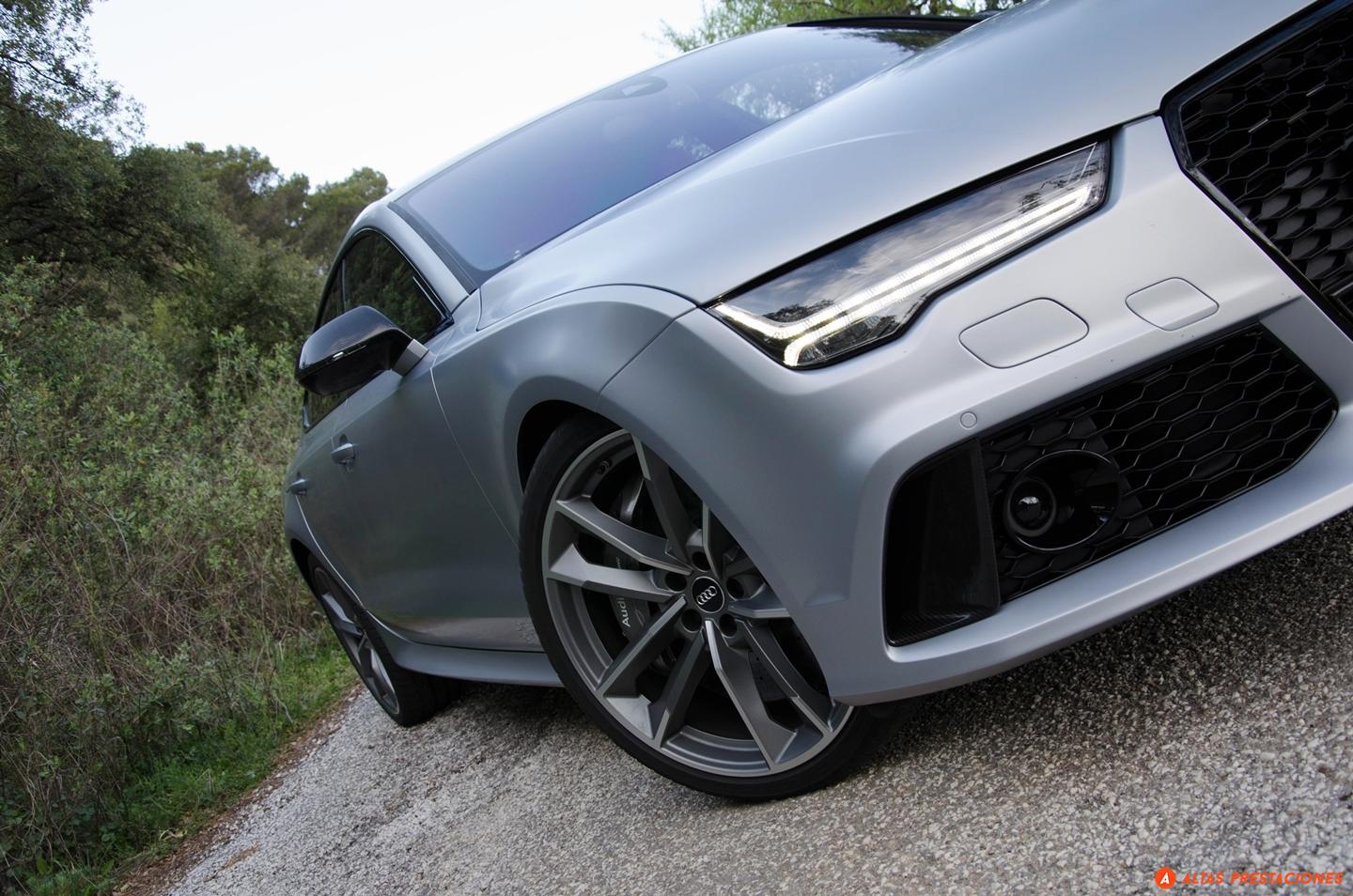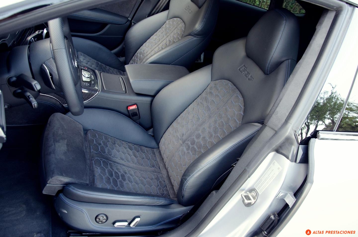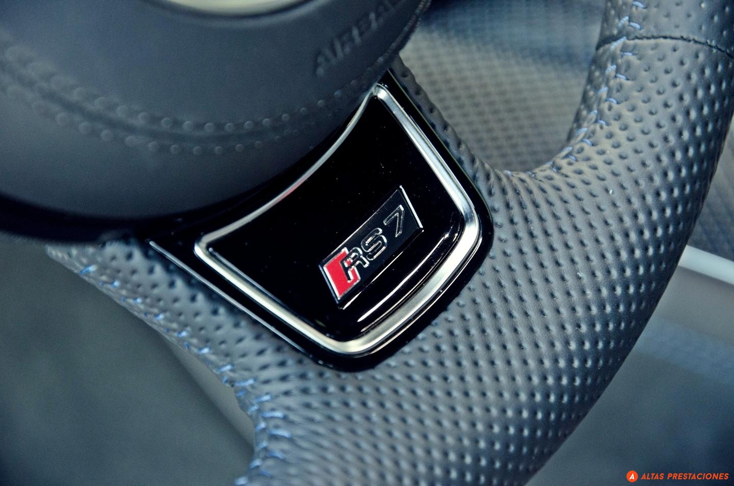 Me acerco de a poco a él mientras la luz ambiental se difumina por sus líneas de coupé y sus prominentes llantas donde se cobijan frenos carbocerámicos que perfectamente podría emplear cualquier montura de GT3. En parado el RS 7 se muestra elegante pero ni a pesar de su sutileza oculta lo musculoso de su diseño, las prominentes aletas o entradas de aires, ni por supuesto su rabioso carácter con semejante motor V8 escondido bajo el capó.