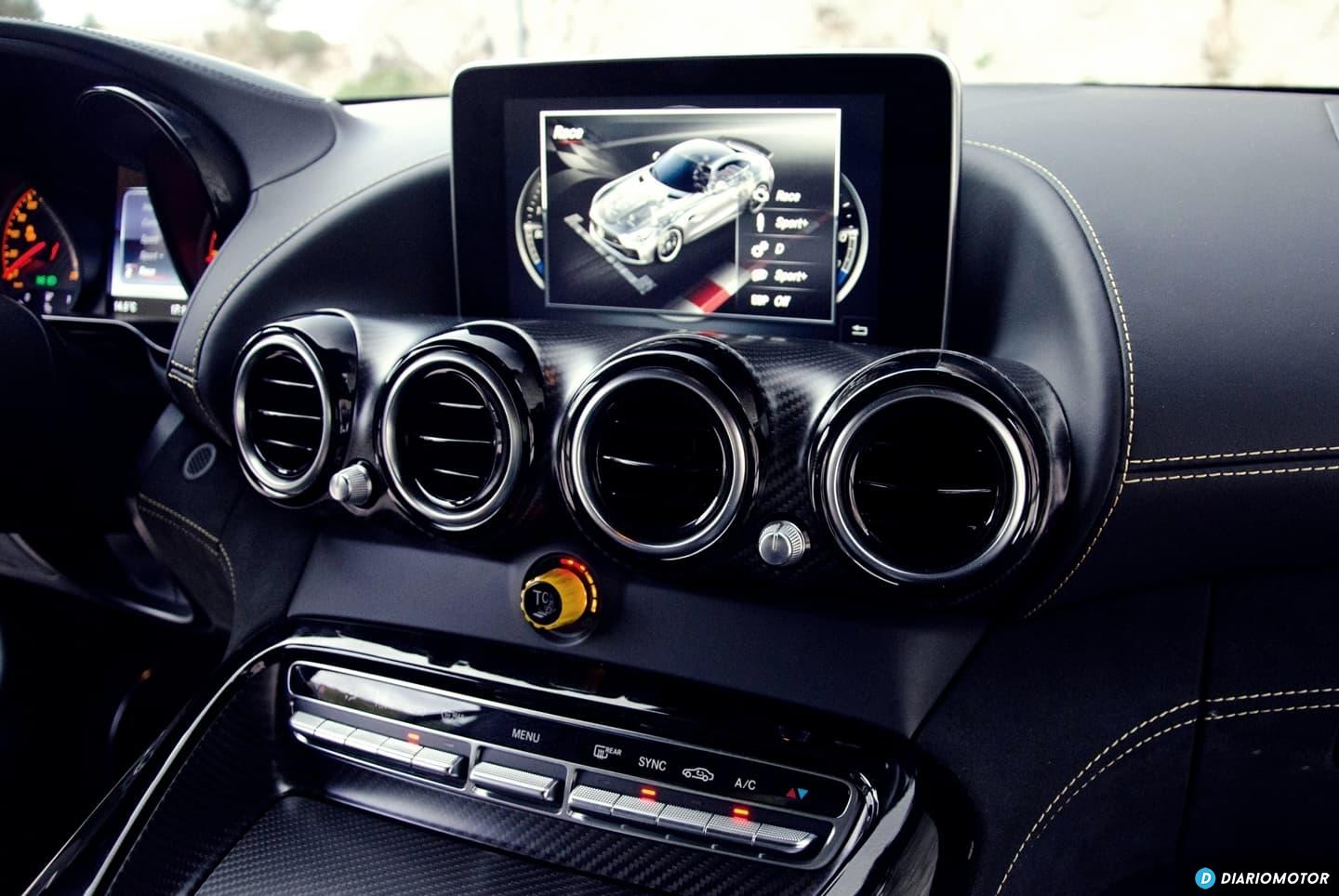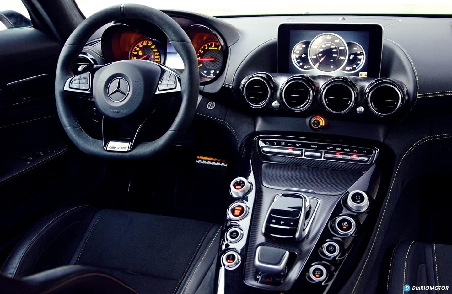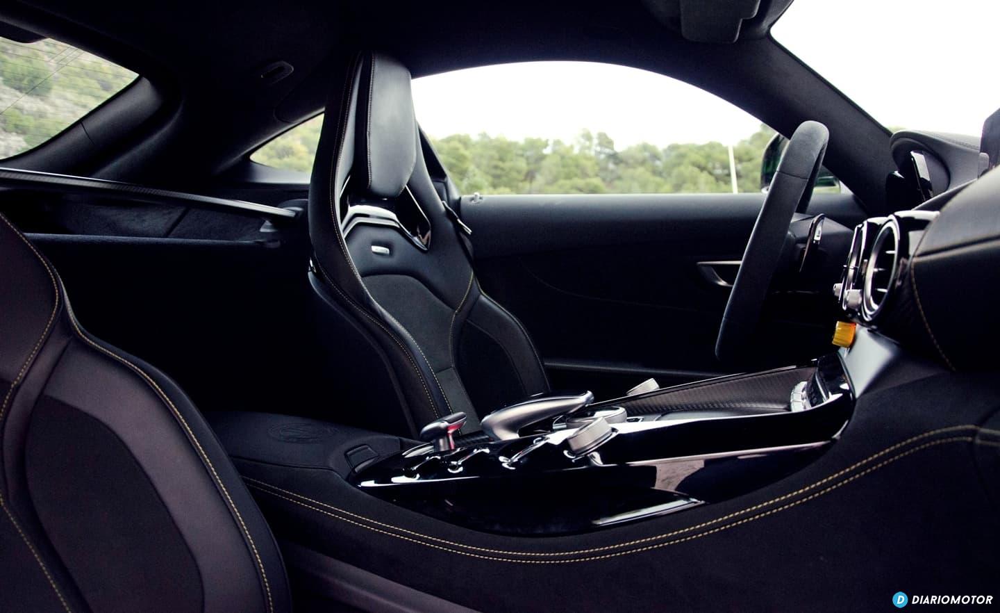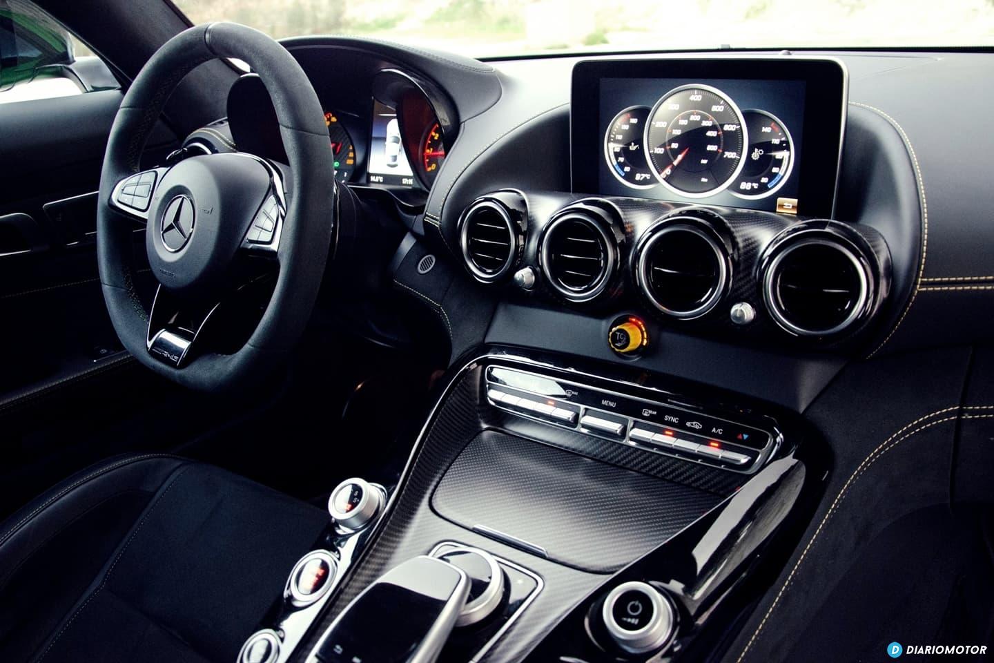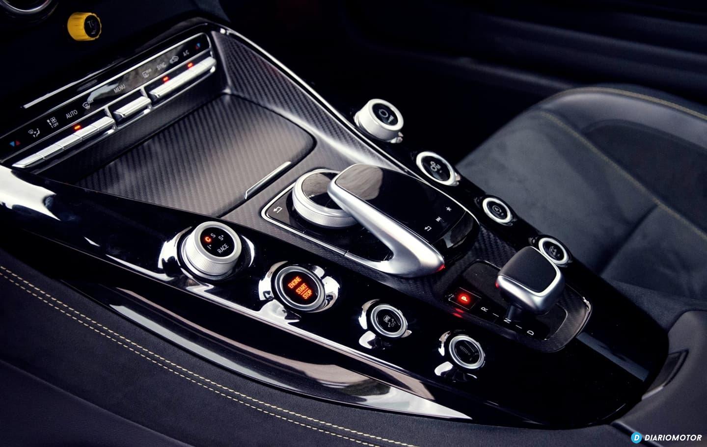Y sumergidos en el interior nos encontramos con uno de los habitáculos más deportivos del momento, también uno de los que más luces y sombras ofrece. Me explico. Mercedes-AMG ha condicionado la habitabilidad del interior a la ubicación de su motor V8 en posición central y del cambio sobre el tren trasero. Esto obliga a que aparezca la enorme consola central, aprovechada eso sí para ubicar decenas de botones, mandos y controles que dan un aspecto muy llamativo y personal. Cuando nos cobijamos en sus baquets, de excelente factura eso sí, la sensación es de cierta claustrofobia ya que el espacio en anchura es reducido y la prominencia de la consola se hacen notar. El puesto de conducción está confeccionado para desarrollar la mejor experiencia para sus dos ocupantes, con el morro siempre protagonista y con una postura óptima para la conducción deportiva. Pero lo que echamos verdaderamente en falta en el habitáculo del GT R es la presencia de mayor identidad por parte AMG, pues todos los mandos provienen de otros modelos Mercedes y algunos materiales no casan con el estatus de este coche que supera holgadamente los 200.000 euros en esta unidad. Son detalles, no de vital relevancia, pero sí a tener en cuenta para futuras revisiones del modelo.