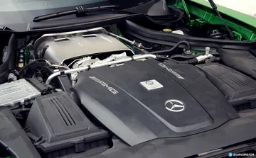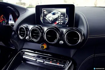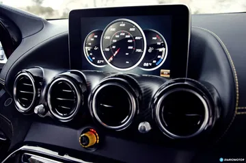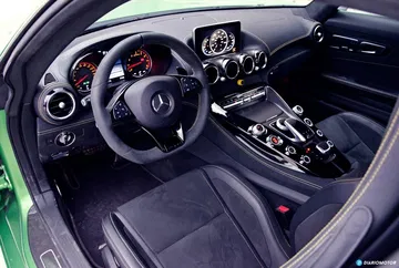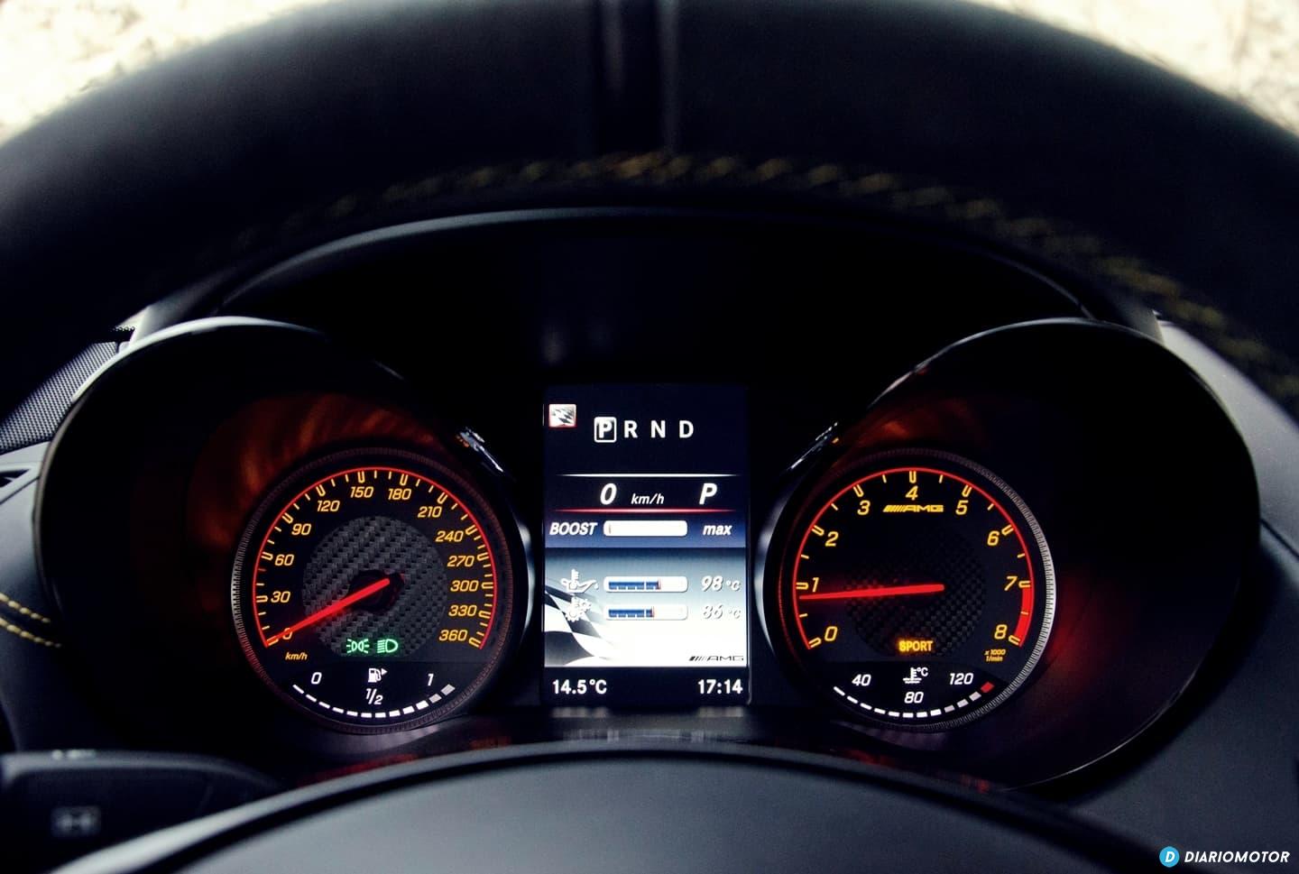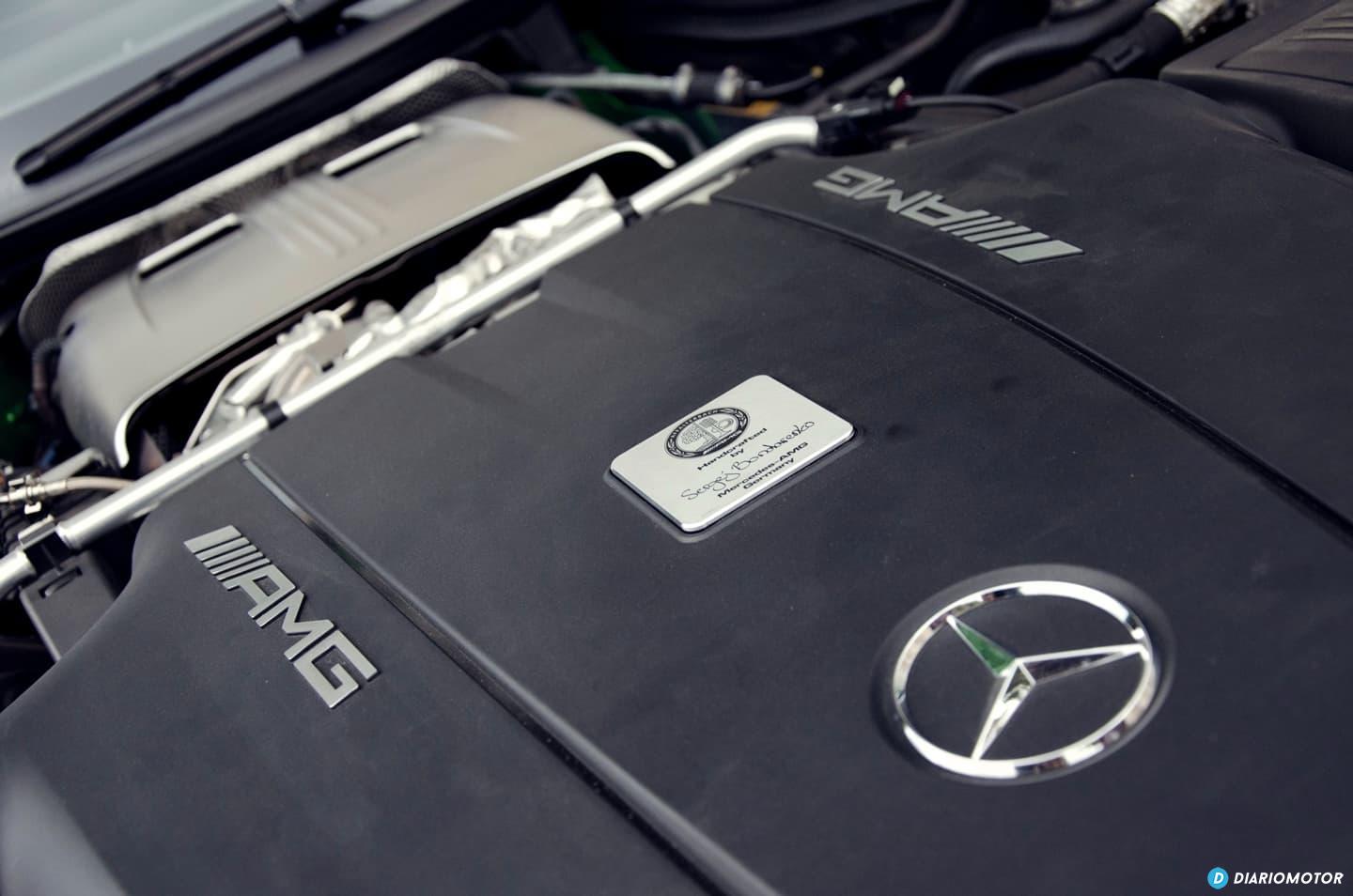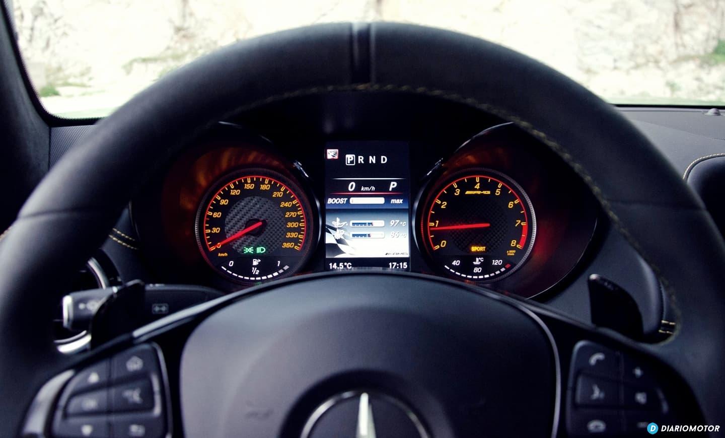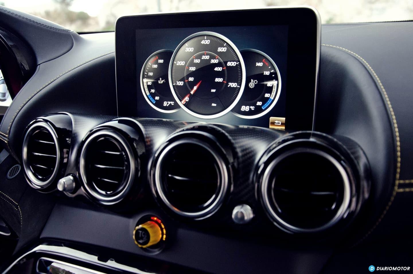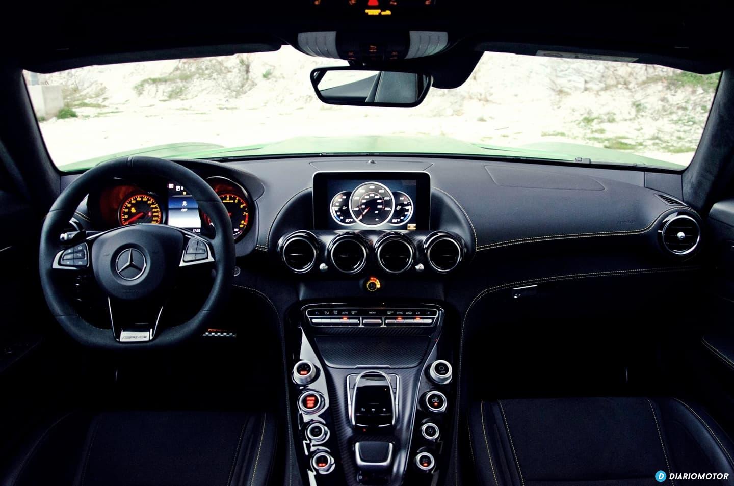 Y sumergidos en el interior nos encontramos con uno de los habitáculos más deportivos del momento, también uno de los que más luces y sombras ofrece. Me explico. Mercedes-AMG ha condicionado la habitabilidad del interior a la ubicación de su motor V8 en posición central y del cambio sobre el tren trasero. Esto obliga a que aparezca la enorme consola central, aprovechada eso sí para ubicar decenas de botones, mandos y controles que dan un aspecto muy llamativo y personal. Cuando nos cobijamos en sus baquets, de excelente factura eso sí, la sensación es de cierta claustrofobia ya que el espacio en anchura es reducido y la prominencia de la consola se hacen notar. El puesto de conducción está confeccionado para desarrollar la mejor experiencia para sus dos ocupantes, con el morro siempre protagonista y con una postura óptima para la conducción deportiva. Pero lo que echamos verdaderamente en falta en el habitáculo del GT R es la presencia de mayor identidad por parte AMG, pues todos los mandos provienen de otros modelos Mercedes y algunos materiales no casan con el estatus de este coche que supera holgadamente los 200.000 euros en esta unidad. Son detalles, no de vital relevancia, pero sí a tener en cuenta para futuras revisiones del modelo.