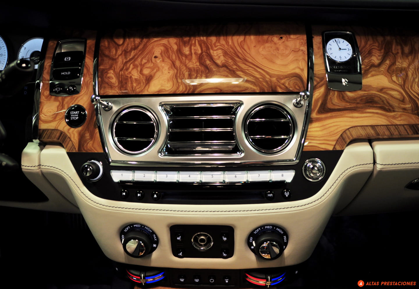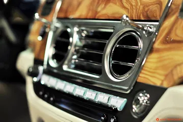 Al abrir la enorme puerta se descubre que detrás de ese aspecto monumental está el tesoro que todo Rolls-Royce custodia: un inmenso refugio del mundo que lo rodea. La revista Autocar, en su prueba del Silver Ghost en 1907 afirmaba “a cualquier velocidad que se conduzca, en el coche no se oye un ruido mayor que el de un reloj de cuerda”. Casi 110 años después los coches que circulan por la calle son más silenciosos y están mejor insonorizados que nunca así que me pregunto cómo podrá destacar el Ghost en esto. Cuando se cierra la puerta un leve siseo del mecanismo que ajusta la cerradura parece vaciar el coche de sonidos del exterior y descubre la primera virtud de este Ghost: un aislamiento sonoro que muchos quisiéramos para nuestros pisos, y que se hace aún más impactante por la sensación de espacio que transmite la gran superficie acristalada y la tapicería Seashell de esta unidad. Dedico un momento a encontrar la postura correcta al volante en los cómodos asientos (ventilados y con masaje), hasta que estoy listo. Echo una mirada alrededor, respiro hondo y pulso el botón del salpicadero que da vida al motor. Me preguntaba como sonaría el V12 6’6 litros biturbo que mueve a este enorme Rolls… pero desde el interior del coche el zumbido eléctrico que ajusta el volante es suficiente para enmascarar al del propulsor, y sus vibraciones son inexistentes… como si no hubiese motor. Al acariciar el acelerador por fin llega un lejano y ronco sonido que nos confirma que, efectivamente, el V12 ha despertado y está dispuesto a llevarnos a nuestro viaje en el tiempo… Ponemos la fina palanca del cambio en D y comenzamos a movernos por Madrid tan silenciosos como un fantasma.