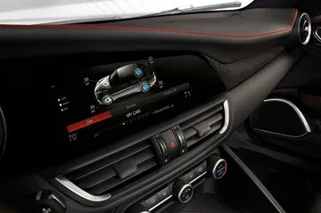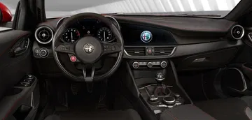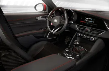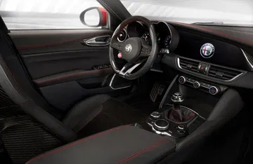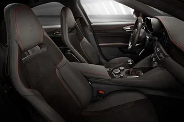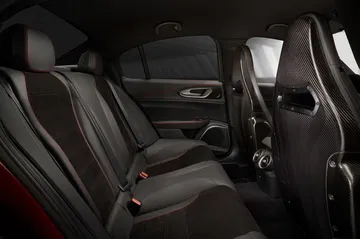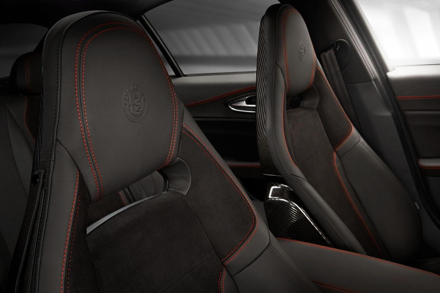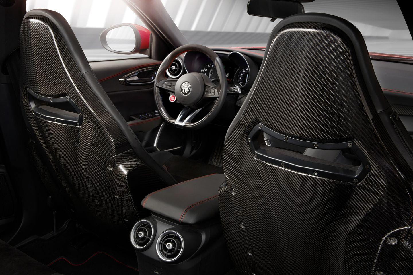 Los asientos deportivos opcionales son semibácquets acabados en fibra de carbono. El Giulia QV pesa sólo 1.530 kg, a pesar de sus 510 CV de potencia.