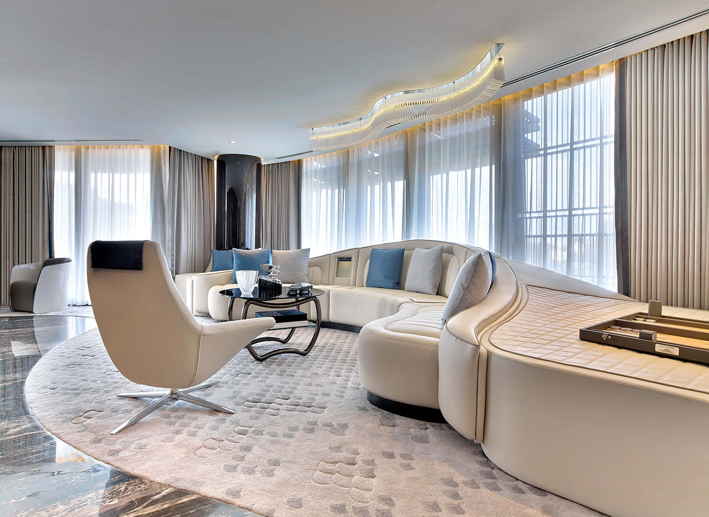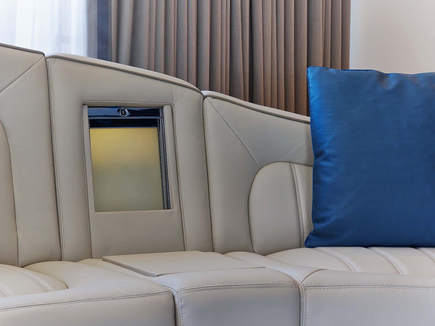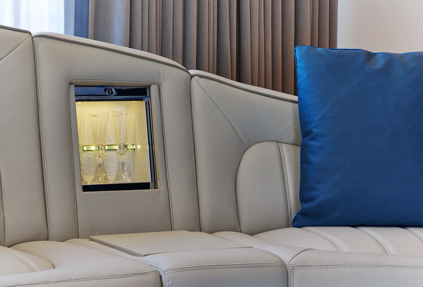Entre otros detalles, basta contemplar el receptáculo para las copas de champán instalado en el inmenso sofá de la sala de estar, siguiendo el estilo de la banqueta trasera de un Bentley Flying Spur. Sofá que ha sido tapizado con una trama de rombos, con pieles nobles, como las que revisten el cabecero de la cama y los asientos de un Bentley. Tras el mueble bar, relojes Breitling; para mantener agradable el ambiente, humificadores creados por Bentley en Crewe; pantallas LED de 55″; lámparas de diseño; domótica controlada desde un iPad…