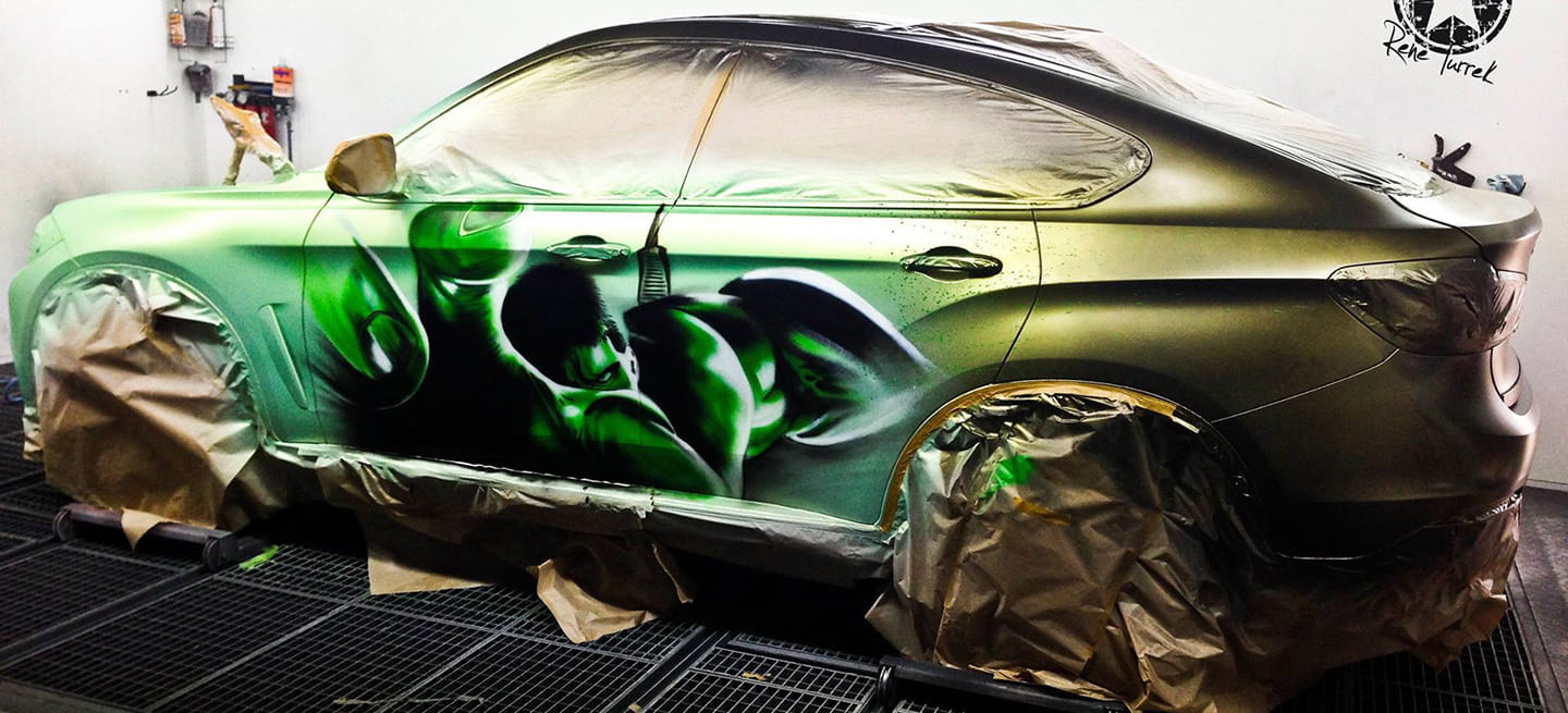 Rene Turrek decidió decorar un BMW X6 con un acabado de pintura termocrómico. De manera que el frío hace que su carrocería abandone el tono azul mate original para que aparezca un graffiti con el emblema HULK y una decoración mucho más exótica, con la cara de un monstruo verde sobre el capó, que no pasará desapercibido. Es por eso que esta preparación fue bautizada como el Increíble Hulk.