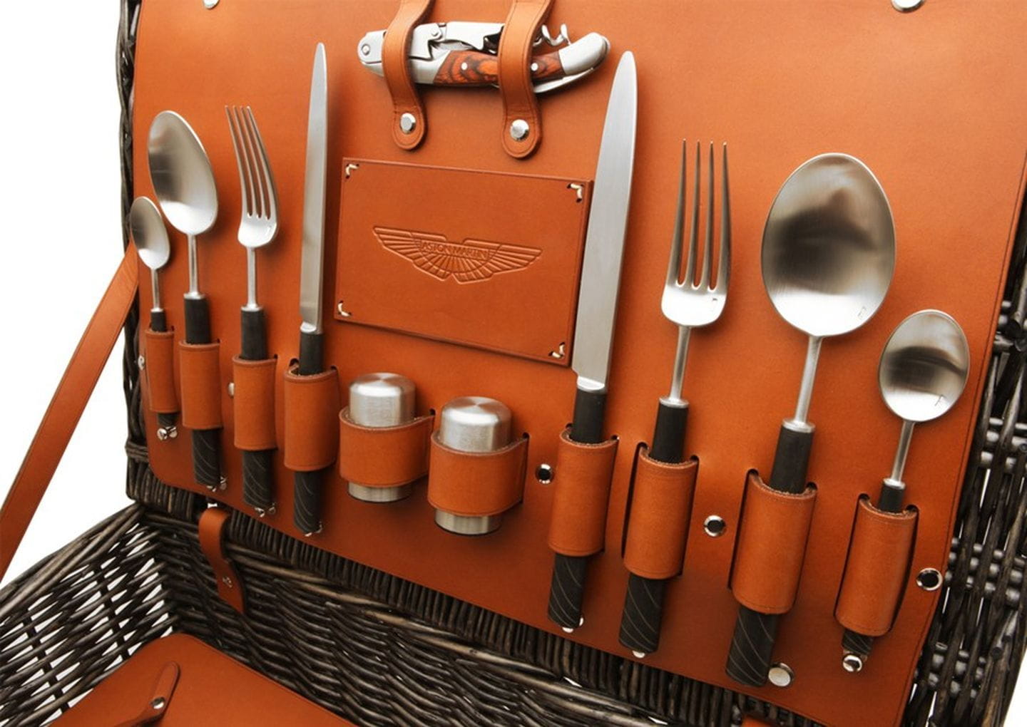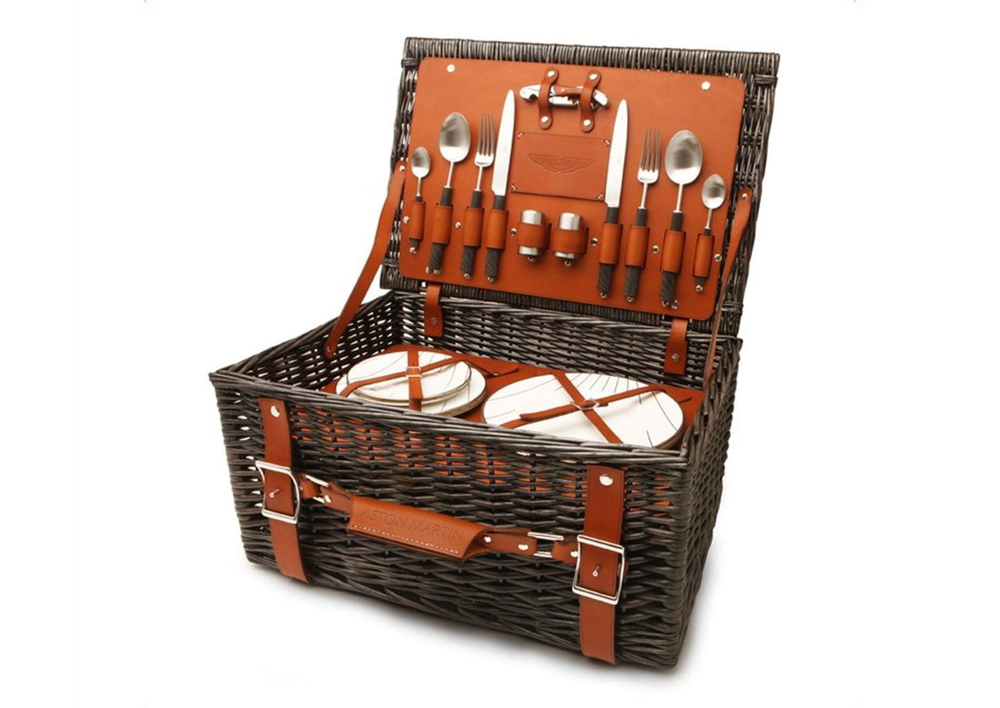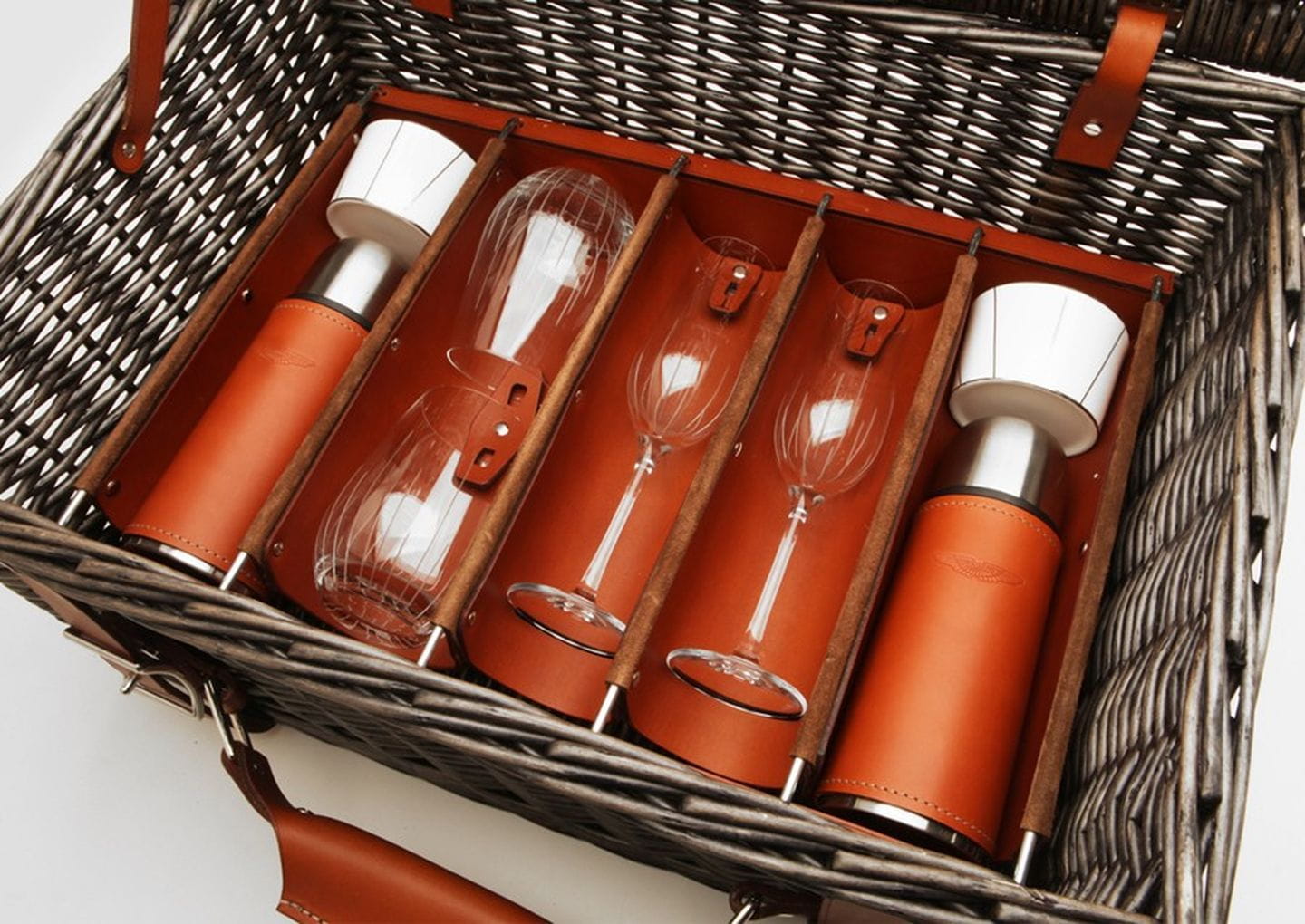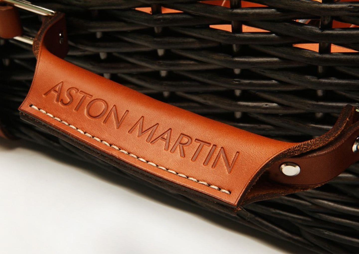 La cesta ha sido producida artesanalmente en Reino Unido. Construida en mimbre trenzado a mano, destaca el cuero usado para fijar los más de 35 accesorios que incluye en su interior. Este cuero se puede encargar en diferentes colores que encajen con nuestro coche, y además tiene el logotipo de Aston Martin en su asa. Entre los accesorios se cuentan varios platos de la mejor porcelana, dos vasos y dos copas de cristal de Bohemia, un set de cubertería o dos elegantes termos, forrados en un cuero muy elegante.