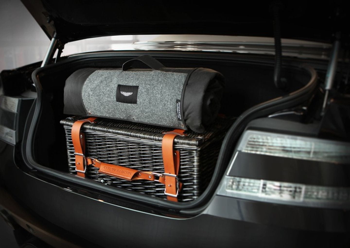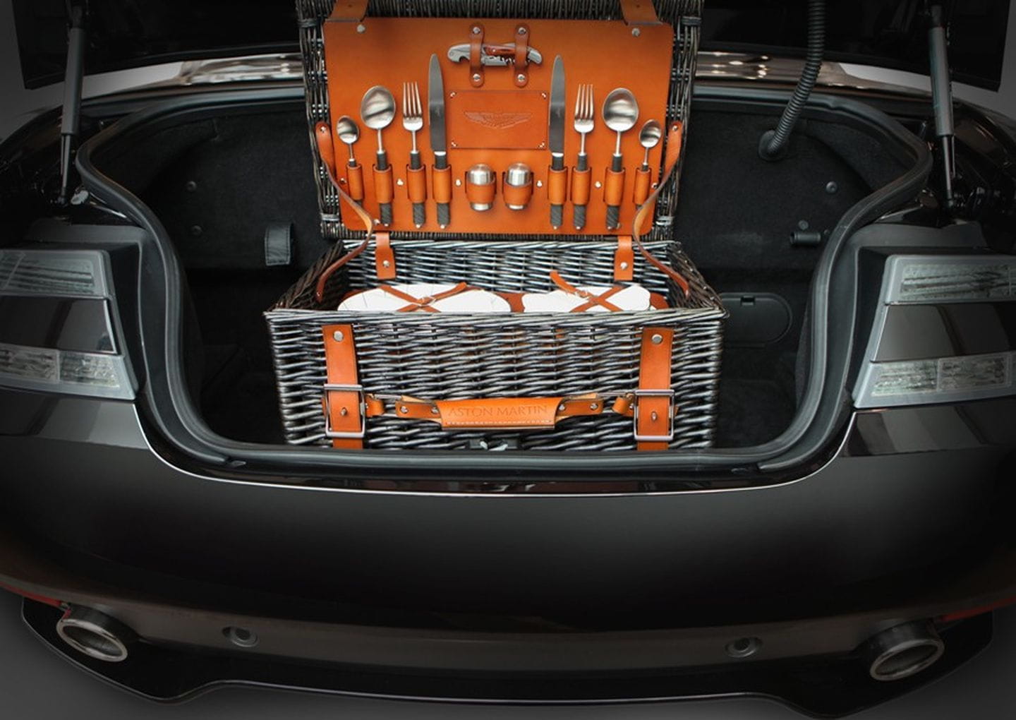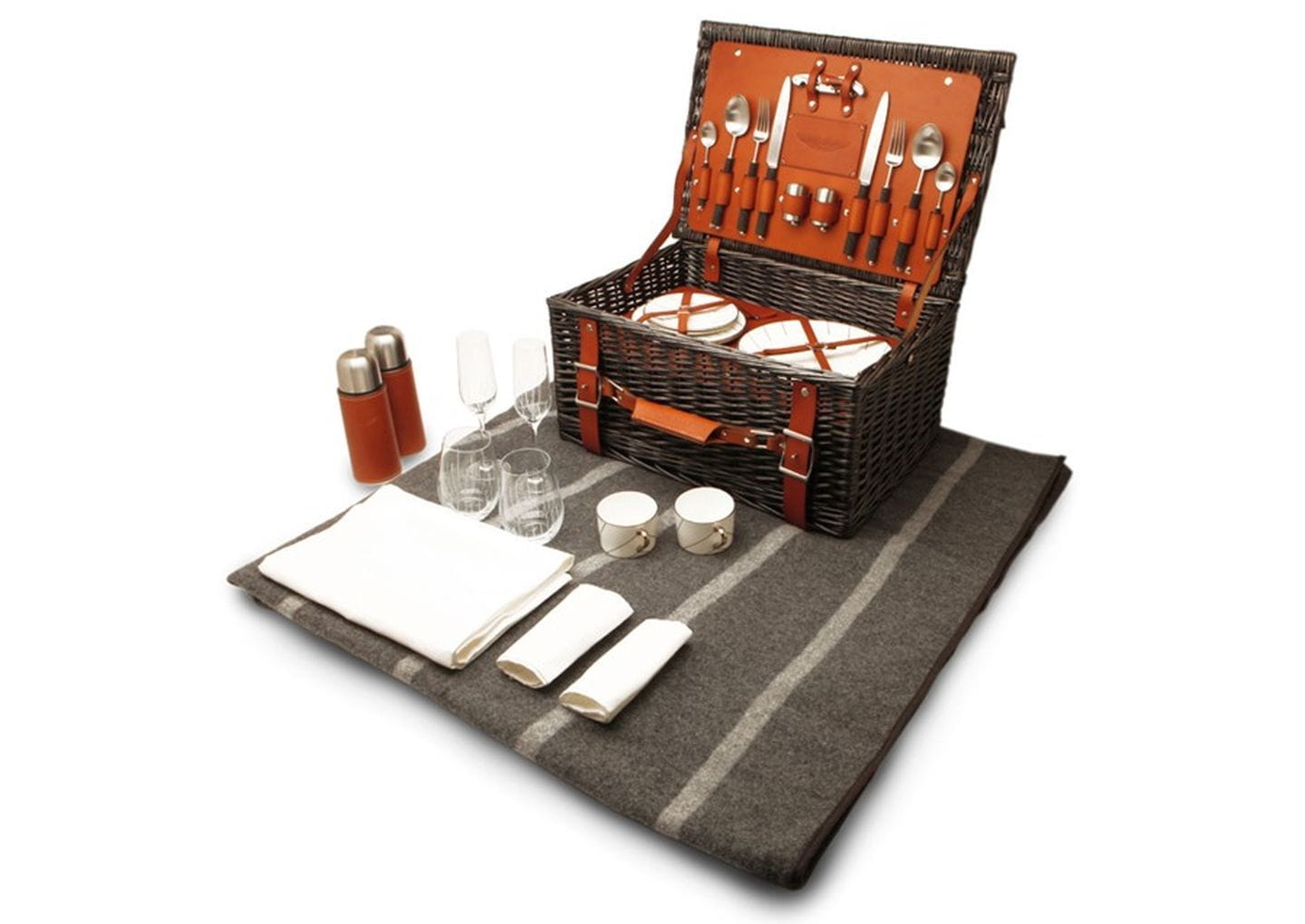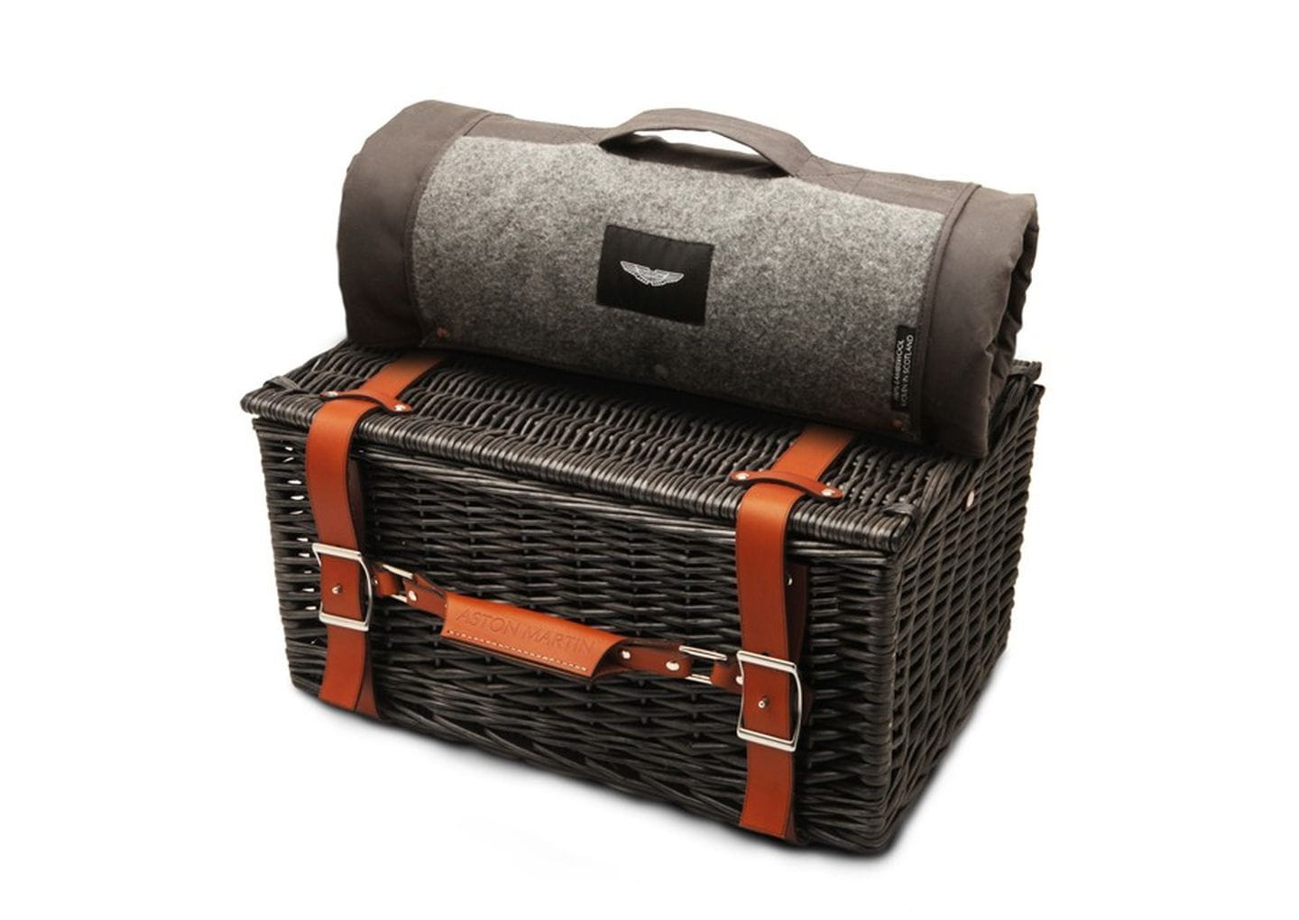 La cesta ha sido producida artesanalmente en Reino Unido. Construida en mimbre trenzado a mano, destaca el cuero usado para fijar los más de 35 accesorios que incluye en su interior. Este cuero se puede encargar en diferentes colores que encajen con nuestro coche, y además tiene el logotipo de Aston Martin en su asa. Entre los accesorios se cuentan varios platos de la mejor porcelana, dos vasos y dos copas de cristal de Bohemia, un set de cubertería o dos elegantes termos, forrados en un cuero muy elegante.