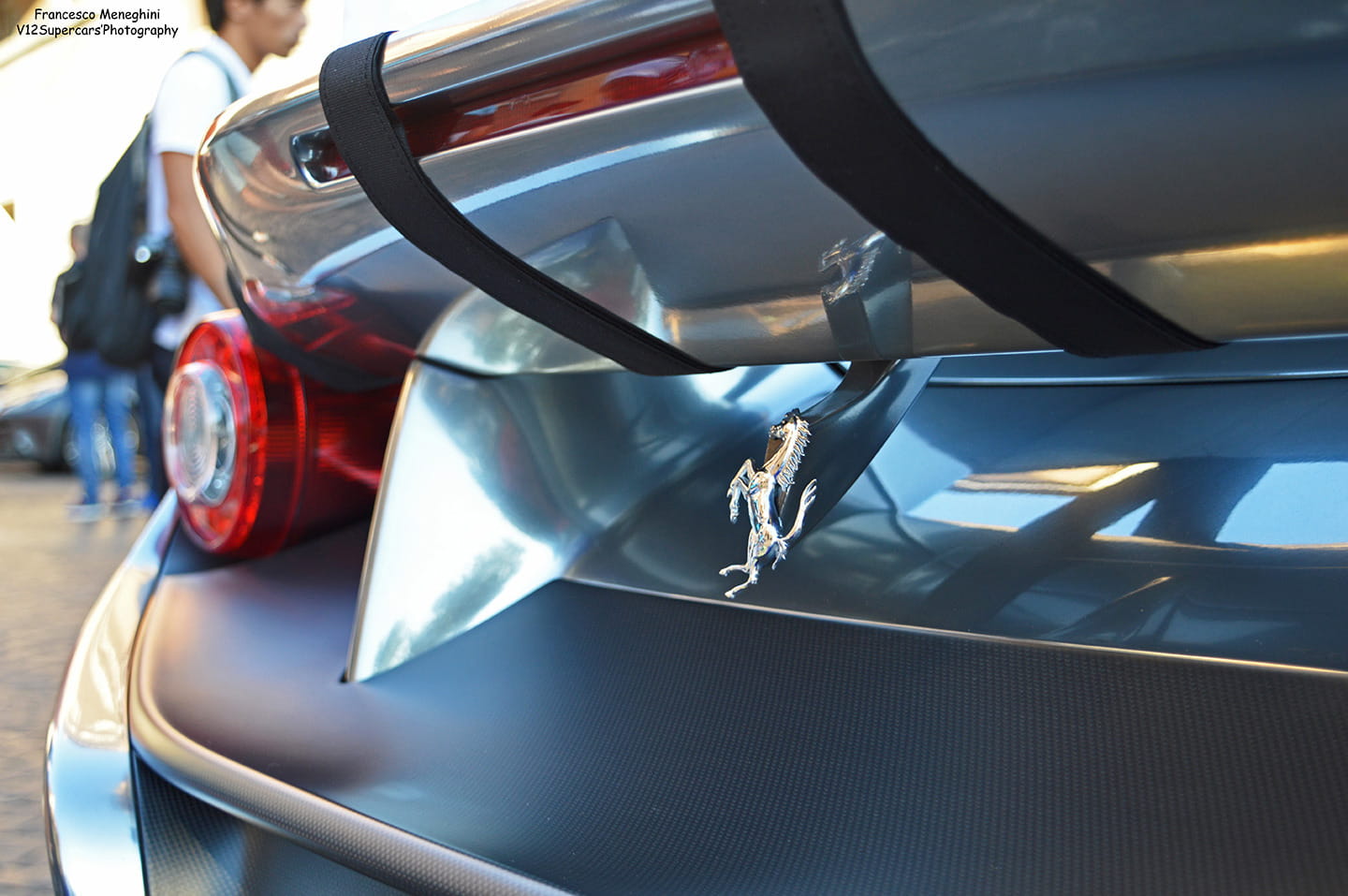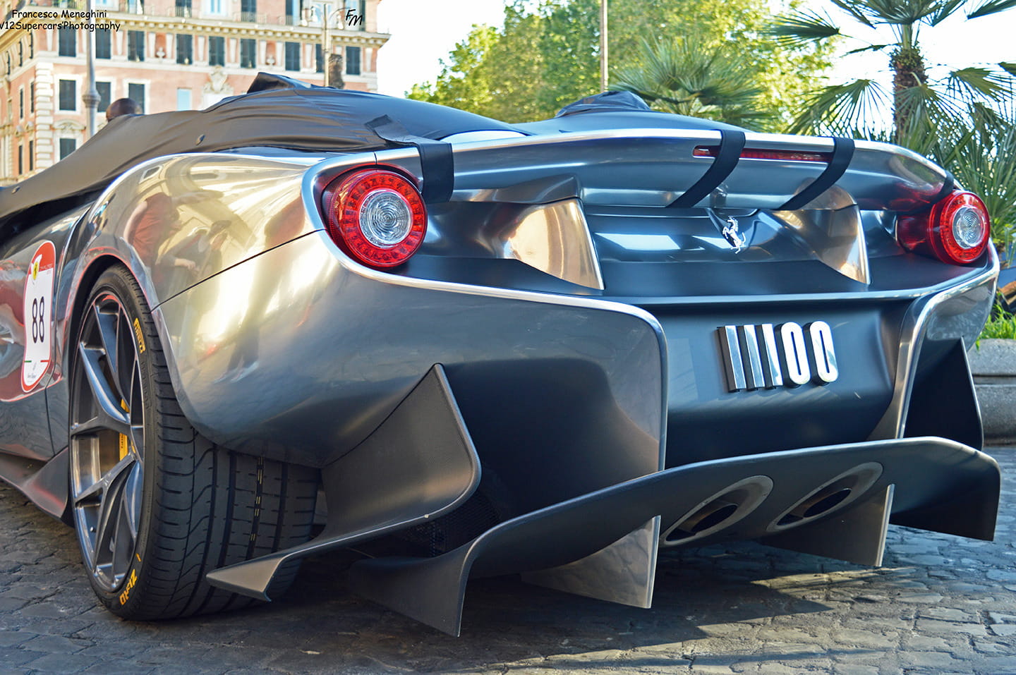 Las formas esculturales del capó, aún más agresivo, en el frontal, habrían sido perfiladas precisamente para que bastase con una lámina de plexiglass para permitirnos la visión del motor V12 que se esconde en su interior. En esta unidad, con un acabado de carrocería en gris plata, directamente se habría prescindido de lámina de plexiglass.