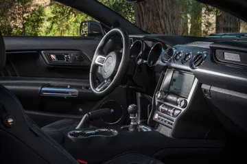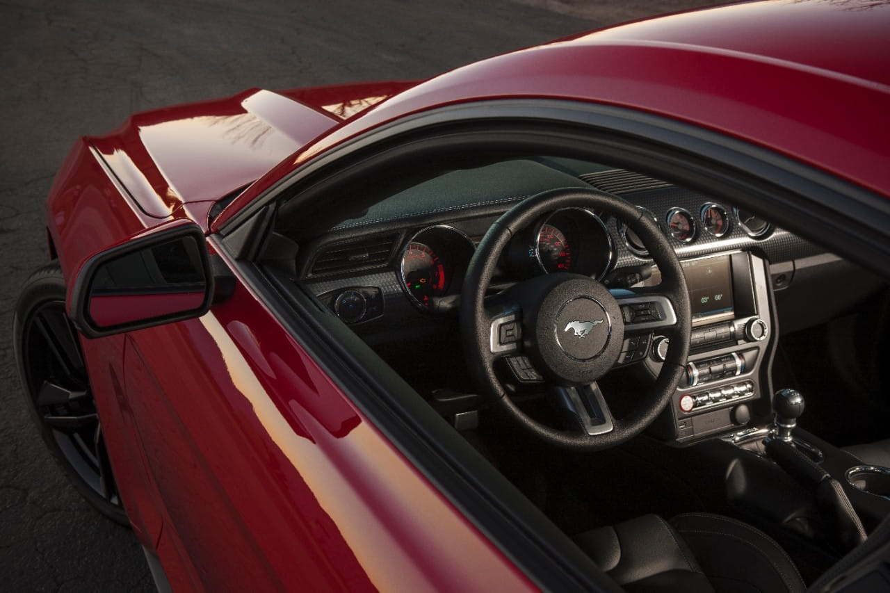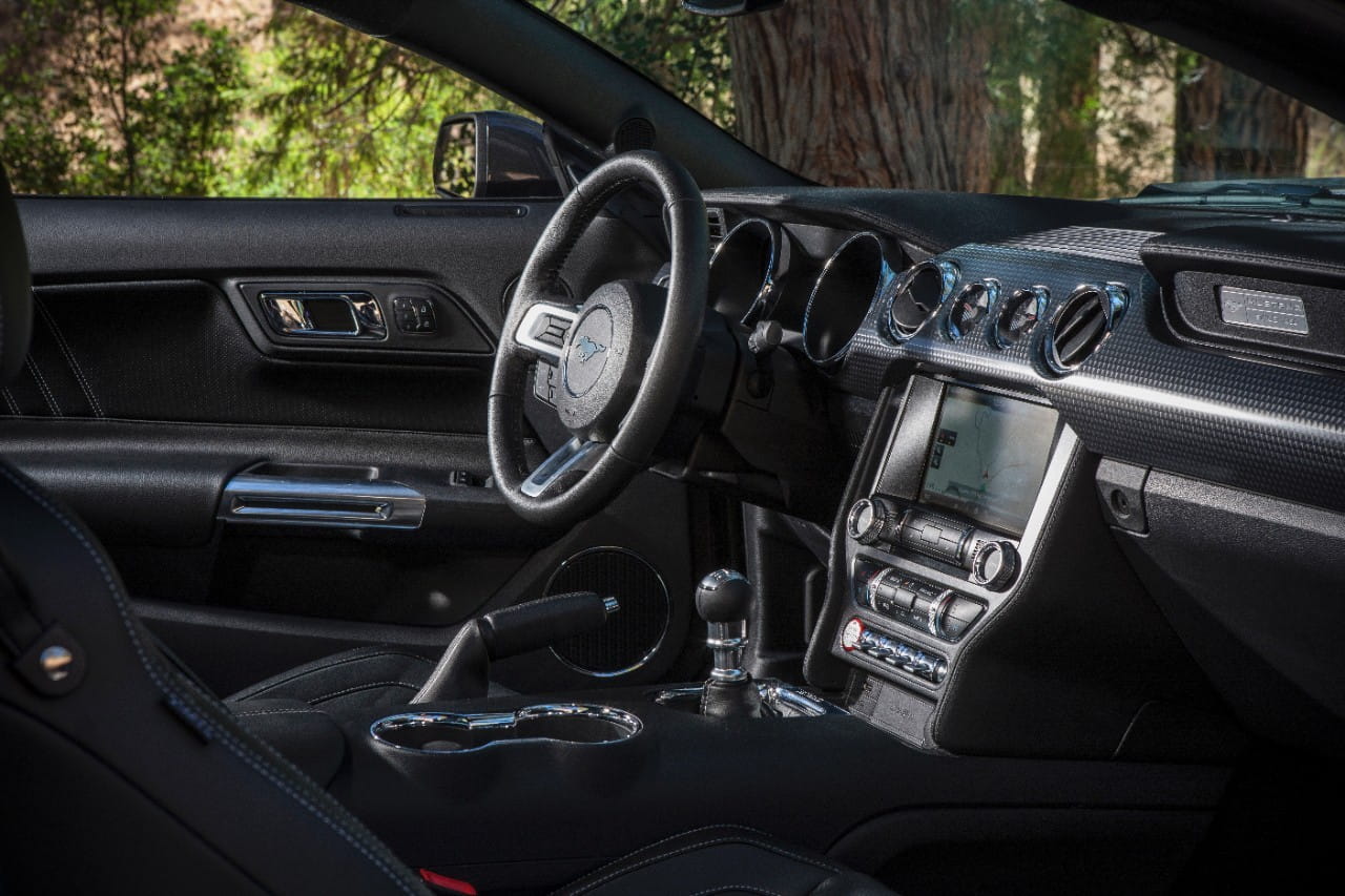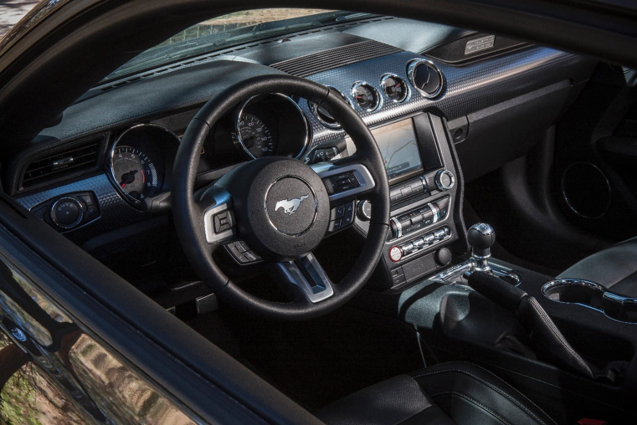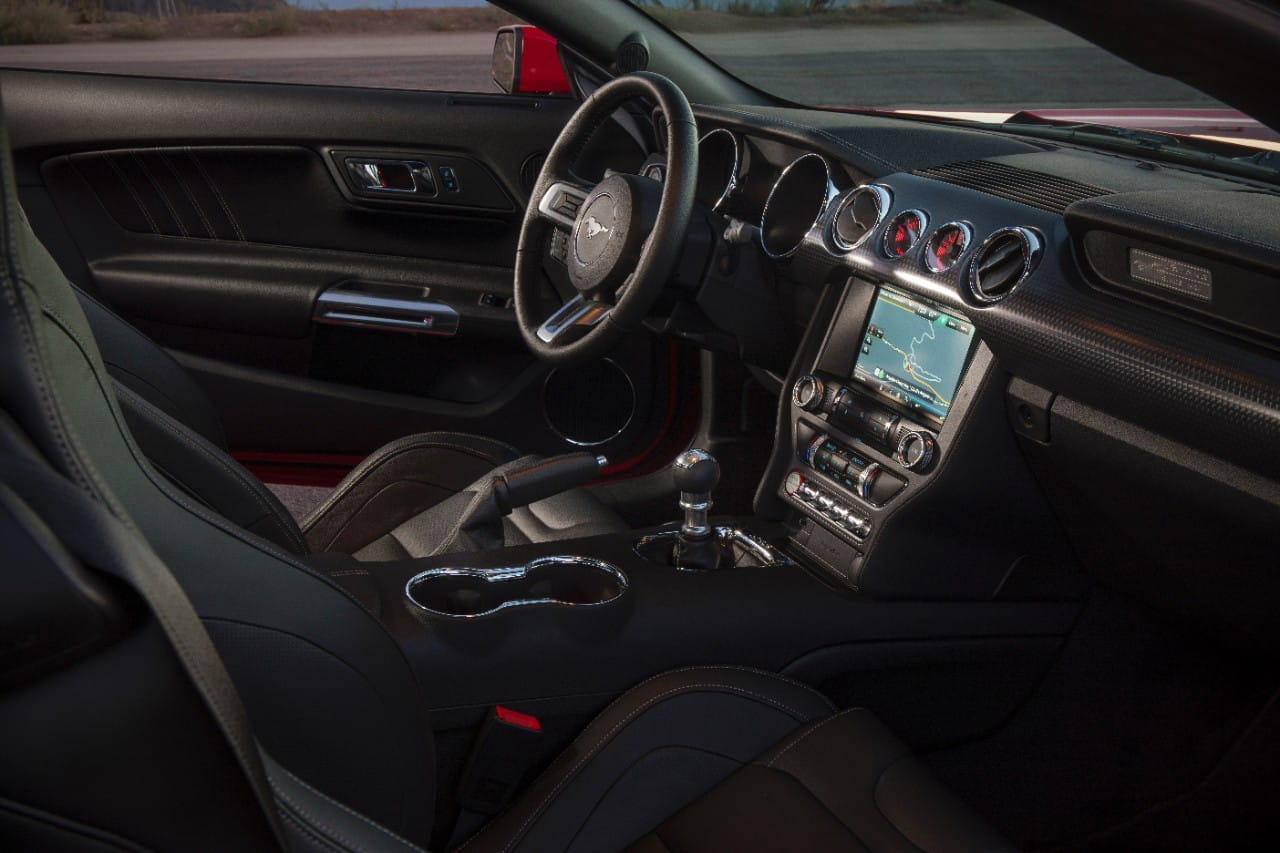 Su interior mantiene la línea de diseño del Musstang saliente, pero mejora aparentemente los acabados, aumentando también la dotación de tecnología a bordo.