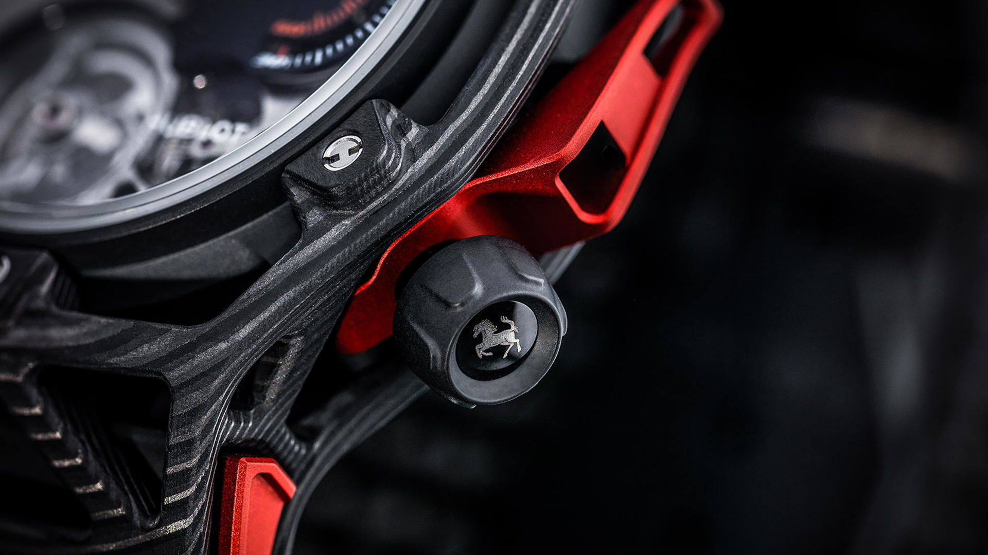 Aderezando este esqueleto, que inevitablemente nos evoca a la estructura primigenia de un superdeportivo, nos topamos con dos pulsadores encargados de liberar rápidamente la correa y una palanca que al igual que estos pulsadores se presentan con un acabado rojo. Además en la corona, acabada en titanio, reposa el cavallino rampante de Ferrari.