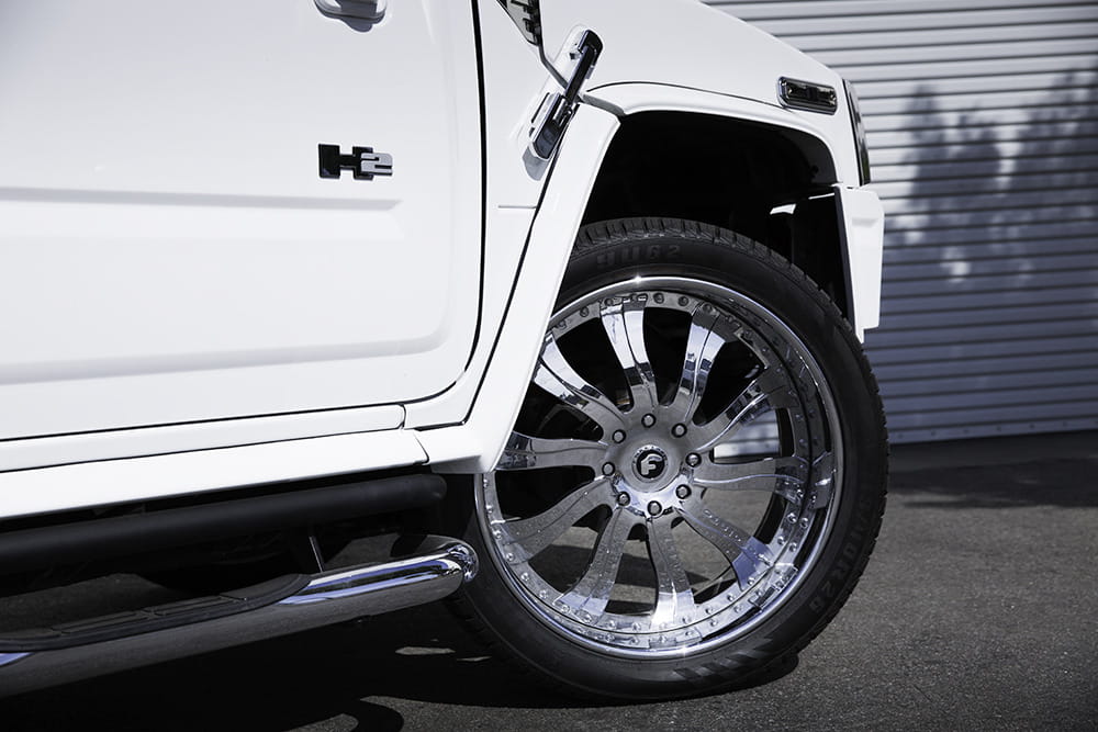Te lo creas o no, 24″ no es una medida demasiado estrafalaria para Forgiato. En el pasado han llegado incluso a montar 34″ en un Hummer. Forgiato cuenta incluso con una línea de llantas, entre 22″ y 24″, creada específicamente para vehículos todoterreno. Según sus creadores, han sido diseñadas con aleaciones de aluminio capaces de resistir grandes cargas. Pero evidentemente una llanta como la que utiliza este Hummer no es lo idóneo, ni mucho menos, para enfrentarse a pistas de campo complejas. Forgiato también nos mostró uno de los vídeos más doloroso que hemos visto hasta la fecha, el de una chica destrozando un Ferrari para enseñarnos sus llantas.