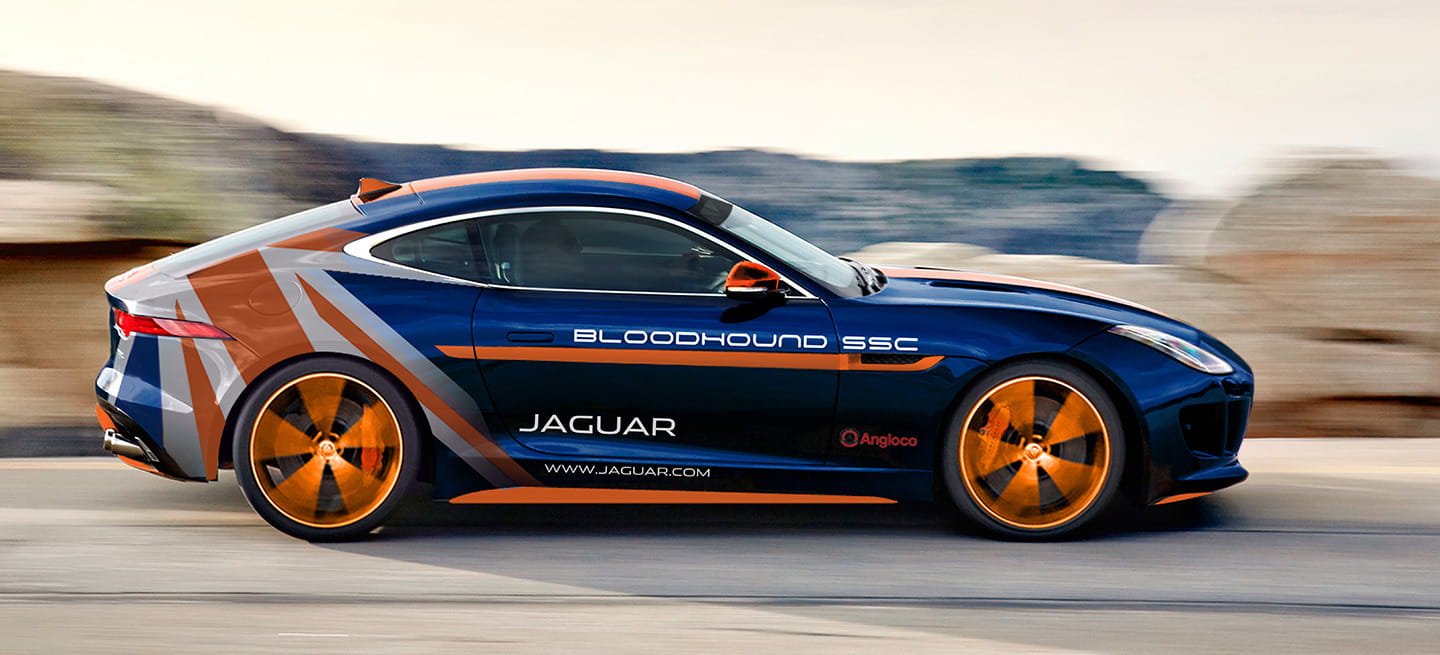 ¿Qué sucede con este Jaguar F-TYPE? ¿Por qué esa decoración? Jaguar ha firmado un acuerdo de colaboración con el proyecto Bloodhound World Land Speed Record, que para el que no lo conozca, es un proyecto que está creando una máquina que pretende conseguir el récord de velocidad en superficie superando las 1.000 mph (1.609 km/h) en 2016. Imaginaos lo que supone una proeza como esta. Un hito digno de los pioneros de antaño, de aquellos que quisieron llevar las posibilidades de la técnica a un nuevo nivel y superar barreras jamás alcanzadas por la humanidad. Pioneros que inspirarán a toda una generación de investigadores. Y Jaguar no quiso perder la oportunidad de estar presente en este reto.