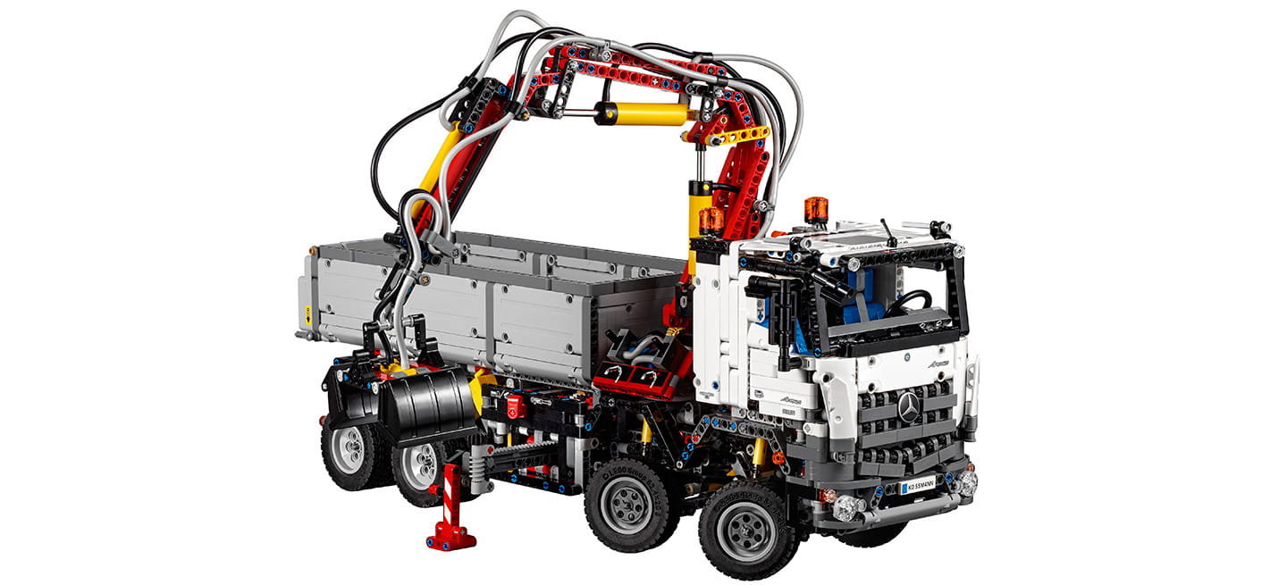 El camión Mercedes-Benz Arocs 3245 de LEGO mide 54 centímetros de largo, 14 centímetros de anchura y 31 centímetros de altura. No solo recrea fielmente el diseño de uno de los camiones más famosos de Mercedes-Benz, generalmente basado en un remolque de tipo volquete, sino también su funcionalidad. Este modelo dispone de cuatro ejes articulados y dotados de suspensiones, un elevador neumático, grúa articulada, volquete automático, etcétera.