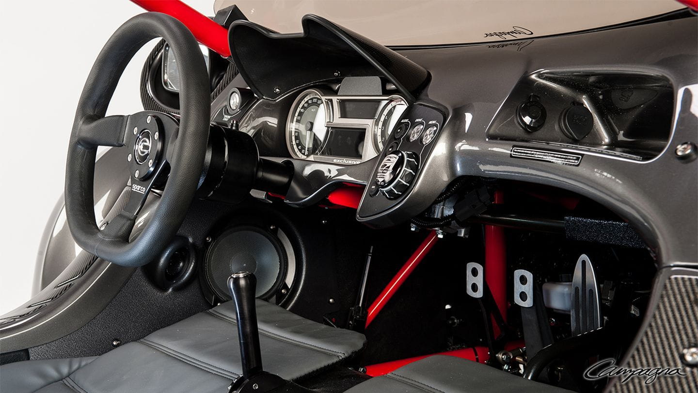 Aunque se defina técnicamente como triciclo, no debemos confundirlo con un trike. Un trike tiene dos ruedas atrás, reteniendo el motor y parte ciclo delantera de una moto. Un triciclo pierde dicha similitud con la moto, pareciéndose a un vehículo de dos ruedas sólo en su propulsor y en su bastidor trasero. Tiene dos asientos delanteros deportivos y un habitáculo expuesto a los elementos, por lo que aunque su puesto de conducción sea parecido al de un coche, nos vamos a mojar si llueve y un casco es una excelente idea. La edición especial cuenta con detalles adicionales en fibra de carbono y un logotipo específico grabado en la tapicería o la cubierta del motor.