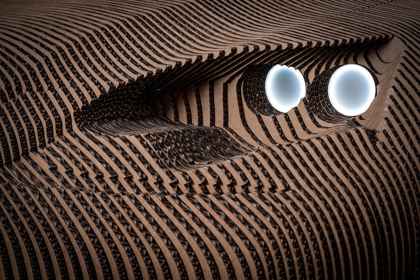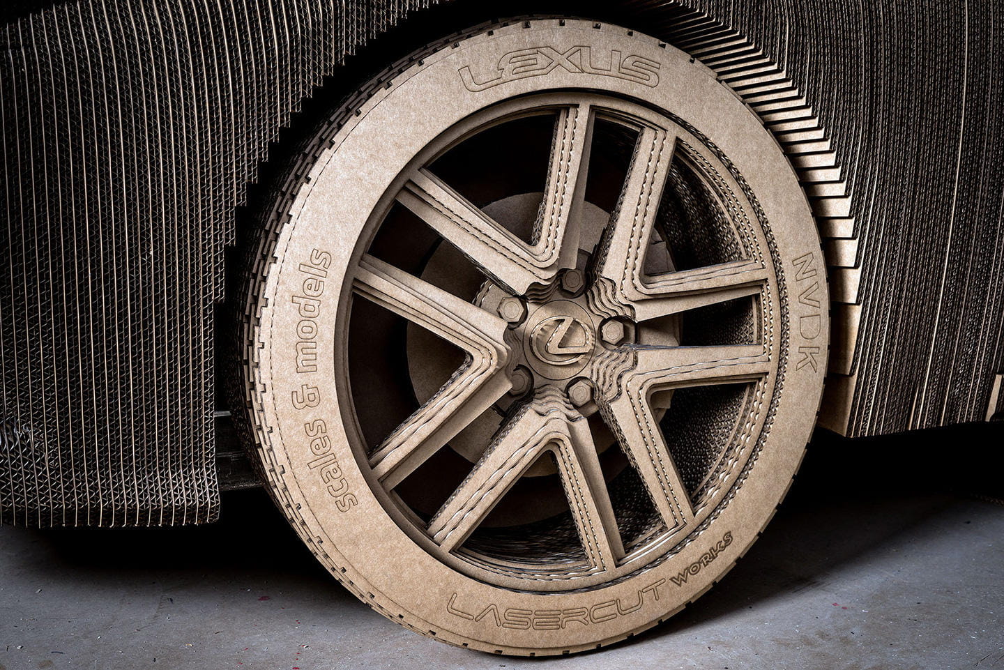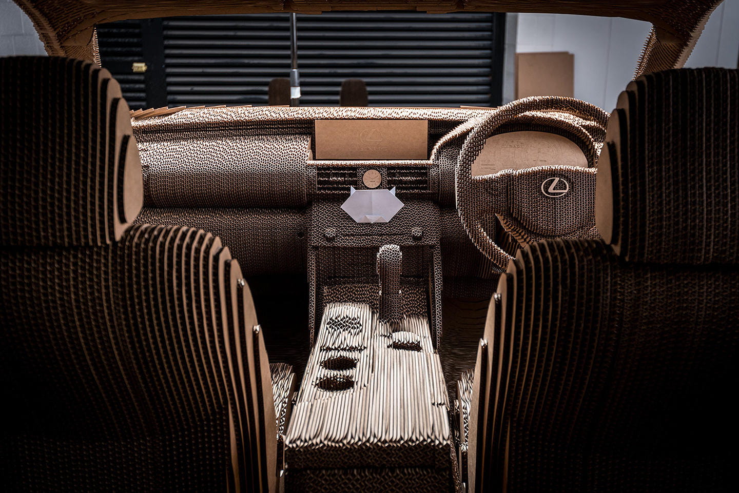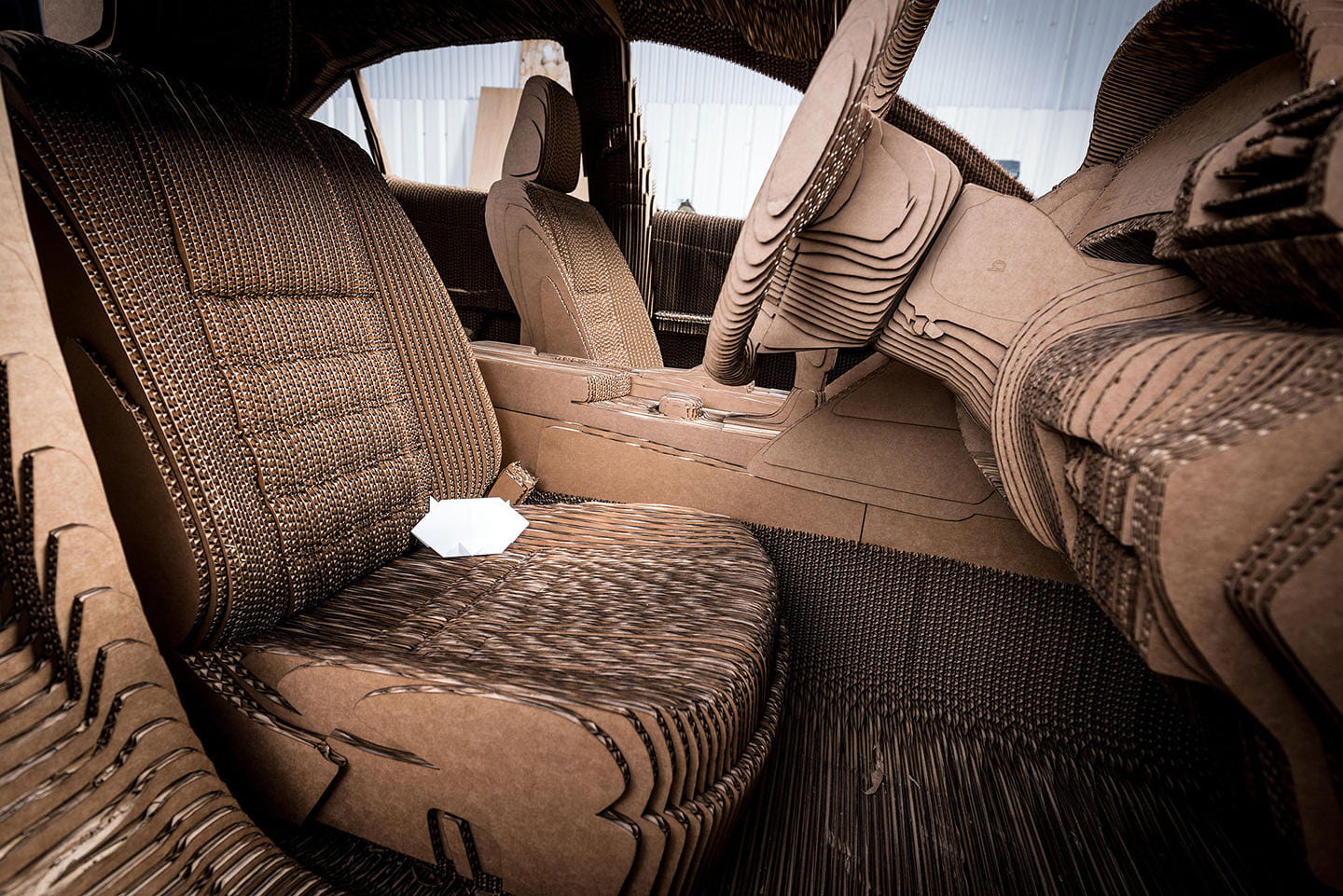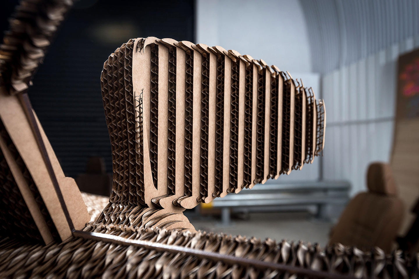 Piensa que este coche, perfectamente recreado, hasta el detalle más insignificante, se compone de 1.700 piezas individuales de cartón. Cada pieza ha sido recreada digitalmente, para conformar una estructura tan compleja como esta empleando láminas de cartón de 10 milímetros. Piezas numeradas para su posterior montaje que, como si de un inmenso puzzle se tratase, sí se produjo completamente a mano.