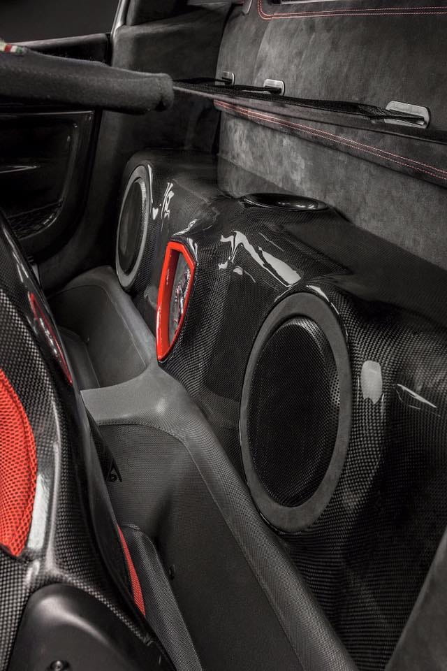 Este sistema de sonido se integra a la perfección tras las plazas traseras en un perfecto envoltorio de fibra de carbono, muy en armonía con el resto del habitáculo donde el mencionado material se reparte por los guarnecidos de las puertas, los asientos, el salpicadero…