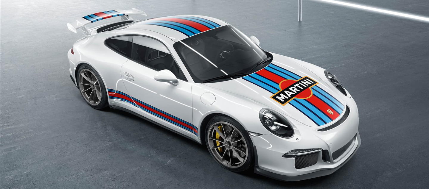 La decoración de Martini Racing es uno de los más emblemáticos “colores de guerra” que puede lucir cualquier coche de carreras que se precie, con permiso de Gulf, una combinación que se torna en mítica si además llega asociada a un Porsche y que además puedes tener en tu Porsche 911 GT3 sin necesidad de salirte del catálogo oficial de extras de Porsche.